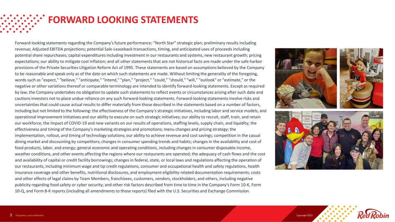 Copyright 20232 Proprietary and confidential FORWARD LOOKING STATEMENTS Forward-looking statements regarding the Company's future performance; “North Star” strategic plan; preliminary results including revenue; Adjusted EBITDA projections; potential Sale-Leaseback transactions, timing, and anticipated uses of proceeds including potential share repurchases; capital expenditures including investment in our restaurants and systems, new restaurant growth; pricing expectations; our ability to mitigate cost inflation; and all other statements that are not historical facts are made under the safe harbor provisions of the Private Securities Litigation Reform Act of 1995. These statements are based on assumptions believed by the Company to be reasonable and speak only as of the date on which such statements are made. Without limiting the generality of the foregoing, words such as "expect," "believe," "anticipate," "intend," "plan," "project," "could," "should," "will," "outlook" or "estimate," or the negative or other variations thereof or comparable terminology are intended to identify forward-looking statements. Except as required by law, the Company undertakes no obligation to update such statements to reflect events or circumstances arising after such date and cautions investors not to place undue reliance on any such forward-looking statements. Forward-looking statements involve risks and uncertainties that could cause actual results to differ materially from those described in the statements based on a number of factors, including but not limited to the following: the effectiveness of the Company's strategic initiatives, including labor and service models, and operational improvement initiatives and our ability to execute on such strategic initiatives; our ability to recruit, staff, train, and retain our workforce; the impact of COVID-19 and new variants on our results of operations, staffing levels, supply chain, and liquidity; the effectiveness and timing of the Company's marketing strategies and promotions; menu changes and pricing strategy; the implementation, rollout, and timing of technology solutions; our ability to achieve revenue and cost savings; competition in the casual dining market and discounting by competitors; changes in consumer spending trends and habits; changes in the availability and cost of food products, labor, and energy; general economic and operating conditions, including changes in consumer disposable income, weather conditions, and other events affecting the regions where our restaurants are operated; the adequacy of cash flows and the cost and availability of capital or credit facility borrowings; changes in federal, state, or local laws and regulations affecting the operation of our restaurants, including minimum wage and tip credit regulations, consumer and occupational health and safety regulations, health insurance coverage and other benefits, nutritional disclosures, and employment eligibility-related documentation requirements; costs and other effects of legal claims by Team Members, franchisees, customers, vendors, stockholders, and others, including negative publicity regarding food safety or cyber security; and other risk factors described from time to time in the Company's Form 10-K, Form 10-Q, and Form 8-K reports (including all amendments to those reports) filed with the U.S. Securities and Exchange Commission.