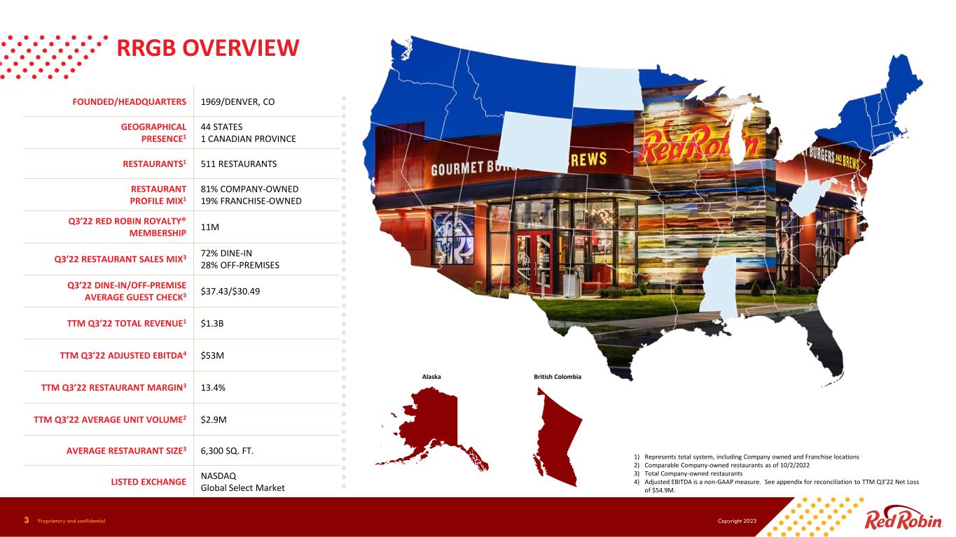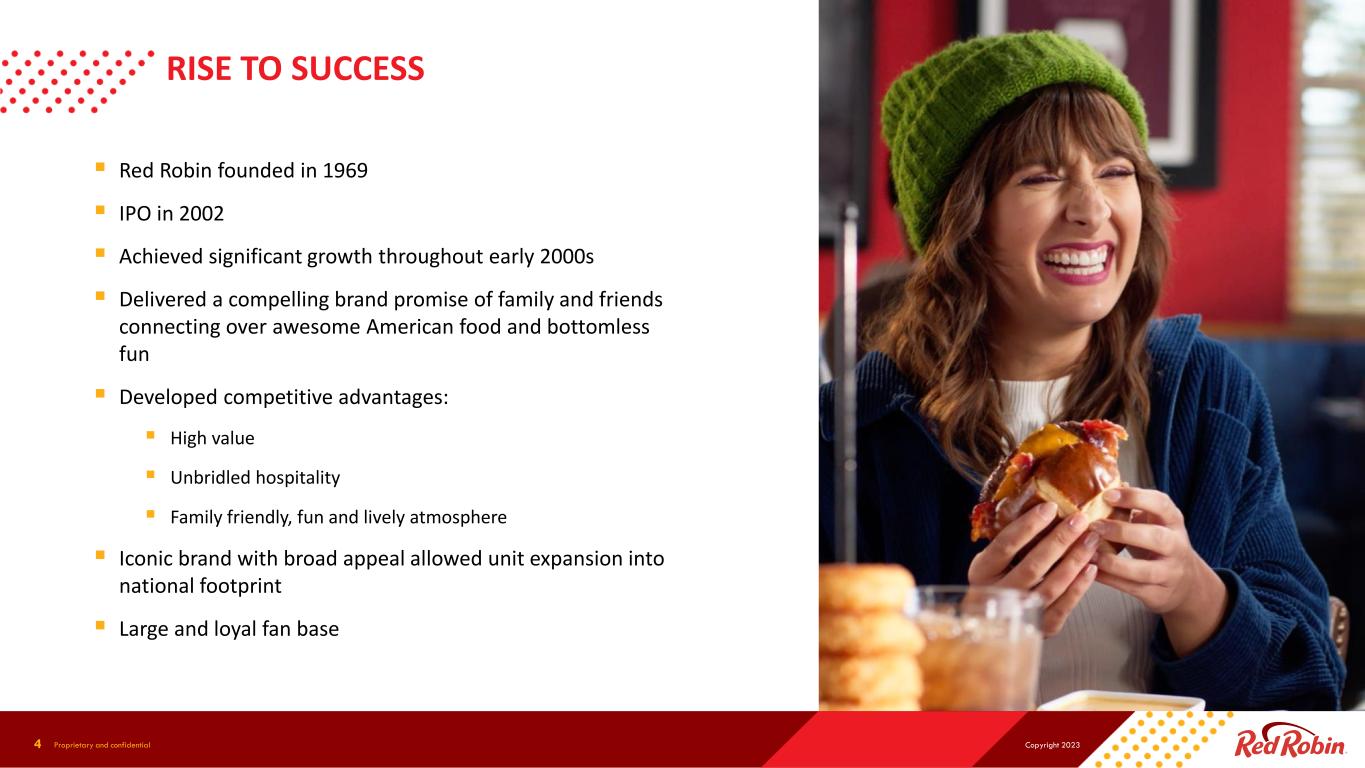 Copyright 20233 Proprietary and confidential RRGB OVERVIEW 1) Represents total system, including Company owned and Franchise locations 2) Comparable Company-owned restaurants as of 10/2/2022 3) Total Company-owned restaurants 4) Adjusted EBITDA is a non-GAAP measure. See appendix for reconciliation to TTM Q3’22 Net Loss of $54.9M. FOUNDED/HEADQUARTERS 1969/DENVER, CO GEOGRAPHICAL PRESENCE1 44 STATES 1 CANADIAN PROVINCE RESTAURANTS1 511 RESTAURANTS RESTAURANT PROFILE MIX1 81% COMPANY-OWNED 19% FRANCHISE-OWNED Q3’22 RED ROBIN ROYALTY® MEMBERSHIP 11M Q3’22 RESTAURANT SALES MIX3 72% DINE-IN 28% OFF-PREMISES Q3’22 DINE-IN/OFF-PREMISE AVERAGE GUEST CHECK3 $37.43/$30.49 TTM Q3’22 TOTAL REVENUE1 $1.3B TTM Q3’22 ADJUSTED EBITDA4 $53M TTM Q3’22 RESTAURANT MARGIN3 13.4% TTM Q3’22 AVERAGE UNIT VOLUME2 $2.9M AVERAGE RESTAURANT SIZE3 6,300 SQ. FT. LISTED EXCHANGE NASDAQ Global Select Market Alaska British Colombia