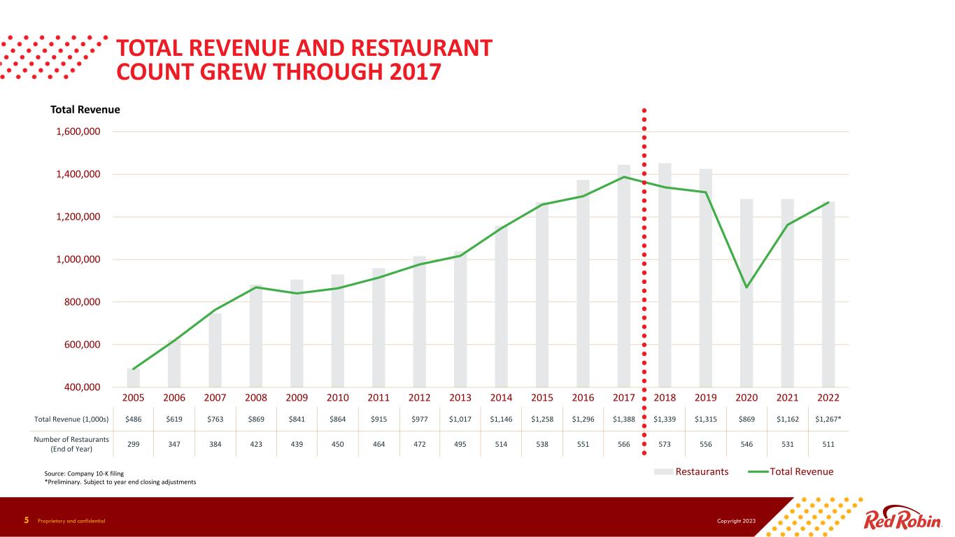 Copyright 20234 Proprietary and confidential RISE TO SUCCESS ▪ Red Robin founded in 1969 ▪ IPO in 2002 ▪ Achieved significant growth throughout early 2000s ▪ Delivered a compelling brand promise of family and friends connecting over awesome American food and bottomless fun ▪ Developed competitive advantages: ▪ High value ▪ Unbridled hospitality ▪ Family friendly, fun and lively atmosphere ▪ Iconic brand with broad appeal allowed unit expansion into national footprint ▪ Large and loyal fan base