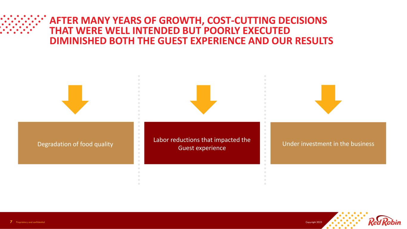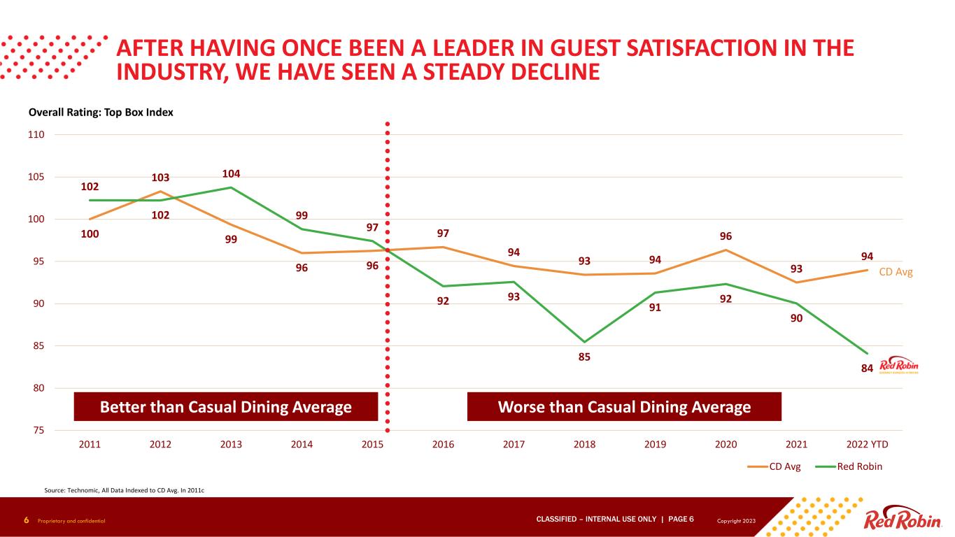 Copyright 20236 Proprietary and confidential CD Avg 100 103 99 96 96 97 94 93 94 96 93 94 102 102 104 99 97 92 93 85 91 92 90 84 75 80 85 90 95 100 105 110 2011 2012 2013 2014 2015 2016 2017 2018 2019 2020 2021 2022 YTD CD Avg Red Robin Overall Rating: Top Box Index Better than Casual Dining Average Worse than Casual Dining Average AFTER HAVING ONCE BEEN A LEADER IN GUEST SATISFACTION IN THE INDUSTRY, WE HAVE SEEN A STEADY DECLINE CLASSIFIED – INTERNAL USE ONLY | PAGE 6 Source: Technomic, All Data Indexed to CD Avg. In 2011c