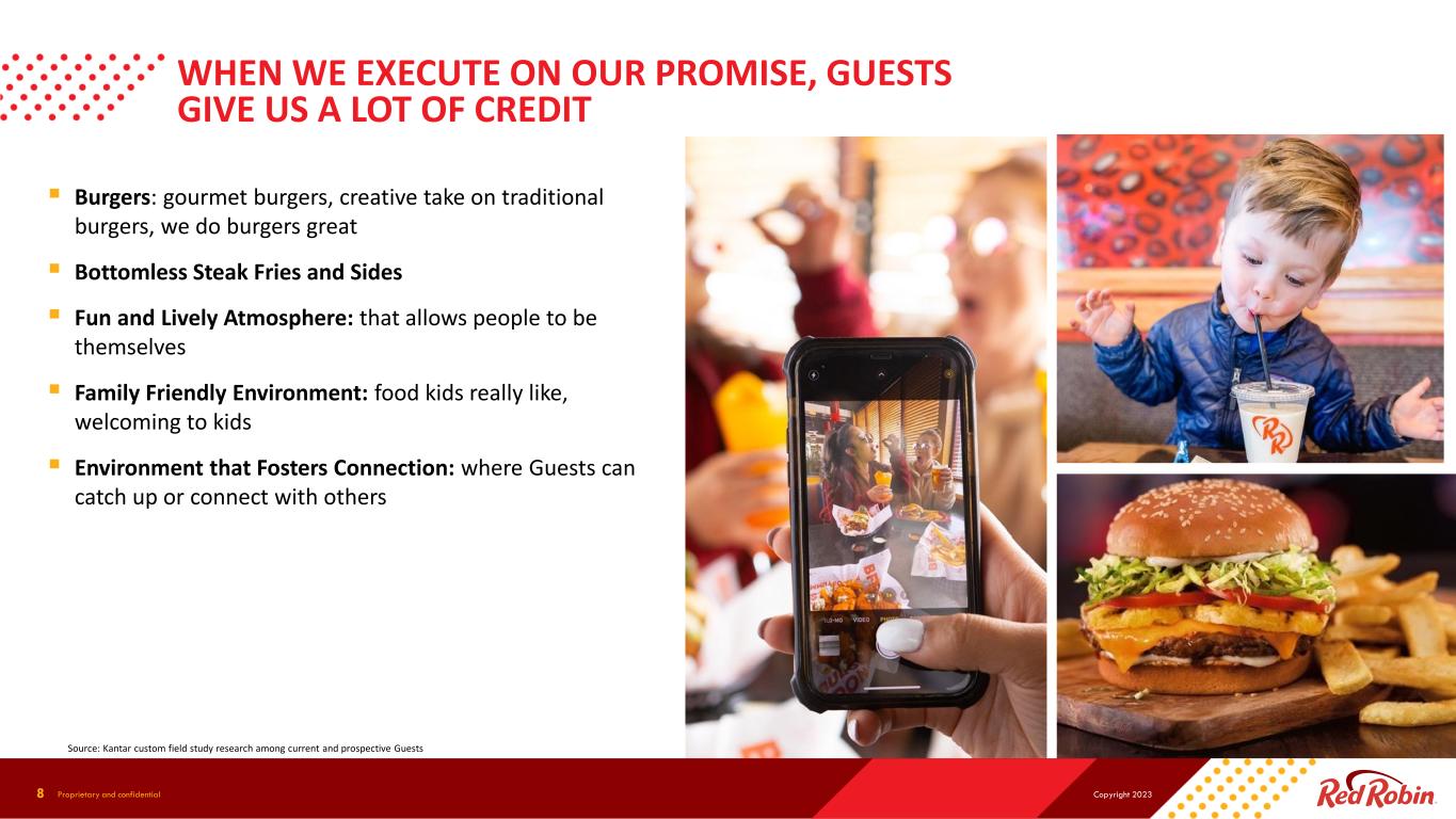 Copyright 20238 Proprietary and confidential WHEN WE EXECUTE ON OUR PROMISE, GUESTS GIVE US A LOT OF CREDIT ▪ Burgers: gourmet burgers, creative take on traditional burgers, we do burgers great ▪ Bottomless Steak Fries and Sides ▪ Fun and Lively Atmosphere: that allows people to be themselves ▪ Family Friendly Environment: food kids really like, welcoming to kids ▪ Environment that Fosters Connection: where Guests can catch up or connect with others Source: Kantar custom field study research among current and prospective Guests