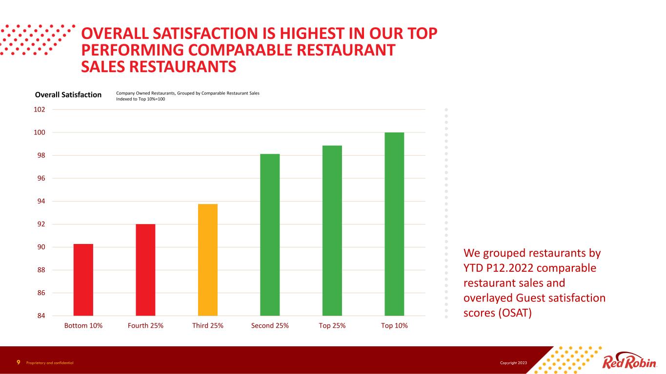 Copyright 20239 Proprietary and confidential OVERALL SATISFACTION IS HIGHEST IN OUR TOP PERFORMING COMPARABLE RESTAURANT SALES RESTAURANTS 84 86 88 90 92 94 96 98 100 102 Bottom 10% Fourth 25% Third 25% Second 25% Top 25% Top 10% Overall Satisfaction Company Owned Restaurants, Grouped by Comparable Restaurant Sales Indexed to Top 10%=100 We grouped restaurants by YTD P12.2022 comparable restaurant sales and overlayed Guest satisfaction scores (OSAT)