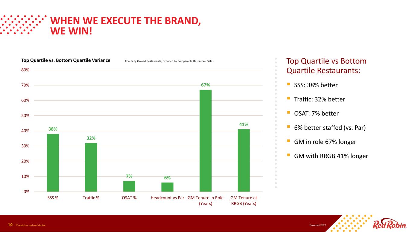 Copyright 202310 Proprietary and confidential 38% 32% 7% 6% 67% 41% 0% 10% 20% 30% 40% 50% 60% 70% 80% SSS % Traffic % OSAT % Headcount vs Par GM Tenure in Role (Years) GM Tenure at RRGB (Years) Top Quartile vs. Bottom Quartile Variance Top Quartile vs Bottom Quartile Restaurants: ▪ SSS: 38% better ▪ Traffic: 32% better ▪ OSAT: 7% better ▪ 6% better staffed (vs. Par) ▪ GM in role 67% longer ▪ GM with RRGB 41% longer Company Owned Restaurants, Grouped by Comparable Restaurant Sales WHEN WE EXECUTE THE BRAND, WE WIN!