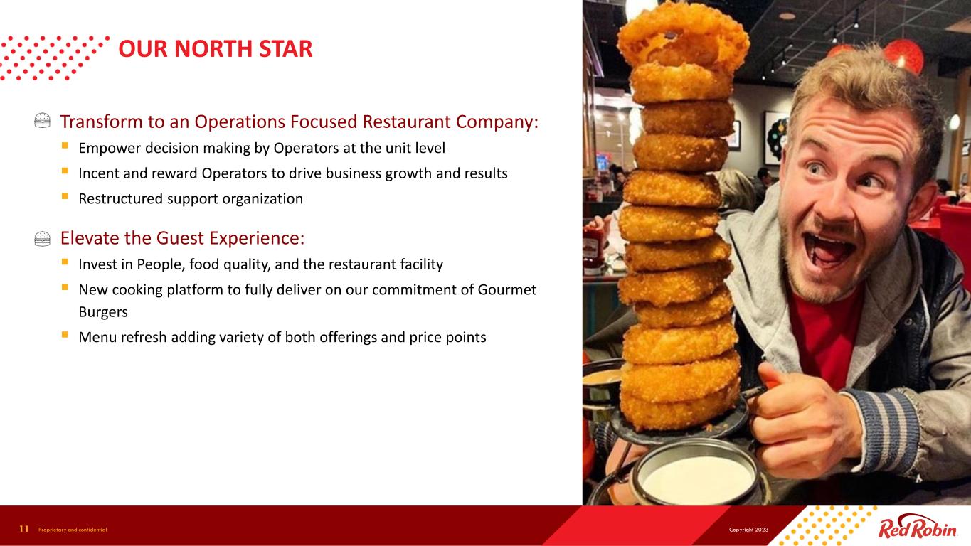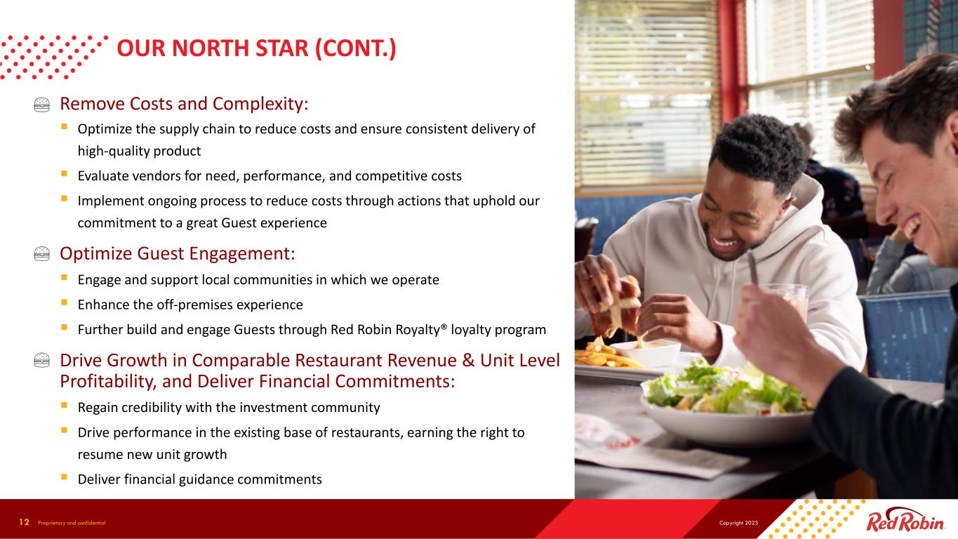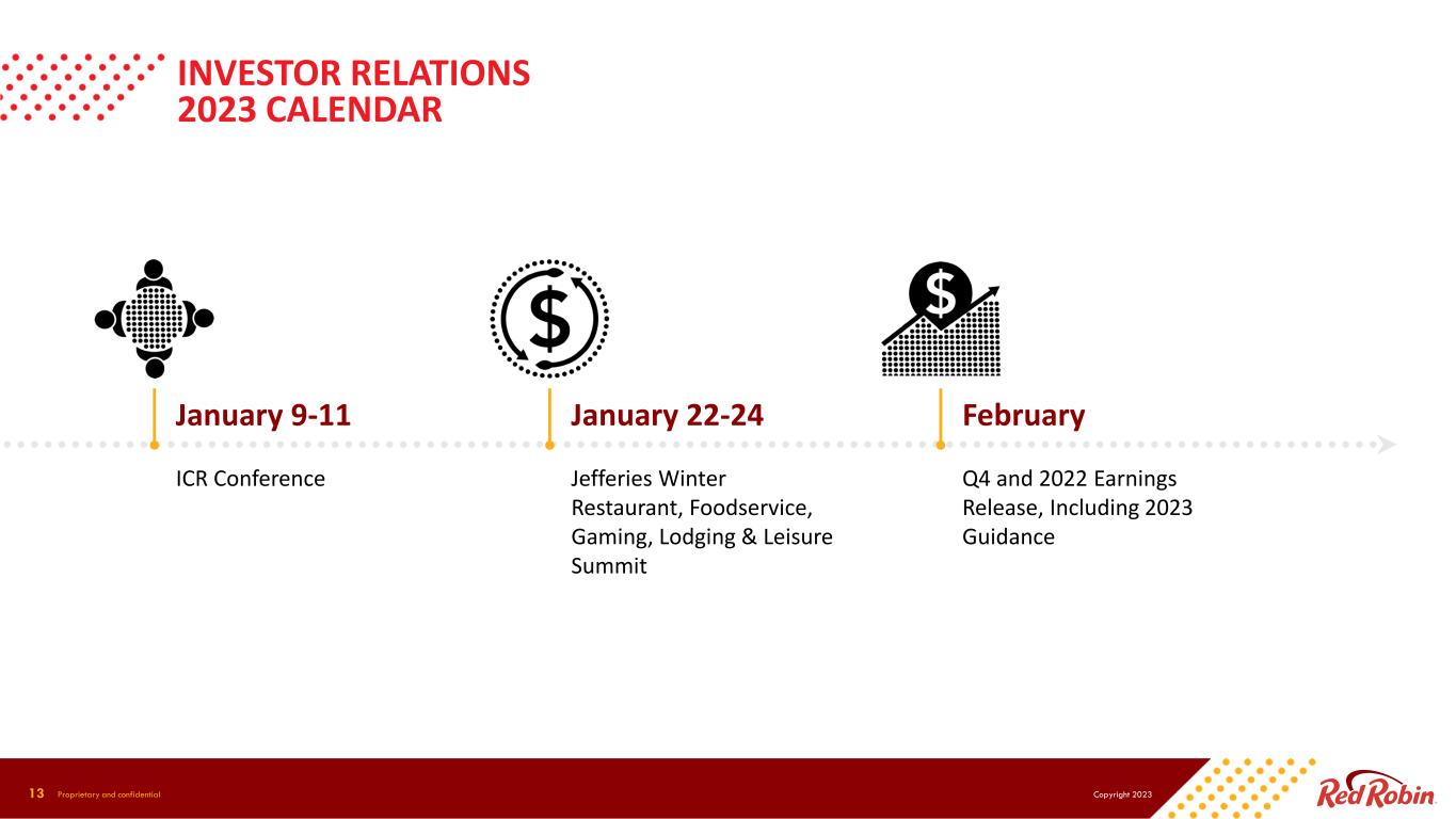 Copyright 202312 Proprietary and confidential OUR NORTH STAR (CONT.) Remove Costs and Complexity: ▪ Optimize the supply chain to reduce costs and ensure consistent delivery of high-quality product ▪ Evaluate vendors for need, performance, and competitive costs ▪ Implement ongoing process to reduce costs through actions that uphold our commitment to a great Guest experience Optimize Guest Engagement: ▪ Engage and support local communities in which we operate ▪ Enhance the off-premises experience ▪ Further build and engage Guests through Red Robin Royalty® loyalty program Drive Growth in Comparable Restaurant Revenue & Unit Level Profitability, and Deliver Financial Commitments: ▪ Regain credibility with the investment community ▪ Drive performance in the existing base of restaurants, earning the right to resume new unit growth ▪ Deliver financial guidance commitments