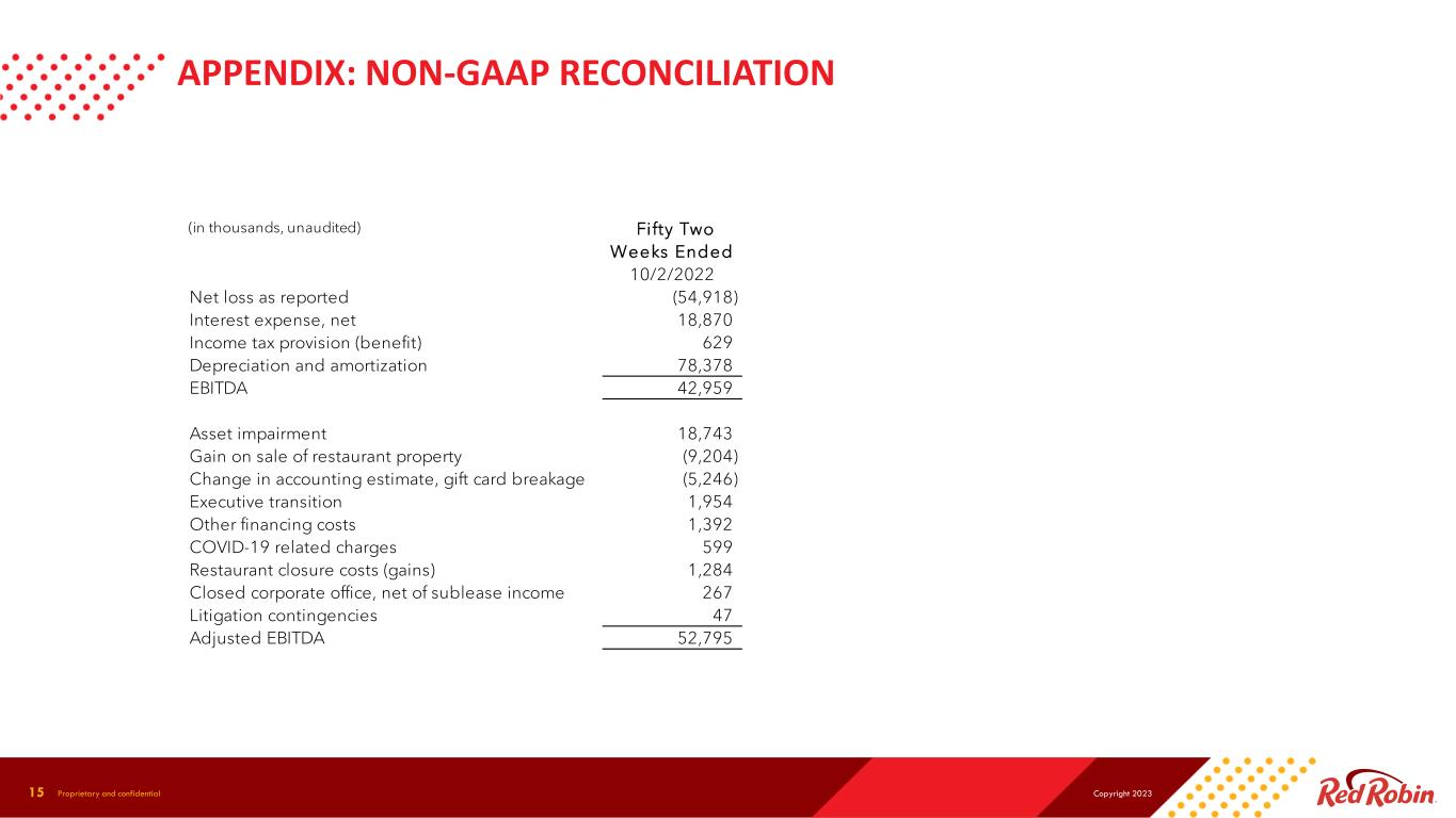 Copyright 202315 Proprietary and confidential APPENDIX: NON-GAAP RECONCILIATION (in thousands, unaudited) Fifty Two Weeks Ended 10/2/2022 Net loss as reported (54,918) Interest expense, net 18,870 Income tax provision (benefit) 629 Depreciation and amortization 78,378 EBITDA 42,959 Asset impairment 18,743 Gain on sale of restaurant property (9,204) Change in accounting estimate, gift card breakage (5,246) Executive transition 1,954 Other financing costs 1,392 COVID-19 related charges 599 Restaurant closure costs (gains) 1,284 Closed corporate office, net of sublease income 267 Litigation contingencies 47 Adjusted EBITDA 52,795