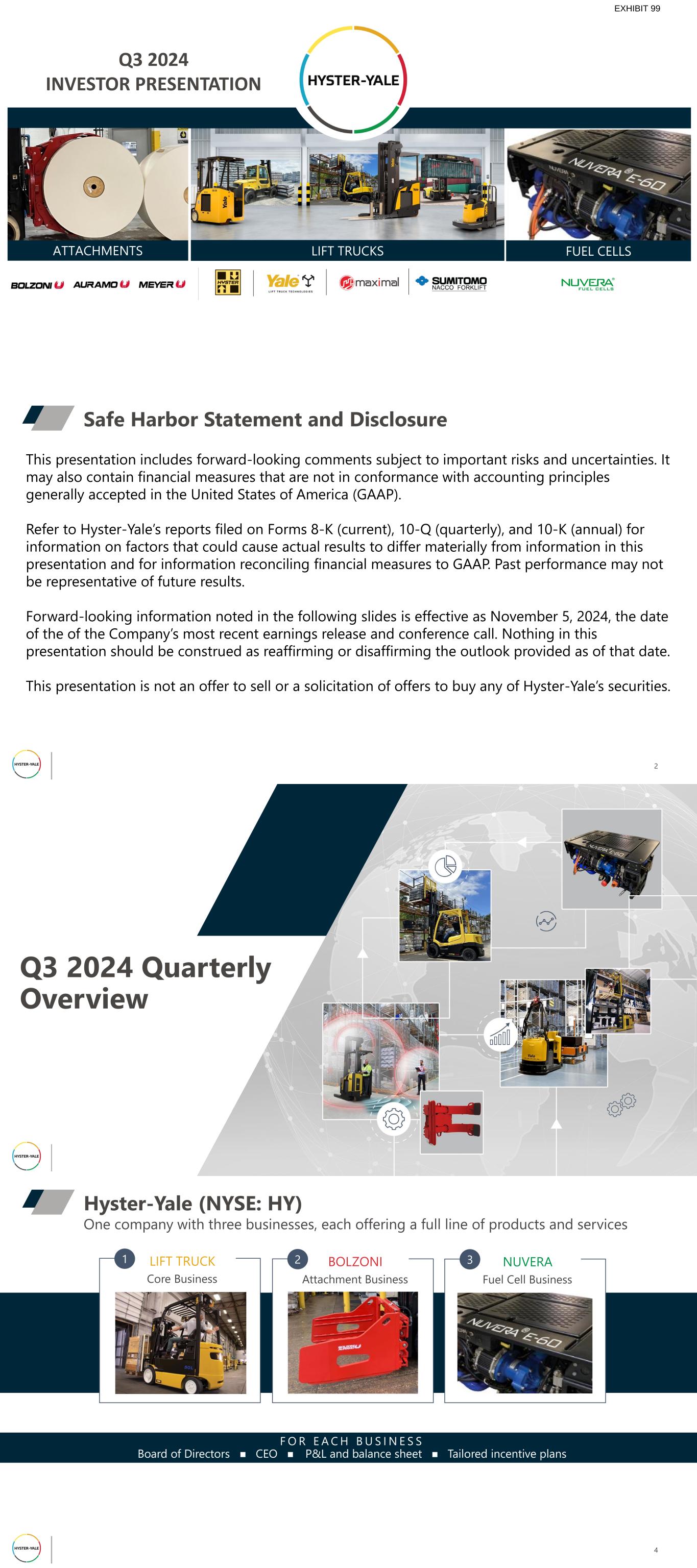 Q3 2024 INVESTOR PRESENTATION LIFT TRUCKS FUEL CELLSATTACHMENTS EXHIBIT 99 This presentation includes forward-looking comments subject to important risks and uncertainties. It may also contain financial measures that are not in conformance with accounting principles generally accepted in the United States of America (GAAP). Refer to Hyster-Yale’s reports filed on Forms 8-K (current), 10-Q (quarterly), and 10-K (annual) for information on factors that could cause actual results to differ materially from information in this presentation and for information reconciling financial measures to GAAP. Past performance may not be representative of future results. Forward-looking information noted in the following slides is effective as November 5, 2024, the date of the of the Company’s most recent earnings release and conference call. Nothing in this presentation should be construed as reaffirming or disaffirming the outlook provided as of that date. This presentation is not an offer to sell or a solicitation of offers to buy any of Hyster-Yale’s securities. Safe Harbor Statement and Disclosure 2 Q3 2024 Quarterly Overview 4 One company with three businesses, each offering a full line of products and services Hyster-Yale (NYSE: HY) LIFT TRUCK Core Business 1 BOLZONI Attachment Business 2 NUVERA Fuel Cell Business 3 F O R E A C H B U S I N E S S Board of Directors n CEO n P&L and balance sheet n Tailored incentive plans