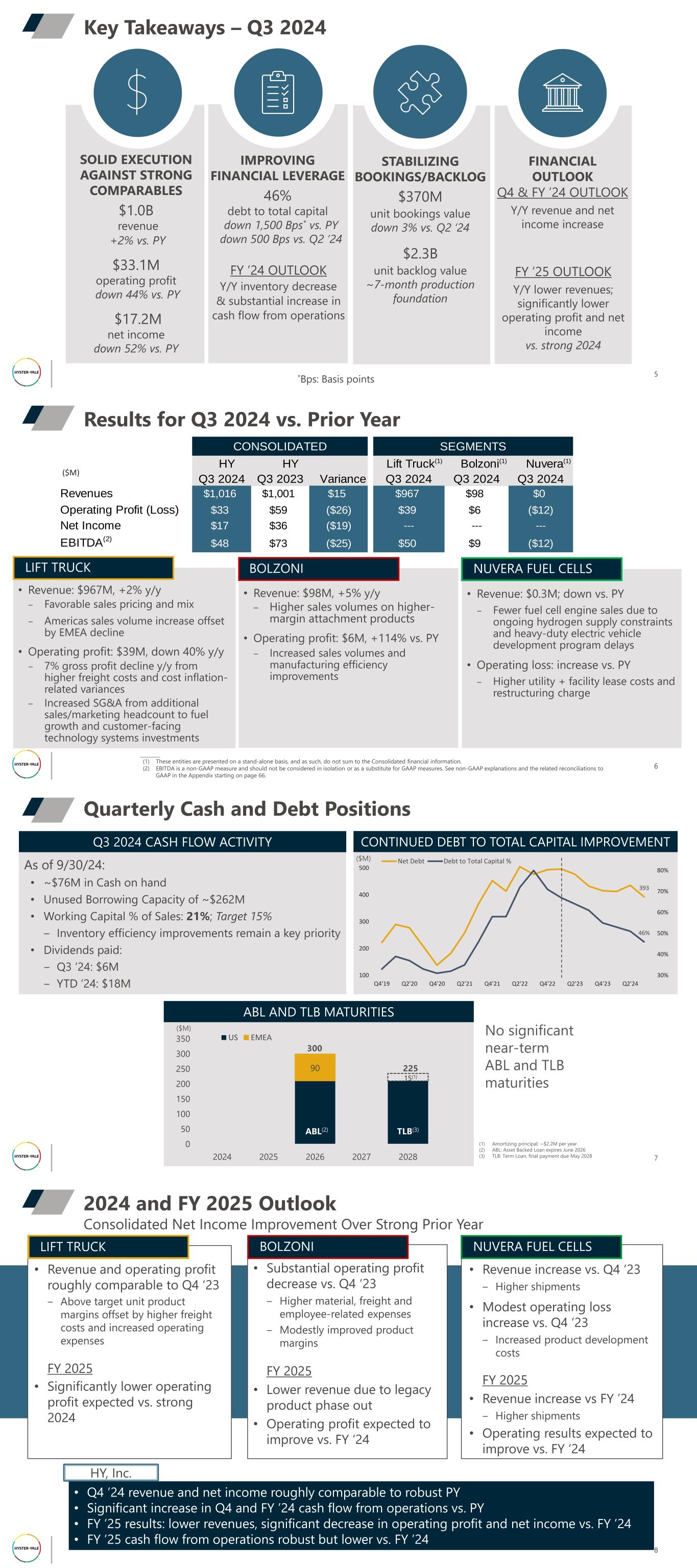 Key Takeaways – Q3 2024 5 FINANCIAL OUTLOOK Q4 & FY ’24 OUTLOOK Y/Y revenue and net income increase IMPROVING FINANCIAL LEVERAGE 46% debt to total capital down 1,500 Bps* vs. PY down 500 Bps vs. Q2 ’24 STABILIZING BOOKINGS/BACKLOG $370M unit bookings value down 3% vs. Q2 ‘24 $2.3B unit backlog value ~7-month production foundation SOLID EXECUTION AGAINST STRONG COMPARABLES $1.0B revenue +2% vs. PY $33.1M operating profit down 44% vs. PY $17.2M net income down 52% vs. PY *Bps: Basis points FY ’25 OUTLOOK Y/Y lower revenues; significantly lower operating profit and net income vs. strong 2024 FY ’24 OUTLOOK Y/Y inventory decrease & substantial increase in cash flow from operations HY HY Lift Truck(1) Bolzoni(1) Nuvera(1) Q3 2024 Q3 2023 Variance Q3 2024 Q3 2024 Q3 2024 Revenues $1,016 $1,001 $15 $967 $98 $0 Operating Profit (Loss) $33 $59 ($26) $39 $6 ($12)0 Net Income $17 $36 ($19) --- --- ---$0 EBITDA(2) $48 $73 ($25) $50 $9 ($12) SEGMENTSCONSOLIDATED ($M) Results for Q3 2024 vs. Prior Year 6 ________ (1) These entities are presented on a stand-alone basis, and as such, do not sum to the Consolidated financial information. (2) EBITDA is a non-GAAP measure and should not be considered in isolation or as a substitute for GAAP measures. See non-GAAP explanations and the related reconciliations to GAAP in the Appendix starting on page 66. • Revenue: $967M, +2% y/y ‒ Favorable sales pricing and mix ‒ Americas sales volume increase offset by EMEA decline • Operating profit: $39M, down 40% y/y ‒ 7% gross profit decline y/y from higher freight costs and cost inflation- related variances ‒ Increased SG&A from additional sales/marketing headcount to fuel growth and customer-facing technology systems investments LIFT TRUCK • Revenue: $98M, +5% y/y ‒ Higher sales volumes on higher- margin attachment products • Operating profit: $6M, +114% vs. PY ‒ Increased sales volumes and manufacturing efficiency improvements BOLZONI • Revenue: $0.3M; down vs. PY ‒ Fewer fuel cell engine sales due to ongoing hydrogen supply constraints and heavy-duty electric vehicle development program delays • Operating loss: increase vs. PY ‒ Higher utility + facility lease costs and restructuring charge NUVERA FUEL CELLS Quarterly Cash and Debt Positions 7 As of 9/30/24: • ~$76M in Cash on hand • Unused Borrowing Capacity of ~$262M • Working Capital % of Sales: 21%; Target 15% ‒ Inventory efficiency improvements remain a key priority • Dividends paid: ‒ Q3 ’24: $6M ‒ YTD ’24: $18M Q3 2024 CASH FLOW ACTIVITY 393 46% 30% 40% 50% 60% 70% 80% 100 200 300 400 500 Q4'19 Q2'20 Q4'20 Q2'21 Q4'21 Q2'22 Q4'22 Q2'23 Q4'23 Q2'24 Net Debt Debt to Total Capital % CONTINUED DEBT TO TOTAL CAPITAL IMPROVEMENT ($M) 90 0 50 100 150 200 250 300 350 2024 2025 2026 2027 2028 US EMEA ABL AND TLB MATURITIES 300 225 15(1) ABL(2) TLB(3) ($M) (1) Amortizing principal: ~$2.2M per year (2) ABL: Asset Backed Loan expires June 2026 (3) TLB: Term Loan, final payment due May 2028 No significant near-term ABL and TLB maturities • Q4 ’24 revenue and net income roughly comparable to robust PY • Significant increase in Q4 and FY ’24 cash flow from operations vs. PY • FY ’25 results: lower revenues, significant decrease in operating profit and net income vs. FY ’24 • FY ’25 cash flow from operations robust but lower vs. FY ’24 8 Consolidated Net Income Improvement Over Strong Prior Year 2024 and FY 2025 Outlook • Substantial operating profit decrease vs. Q4 ‘23 ‒ Higher material, freight and employee-related expenses ‒ Modestly improved product margins FY 2025 • Lower revenue due to legacy product phase out • Operating profit expected to improve vs. FY ‘24 • Revenue and operating profit roughly comparable to Q4 ‘23 ‒ Above target unit product margins offset by higher freight costs and increased operating expenses FY 2025 • Significantly lower operating profit expected vs. strong 2024 LIFT TRUCK BOLZONI NUVERA FUEL CELLS HY, Inc. • Revenue increase vs. Q4 ‘23 ‒ Higher shipments • Modest operating loss increase vs. Q4 ‘23 ‒ Increased product development costs FY 2025 • Revenue increase vs FY ’24 ‒ Higher shipments • Operating results expected to improve vs. FY ‘24