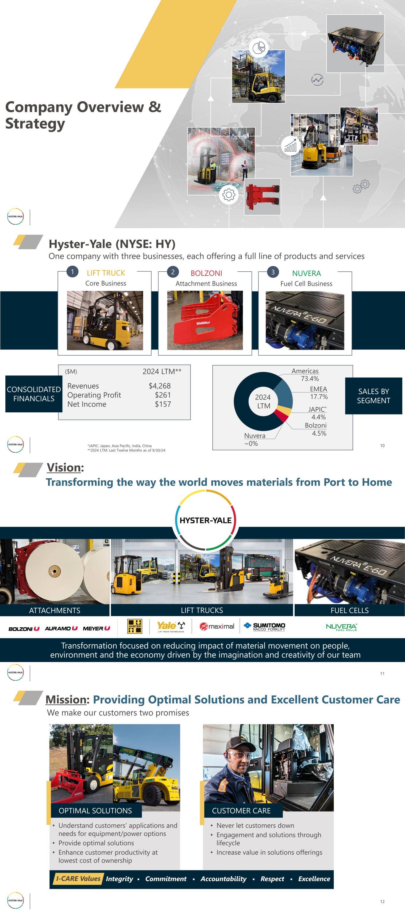 Company Overview & Strategy Image Placeholder Use same image as slide 1; blend of all brands/solutions 10 One company with three businesses, each offering a full line of products and services Hyster-Yale (NYSE: HY) LIFT TRUCK Core Business 1 BOLZONI Attachment Business 2 Revenues $4,268 Operating Profit $261 Net Income $157 EMEA 17.7% JAPIC* 4.4% Americas 73.4% Bolzoni 4.5% NUVERA Fuel Cell Business 3 CONSOLIDATED FINANCIALS SALES BY SEGMENT2024 LTM *JAPIC: Japan, Asia Pacific, India, China **2024 LTM: Last Twelve Months as of 9/30/24 ($M) 2024 LTM** ~0% Nuvera 11 Vision: LIFT TRUCKS FUEL CELLSATTACHMENTS Transformation focused on reducing impact of material movement on people, environment and the economy driven by the imagination and creativity of our team Transforming the way the world moves materials from Port to Home We make our customers two promises Mission: Providing Optimal Solutions and Excellent Customer Care 12 • Understand customers’ applications and needs for equipment/power options • Provide optimal solutions • Enhance customer productivity at lowest cost of ownership OPTIMAL SOLUTIONS • Never let customers down • Engagement and solutions through lifecycle • Increase value in solutions offerings CUSTOMER CARE Integrity • Commitment • Accountability • Respect • ExcellenceI-CARE Values