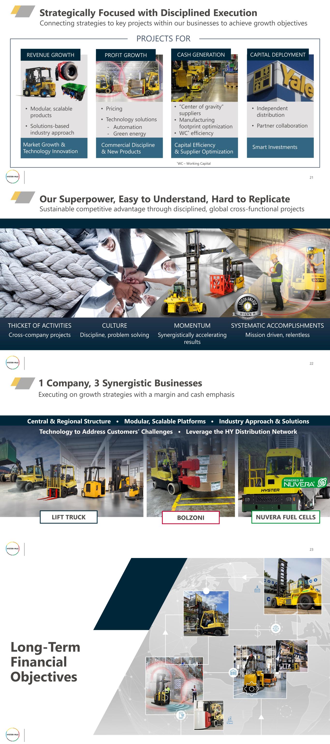 Commercial Discipline & New Products • Pricing • Technology solutions - Automation - Green energy REVENUE GROWTH Market Growth & Technology Innovation • Modular, scalable products • Solutions-based industry approach 21 Strategically Focused with Disciplined Execution Capital Efficiency & Supplier Optimization • “Center of gravity” suppliers • Manufacturing footprint optimization • WC* efficiency Smart Investments • Independent distribution • Partner collaboration PROFIT GROWTH CAPITAL DEPLOYMENTCASH GENERATION Connecting strategies to key projects within our businesses to achieve growth objectives PROJECTS FOR *WC – Working Capital 22 Sustainable competitive advantage through disciplined, global cross-functional projects Our Superpower, Easy to Understand, Hard to Replicate THICKET OF ACTIVITIES Cross-company projects CULTURE Discipline, problem solving MOMENTUM Synergistically accelerating results SYSTEMATIC ACCOMPLISHMENTS Mission driven, relentless BOLZONI NUVERA FUEL CELLSLIFT TRUCK 23 Central & Regional Structure • Modular, Scalable Platforms • Industry Approach & Solutions Technology to Address Customers’ Challenges • Leverage the HY Distribution Network 1 Company, 3 Synergistic Businesses Executing on growth strategies with a margin and cash emphasis Long-Term Financial Objectives