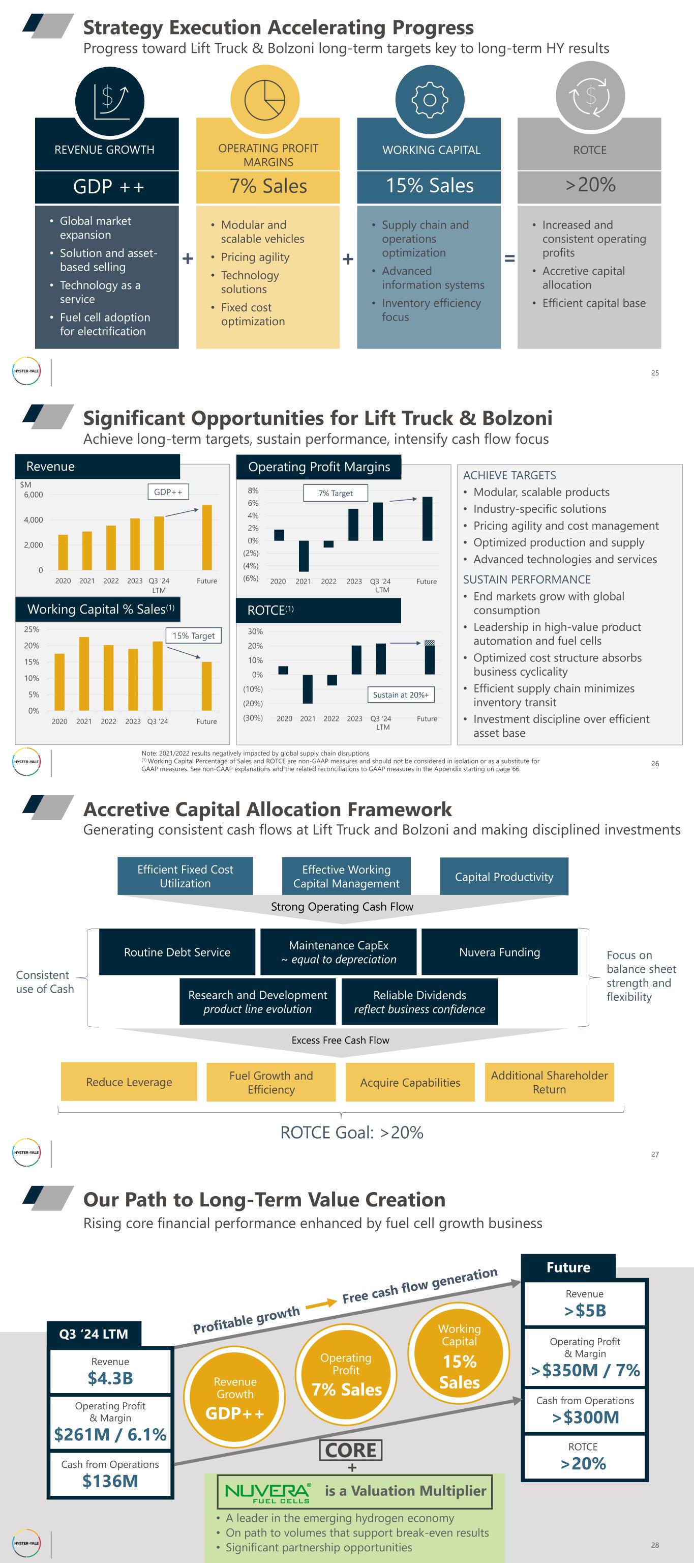 REVENUE GROWTH GDP ++ • Global market expansion • Solution and asset- based selling • Technology as a service • Fuel cell adoption for electrification OPERATING PROFIT MARGINS 7% Sales • Modular and scalable vehicles • Pricing agility • Technology solutions • Fixed cost optimization WORKING CAPITAL 15% Sales • Supply chain and operations optimization • Advanced information systems • Inventory efficiency focus ROTCE >20% • Increased and consistent operating profits • Accretive capital allocation • Efficient capital base 25 Progress toward Lift Truck & Bolzoni long-term targets key to long-term HY results Strategy Execution Accelerating Progress + + = 26 Achieve long-term targets, sustain performance, intensify cash flow focus Significant Opportunities for Lift Truck & Bolzoni Revenue Working Capital % Sales(1) Operating Profit Margins ROTCE(1) ACHIEVE TARGETS • Modular, scalable products • Industry-specific solutions • Pricing agility and cost management • Optimized production and supply • Advanced technologies and services SUSTAIN PERFORMANCE • End markets grow with global consumption • Leadership in high-value product automation and fuel cells • Optimized cost structure absorbs business cyclicality • Efficient supply chain minimizes inventory transit • Investment discipline over efficient asset base 0 2,000 4,000 6,000 2020 2021 2022 2023 Q3 '24 LTM Future GDP++ $M (6%) (4%) (2%) 0% 2% 4% 6% 8% 7% Target (30%) (20%) (10%) 0% 10% 20% 30% Sustain at 20%+ Note: 2021/2022 results negatively impacted by global supply chain disruptions (1) Working Capital Percentage of Sales and ROTCE are non-GAAP measures and should not be considered in isolation or as a substitute for GAAP measures. See non-GAAP explanations and the related reconciliations to GAAP measures in the Appendix starting on page 66. 2020 2021 2022 2023 Q3 ‘24 Future LTM 2020 2021 2022 2023 Q3 ‘24 Future LTM 0% 5% 10% 15% 20% 25% 2020 2021 2022 2023 Q3 '24 Future 15% Target 27 Generating consistent cash flows at Lift Truck and Bolzoni and making disciplined investments Accretive Capital Allocation Framework Efficient Fixed Cost Utilization Effective Working Capital Management Capital Productivity Reduce Leverage Fuel Growth and Efficiency Acquire Capabilities Routine Debt Service Maintenance CapEx ~ equal to depreciation Research and Development product line evolution Reliable Dividends reflect business confidence Strong Operating Cash Flow Excess Free Cash Flow Consistent use of Cash Focus on balance sheet strength and flexibility ROTCE Goal: >20% Additional Shareholder Return Nuvera Funding Rising core financial performance enhanced by fuel cell growth business Our Path to Long-Term Value Creation Operating Profit & Margin $261M / 6.1% Revenue $4.3B Cash from Operations $136M Q3 ‘24 LTM Operating Profit & Margin >$350M / 7% Revenue >$5B Cash from Operations >$300M Future ROTCE >20% Revenue Growth GDP++ Operating Profit 7% Sales Working Capital 15% Sales is a Valuation Multiplier • A leader in the emerging hydrogen economy • On path to volumes that support break-even results • Significant partnership opportunities 28 CORE +