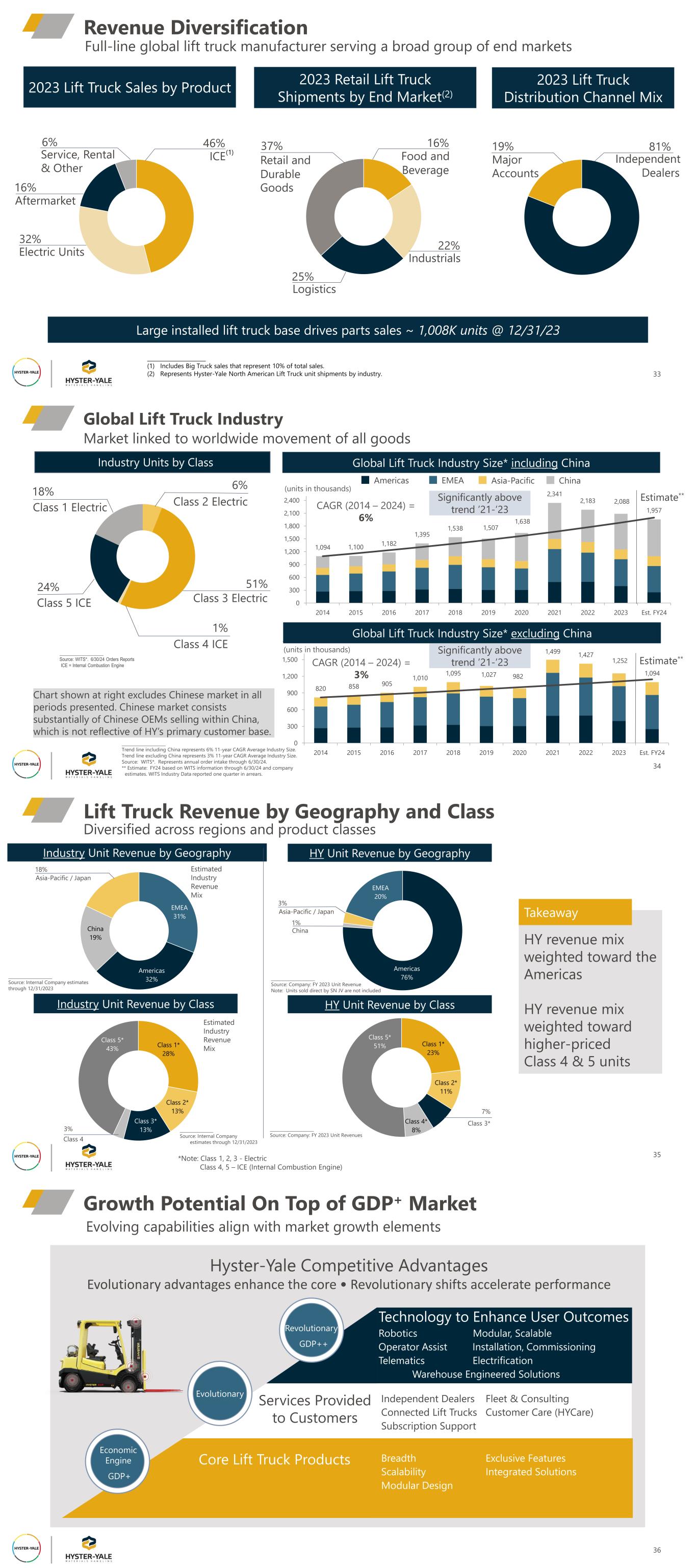 Industrials 22% Full-line global lift truck manufacturer serving a broad group of end markets 16% Service, Rental & Other Electric Units Aftermarket 6% Independent Dealers 33 Revenue Diversification 2023 Lift Truck Sales by Product _____________________ (1) Includes Big Truck sales that represent 10% of total sales. (2) Represents Hyster-Yale North American Lift Truck unit shipments by industry. 2023 Retail Lift Truck Shipments by End Market(2) (1) 2023 Lift Truck Distribution Channel Mix 81%19% Major Accounts Food and Beverage 16%37% Retail and Durable Goods Logistics 25% ICE 46% 32% Large installed lift truck base drives parts sales ~ 1,008K units @ 12/31/23 1,094 1,100 1,182 1,395 1,538 1,507 1,638 2,341 2,183 2,088 1,957 0 300 600 900 1,200 1,500 1,800 2,100 2,400 2014 2015 2016 2017 2018 2019 2020 2021 2022 2023 Est. FY24 CAGR (2014 – 2024) = 6% (units in thousands) Global Lift Truck Industry Size* including China _____________________ Trend line including China represents 6% 11-year CAGR Average Industry Size. Trend line excluding China represents 3% 11-year CAGR Average Industry Size. Source: WITS*. Represents annual order intake through 6/30/24. ** Estimate: FY24 based on WITS information through 6/30/24 and company estimates. WITS Industry Data reported one quarter in arrears. Market linked to worldwide movement of all goods Global Lift Truck Industry Industry Units by Class 18% Class 1 Electric 6% Class 2 Electric 51% Class 3 Electric 1% Class 4 ICE Class 5 ICE 24% _____________________ Source: WITS*. 6/30/24 Orders Reports ICE = Internal Combustion Engine Americas EMEA Asia-Pacific China 34 Estimate** 820 858 905 1,010 1,095 1,027 982 1,499 1,427 1,252 1,094 0 300 600 900 1,200 1,500 1,800 2014 2015 2016 2017 2018 2019 2020 2021 2022 2023 Est. FY24 Global Lift Truck Industry Size* excluding China Estimate** (units in thousands) CAGR (2014 – 2024) = 3% Chart shown at right excludes Chinese market in all periods presented. Chinese market consists substantially of Chinese OEMs selling within China, which is not reflective of HY’s primary customer base. Significantly above trend ’21-’23 Significantly above trend ’21-’23 Class 1* 23% Class 2* 11% Class 4* 8% Class 5* 51% _____________________ Source: Company: FY 2023 Unit Revenues Class 1* 28% Class 2* 13% Class 3* 13% Class 5* 43% EMEA 31% Americas 32% China 19% Estimated Industry Revenue Mix Diversified across regions and product classes Lift Truck Revenue by Geography and Class Industry Unit Revenue by Geography _____________________ Source: Internal Company estimates through 12/31/2023 ________________ Source: Internal Company estimates through 12/31/2023 HY Unit Revenue by ClassIndustry Unit Revenue by Class Estimated Industry Revenue Mix HY revenue mix weighted toward the Americas HY revenue mix weighted toward higher-priced Class 4 & 5 units 35 Americas 76% EMEA 20% *Note: Class 1, 2, 3 - Electric Class 4, 5 – ICE (Internal Combustion Engine) Takeaway 18% Asia-Pacific / Japan Class 4 3% 7% Class 3* HY Unit Revenue by Geography _____________________ Source: Company: FY 2023 Unit Revenue Note: Units sold direct by SN JV are not included China 1% 3% Asia-Pacific / Japan 36 Growth Potential On Top of GDP+ Market Robotics Modular, Scalable Operator Assist Installation, Commissioning Telematics Electrification Warehouse Engineered Solutions Independent Dealers Fleet & Consulting Connected Lift Trucks Customer Care (HYCare) Subscription Support Breadth Exclusive Features Scalability Integrated Solutions Modular Design Hyster-Yale Competitive Advantages Evolutionary advantages enhance the core • Revolutionary shifts accelerate performance Evolving capabilities align with market growth elements Lift Trucks (Core Products) Economic Engine GDP+ Revolutionary GDP++ Core Lift Truck Products Technology to Enhance User Outcomes Services Provided to Customers Evolutionary