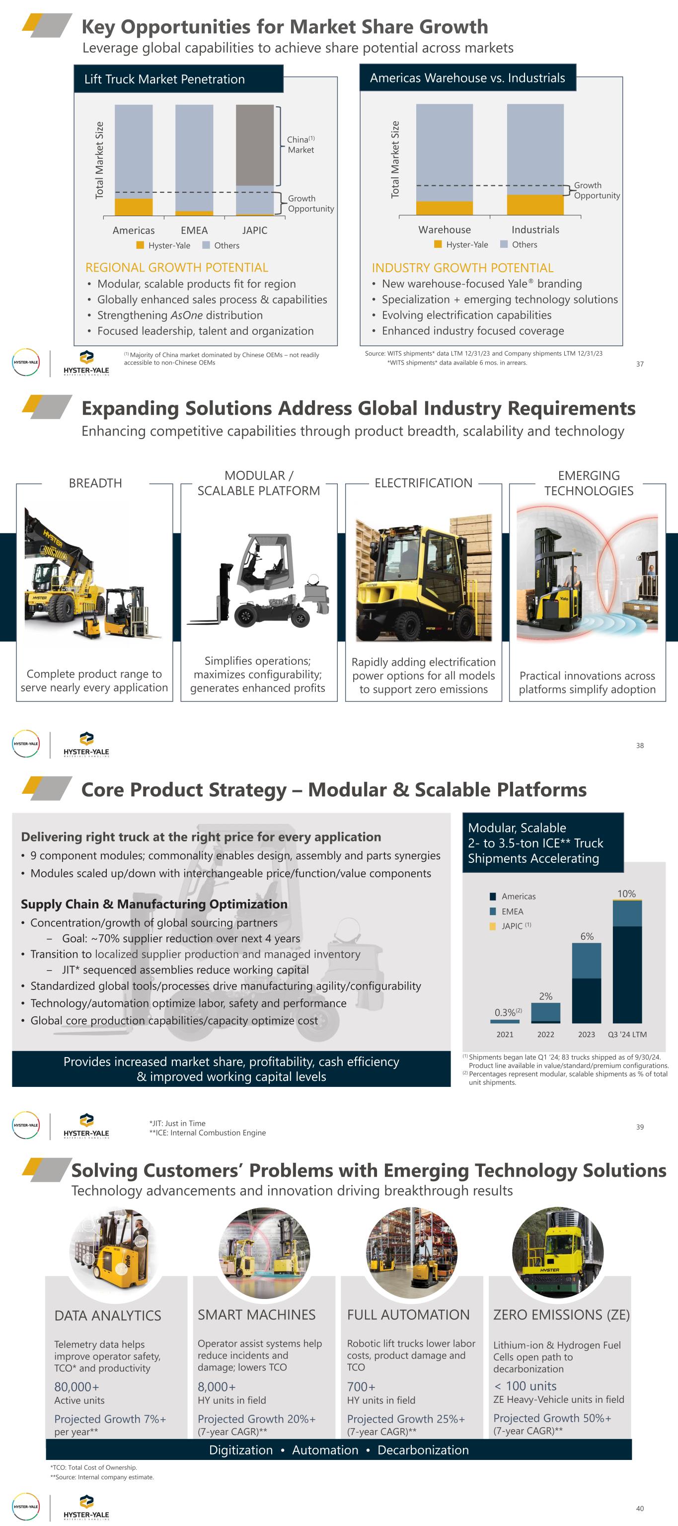 Americas Warehouse vs. IndustrialsLift Truck Market Penetration Key Opportunities for Market Share Growth 37 Americas EMEA JAPIC To ta l M ar ke t Si ze Growth Opportunity • Modular, scalable products fit for region • Globally enhanced sales process & capabilities • Strengthening AsOne distribution • Focused leadership, talent and organization REGIONAL GROWTH POTENTIAL • New warehouse-focused Yale® branding • Specialization + emerging technology solutions • Evolving electrification capabilities • Enhanced industry focused coverage INDUSTRY GROWTH POTENTIAL Warehouse Industrials To ta l M ar ke t Si ze Hyster-Yale Others Hyster-Yale Others Leverage global capabilities to achieve share potential across markets (1) Majority of China market dominated by Chinese OEMs – not readily accessible to non-Chinese OEMs China(1) Market Growth Opportunity Source: WITS shipments* data LTM 12/31/23 and Company shipments LTM 12/31/23 *WITS shipments* data available 6 mos. in arrears. 38 Expanding Solutions Address Global Industry Requirements Enhancing competitive capabilities through product breadth, scalability and technology MODULAR / SCALABLE PLATFORM BREADTH Simplifies operations; maximizes configurability; generates enhanced profits Complete product range to serve nearly every application EMERGING TECHNOLOGIES Practical innovations across platforms simplify adoption Image ELECTRIFICATION Rapidly adding electrification power options for all models to support zero emissions Delivering right truck at the right price for every application • 9 component modules; commonality enables design, assembly and parts synergies • Modules scaled up/down with interchangeable price/function/value components Supply Chain & Manufacturing Optimization • Concentration/growth of global sourcing partners ‒ Goal: ~70% supplier reduction over next 4 years • Transition to localized supplier production and managed inventory ‒ JIT* sequenced assemblies reduce working capital • Standardized global tools/processes drive manufacturing agility/configurability • Technology/automation optimize labor, safety and performance • Global core production capabilities/capacity optimize cost 39 Core Product Strategy – Modular & Scalable Platforms 2021 2022 2023 Q3 '24 LTM Americas EMEA JAPIC (1) Modular, Scalable 2- to 3.5-ton ICE** Truck Shipments Accelerating (1) Shipments began late Q1 ‘24; 83 trucks shipped as of 9/30/24. Product line available in value/standard/premium configurations. (2) Percentages represent modular, scalable shipments as % of total unit shipments. *JIT: Just in Time **ICE: Internal Combustion Engine Provides increased market share, profitability, cash efficiency & improved working capital levels 0.3%(2) 2% 6% 10% Solving Customers’ Problems with Emerging Technology Solutions 40 DATA ANALYTICS Telemetry data helps improve operator safety, TCO* and productivity 80,000+ Active units Projected Growth 7%+ per year** SMART MACHINES Operator assist systems help reduce incidents and damage; lowers TCO 8,000+ HY units in field Projected Growth 20%+ (7-year CAGR)** FULL AUTOMATION Robotic lift trucks lower labor costs, product damage and TCO 700+ HY units in field Projected Growth 25%+ (7-year CAGR)** ZERO EMISSIONS (ZE) Lithium-ion & Hydrogen Fuel Cells open path to decarbonization < 100 units ZE Heavy-Vehicle units in field Projected Growth 50%+ (7-year CAGR)** Digitization • Automation • Decarbonization *TCO: Total Cost of Ownership. **Source: Internal company estimate. Technology advancements and innovation driving breakthrough results