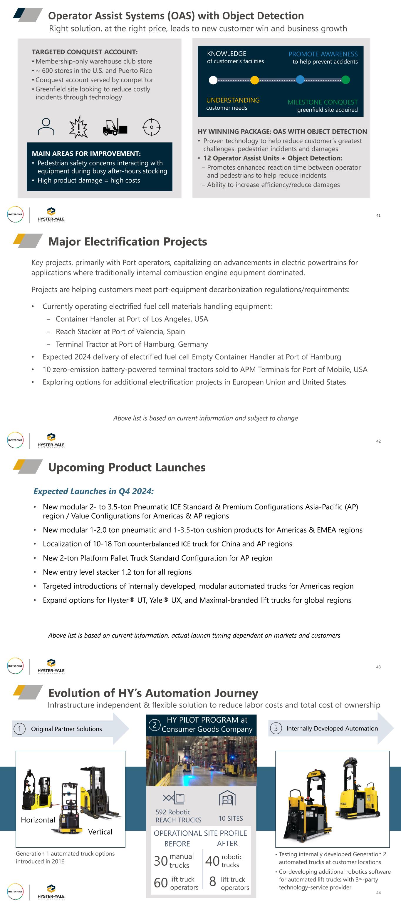 Operator Assist Systems (OAS) with Object Detection 41 MILESTONE CONQUEST greenfield site acquired KNOWLEDGE of customer’s facilities UNDERSTANDING customer needs PROMOTE AWARENESS to help prevent accidents TARGETED CONQUEST ACCOUNT: • Membership-only warehouse club store • ~ 600 stores in the U.S. and Puerto Rico • Conquest account served by competitor • Greenfield site looking to reduce costly incidents through technology MAIN AREAS FOR IMPROVEMENT: • Pedestrian safety concerns interacting with equipment during busy after-hours stocking • High product damage = high costs HY WINNING PACKAGE: OAS WITH OBJECT DETECTION • Proven technology to help reduce customer’s greatest challenges: pedestrian incidents and damages • 12 Operator Assist Units + Object Detection: ‒ Promotes enhanced reaction time between operator and pedestrians to help reduce incidents ‒ Ability to increase efficiency/reduce damages Right solution, at the right price, leads to new customer win and business growth Major Electrification Projects 42 Above list is based on current information and subject to change Key projects, primarily with Port operators, capitalizing on advancements in electric powertrains for applications where traditionally internal combustion engine equipment dominated. Projects are helping customers meet port-equipment decarbonization regulations/requirements: • Currently operating electrified fuel cell materials handling equipment: ‒ Container Handler at Port of Los Angeles, USA ‒ Reach Stacker at Port of Valencia, Spain ‒ Terminal Tractor at Port of Hamburg, Germany • Expected 2024 delivery of electrified fuel cell Empty Container Handler at Port of Hamburg • 10 zero-emission battery-powered terminal tractors sold to APM Terminals for Port of Mobile, USA • Exploring options for additional electrification projects in European Union and United States Expected Launches in Q4 2024: • New modular 2- to 3.5-ton Pneumatic ICE Standard & Premium Configurations Asia-Pacific (AP) region / Value Configurations for Americas & AP regions • New modular 1-2.0 ton pneumatic and 1-3.5-ton cushion products for Americas & EMEA regions • Localization of 10-18 Ton counterbalanced ICE truck for China and AP regions • New 2-ton Platform Pallet Truck Standard Configuration for AP region • New entry level stacker 1.2 ton for all regions • Targeted introductions of internally developed, modular automated trucks for Americas region • Expand options for Hyster® UT, Yale® UX, and Maximal-branded lift trucks for global regions 43 Upcoming Product Launches Above list is based on current information, actual launch timing dependent on markets and customers Evolution of HY’s Automation Journey • Testing internally developed Generation 2 automated trucks at customer locations • Co-developing additional robotics software for automated lift trucks with 3rd-party technology-service provider 44 Infrastructure independent & flexible solution to reduce labor costs and total cost of ownership BEFORE AFTER 30 manual trucks 40 robotic trucks 60 lift truck operators 8 lift truck operators HY PILOT PROGRAM at Consumer Goods Company 592 Robotic REACH TRUCKS 10 SITES OPERATIONAL SITE PROFILE Horizontal Vertical Original Partner Solutions Internally Developed Automation Generation 1 automated truck options introduced in 2016
