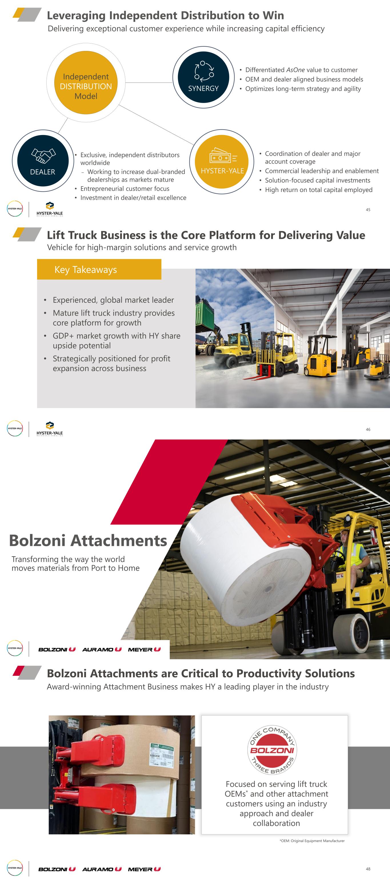 Independent DISTRIBUTION Model 45 Leveraging Independent Distribution to Win Delivering exceptional customer experience while increasing capital efficiency • Exclusive, independent distributors worldwide ‒ Working to increase dual-branded dealerships as markets mature • Entrepreneurial customer focus • Investment in dealer/retail excellence • Coordination of dealer and major account coverage • Commercial leadership and enablement • Solution-focused capital investments • High return on total capital employed • Differentiated AsOne value to customer • OEM and dealer aligned business models • Optimizes long-term strategy and agilitySYNERGY DEALER HYSTER-YALE Lift Truck Business is the Core Platform for Delivering Value 46 Vehicle for high-margin solutions and service growth • Experienced, global market leader • Mature lift truck industry provides core platform for growth • GDP+ market growth with HY share upside potential • Strategically positioned for profit expansion across business Key Takeaways Bolzoni Attachments Need a good Bolzoni photo on a Hyster truck Transforming the way the world moves materials from Port to Home Award-winning Attachment Business makes HY a leading player in the industry Bolzoni Attachments are Critical to Productivity Solutions 48 Focused on serving lift truck OEMs* and other attachment customers using an industry approach and dealer collaboration *OEM: Original Equipment Manufacturer