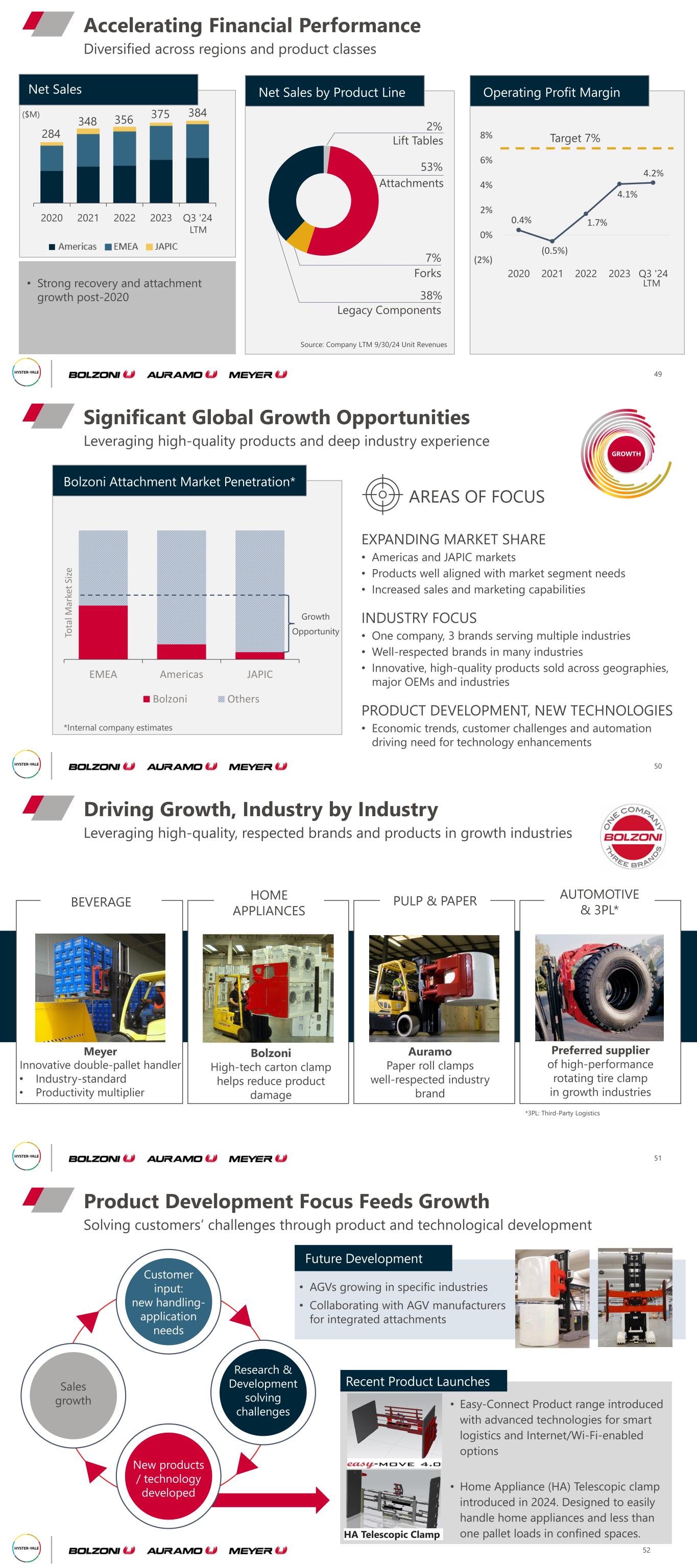 Operating Profit Margin 0.4% (0.5%) 1.7% 4.1% 4.2% (2%) 0% 2% 4% 6% 8% 2020 2021 2022 2023 Q3 '24 Net Sales by Product Line Diversified across regions and product classes Accelerating Financial Performance 49 Net Sales • Strong recovery and attachment growth post-2020 Target 7%284 348 356 375 384 2020 2021 2022 2023 Q3 '24 53% Attachments 2% Lift Tables 7% Forks 38% Legacy Components Source: Company LTM 9/30/24 Unit Revenues ($M) LTM LTM Bolzoni Attachment Market Penetration* Leveraging high-quality products and deep industry experience Significant Global Growth Opportunities 50 EMEA Americas JAPIC To ta l M ar ke t Si ze Bolzoni Others AREAS OF FOCUS EXPANDING MARKET SHARE • Americas and JAPIC markets • Products well aligned with market segment needs • Increased sales and marketing capabilities INDUSTRY FOCUS • One company, 3 brands serving multiple industries • Well-respected brands in many industries • Innovative, high-quality products sold across geographies, major OEMs and industries PRODUCT DEVELOPMENT, NEW TECHNOLOGIES • Economic trends, customer challenges and automation driving need for technology enhancements Growth Opportunity *Internal company estimates GROWTH AUTOMOTIVE & 3PL* Preferred supplier of high-performance rotating tire clamp in growth industries PULP & PAPER Auramo Paper roll clamps well-respected industry brand HOME APPLIANCES Bolzoni High-tech carton clamp helps reduce product damage BEVERAGE Meyer Innovative double-pallet handler • Industry-standard • Productivity multiplier Leveraging high-quality, respected brands and products in growth industries 51 Driving Growth, Industry by Industry *3PL: Third-Party Logistics • Easy-Connect Product range introduced with advanced technologies for smart logistics and Internet/Wi-Fi-enabled options • Home Appliance (HA) Telescopic clamp introduced in 2024. Designed to easily handle home appliances and less than one pallet loads in confined spaces. Solving customers’ challenges through product and technological development Product Development Focus Feeds Growth 52 Sales growth Research & Development solving challenges New products / technology developed Customer input: new handling- application needs • AGVs growing in specific industries • Collaborating with AGV manufacturers for integrated attachments Future Development Recent Product Launches HA Telescopic Clamp