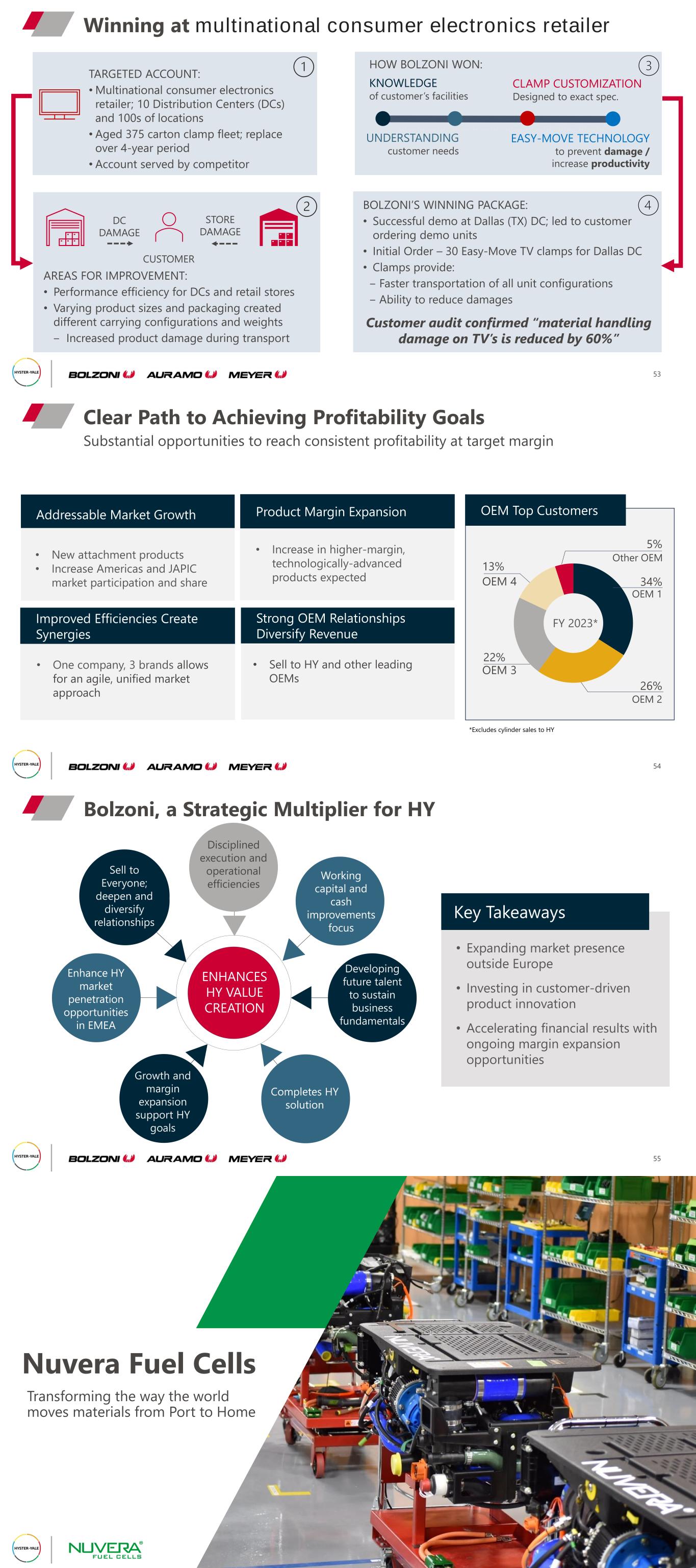 CLAMP CUSTOMIZATION Designed to exact spec. KNOWLEDGE of customer’s facilities Winning at multinational consumer electronics retailer 53 DC DAMAGE STORE DAMAGE CUSTOMER UNDERSTANDING customer needs EASY-MOVE TECHNOLOGY to prevent damage / increase productivity TARGETED ACCOUNT: • Multinational consumer electronics retailer; 10 Distribution Centers (DCs) and 100s of locations • Aged 375 carton clamp fleet; replace over 4-year period • Account served by competitor AREAS FOR IMPROVEMENT: • Performance efficiency for DCs and retail stores • Varying product sizes and packaging created different carrying configurations and weights ‒ Increased product damage during transport BOLZONI’S WINNING PACKAGE: • Successful demo at Dallas (TX) DC; led to customer ordering demo units • Initial Order – 30 Easy-Move TV clamps for Dallas DC • Clamps provide: ‒ Faster transportation of all unit configurations ‒ Ability to reduce damages HOW BOLZONI WON: Customer audit confirmed “material handling damage on TV’s is reduced by 60%” 26% OEM 2 22% OEM 3 13% OEM 4 Substantial opportunities to reach consistent profitability at target margin Clear Path to Achieving Profitability Goals 54 *Excludes cylinder sales to HY Addressable Market Growth Product Margin Expansion Improved Efficiencies Create Synergies Strong OEM Relationships Diversify Revenue • New attachment products • Increase Americas and JAPIC market participation and share • One company, 3 brands allows for an agile, unified market approach • Sell to HY and other leading OEMs • Increase in higher-margin, technologically-advanced products expected FY 2023* 5% Other OEM 34% OEM 1 OEM Top Customers Bolzoni, a Strategic Multiplier for HY 55 Key Takeaways • Expanding market presence outside Europe • Investing in customer-driven product innovation • Accelerating financial results with ongoing margin expansion opportunities ENHANCES HY VALUE CREATION Working capital and cash improvements focus Completes HY solution Enhance HY market penetration opportunities in EMEA Developing future talent to sustain business fundamentals Growth and margin expansion support HY goals Sell to Everyone; deepen and diversify relationships Disciplined execution and operational efficiencies Nuvera Fuel Cells Transforming the way the world moves materials from Port to Home