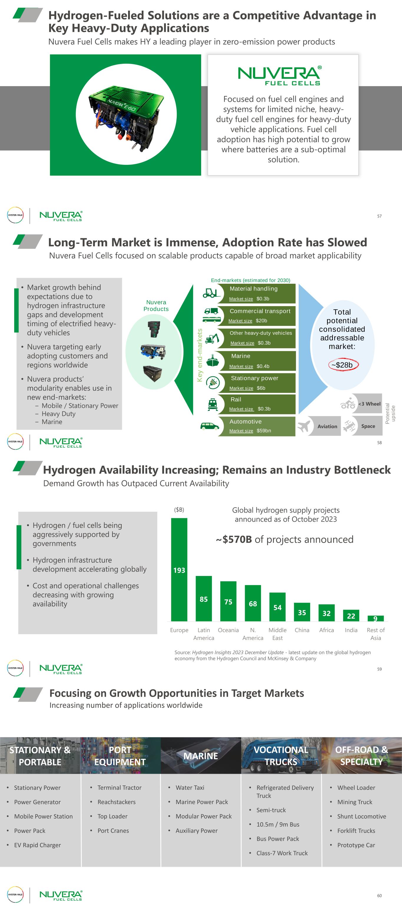 Nuvera Fuel Cells makes HY a leading player in zero-emission power products Hydrogen-Fueled Solutions are a Competitive Advantage in Key Heavy-Duty Applications 57 Focused on fuel cell engines and systems for limited niche, heavy- duty fuel cell engines for heavy-duty vehicle applications. Fuel cell adoption has high potential to grow where batteries are a sub-optimal solution. Long-Term Market is Immense, Adoption Rate has Slowed • Market growth behind expectations due to hydrogen infrastructure gaps and development timing of electrified heavy- duty vehicles • Nuvera targeting early adopting customers and regions worldwide • Nuvera products’ modularity enables use in new end-markets: − Mobile / Stationary Power − Heavy Duty − Marine Nuvera Fuel Cells focused on scalable products capable of broad market applicability 58 Rail ’25E FC share ’25E FC share ’25E FC share Applications Applications Applications Nuvera Products End-markets (estimated for 2030) Material handling Marine Stationary power Market size $0.3b Automotive Market size $59bn Commercial transport Market size $20b Other heavy-duty vehicles Market size $0.3b Total potential consolidated addressable market: ~$28b P o te n ti a l u p s id e K e y e n d -m a rk e ts Market size $0.4b Market size $6b Market size $0.3b <3 Wheel Aviation Space 193 85 75 68 54 35 32 22 Europe Latin America Oceania N. America Middle East China Africa India Rest of Asia 59 Hydrogen Availability Increasing; Remains an Industry Bottleneck • Hydrogen / fuel cells being aggressively supported by governments • Hydrogen infrastructure development accelerating globally • Cost and operational challenges decreasing with growing availability ($B) Global hydrogen supply projects announced as of October 2023 Source: Hydrogen Insights 2023 December Update - latest update on the global hydrogen economy from the Hydrogen Council and McKinsey & Company Demand Growth has Outpaced Current Availability ~$570B of projects announced 9 60 Increasing number of applications worldwide Focusing on Growth Opportunities in Target Markets STATIONARY & PORTABLE PORT EQUIPMENT MARINE VOCATIONAL TRUCKS OFF-ROAD & SPECIALTY • Refrigerated Delivery Truck • Semi-truck • 10.5m / 9m Bus • Bus Power Pack • Class-7 Work Truck • Wheel Loader • Mining Truck • Shunt Locomotive • Forklift Trucks • Prototype Car • Terminal Tractor • Reachstackers • Top Loader • Port Cranes • Water Taxi • Marine Power Pack • Modular Power Pack • Auxiliary Power • Stationary Power • Power Generator • Mobile Power Station • Power Pack • EV Rapid Charger