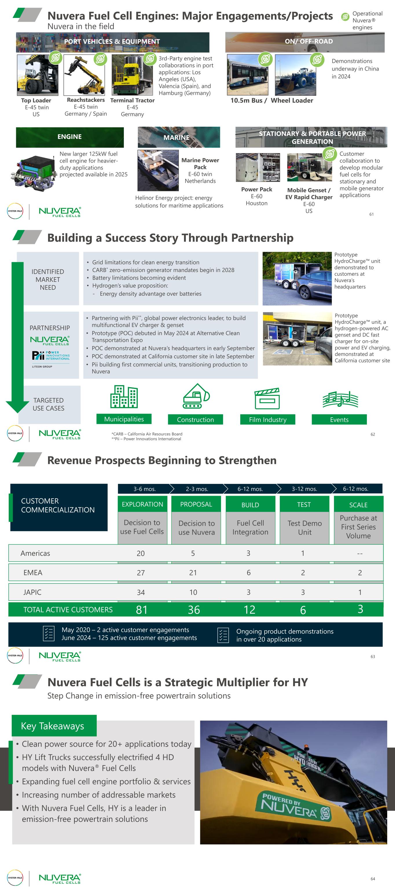 STATIONARY & PORTABLE POWER GENERATION Nuvera in the field Nuvera Fuel Cell Engines: Major Engagements/Projects 61 Operational Nuvera® engines Mobile Genset / EV Rapid Charger E-60 US MARINE PORT VEHICLES & EQUIPMENT Marine Power Pack E-60 twin Netherlands Helinor Energy project: energy solutions for maritime applications Top Loader E-45 twin US Reachstackers E-45 twin Germany / Spain 3rd-Party engine test collaborations in port applications: Los Angeles (USA), Valencia (Spain), and Hamburg (Germany) ON/ OFF-ROAD 10.5m Bus / Wheel Loader Demonstrations underway in China in 2024 ENGINE New larger 125kW fuel cell engine for heavier- duty applications projected available in 2025 Customer collaboration to develop modular fuel cells for stationary and mobile generator applications Terminal Tractor E-45 Germany Power Pack E-60 Houston Building a Success Story Through Partnership 62 PARTNERSHIP TARGETED USE CASES Municipalities *CARB – California Air Resources Board **Pii – Power Innovations International Construction Film Industry Events IDENTIFIED MARKET NEED • Grid limitations for clean energy transition • CARB* zero-emission generator mandates begin in 2028 • Battery limitations becoming evident • Hydrogen’s value proposition: - Energy density advantage over batteries • Partnering with Pii**, global power electronics leader, to build multifunctional EV charger & genset • Prototype (POC) debuted in May 2024 at Alternative Clean Transportation Expo • POC demonstrated at Nuvera’s headquarters in early September • POC demonstrated at California customer site in late September • Pii building first commercial units, transitioning production to Nuvera Prototype HydroCharge™ unit, a hydrogen-powered AC genset and DC fast charger for on-site power and EV charging, demonstrated at California customer site Prototype HydroCharge™ unit demonstrated to customers at Nuvera’s headquarters EXPLORATION Decision to use Nuvera PROPOSAL Fuel Cell Integration BUILD Test Demo Unit TEST Purchase at First Series Volume SCALE Revenue Prospects Beginning to Strengthen 63 6-12 mos.3-12 mos.6-12 mos.2-3 mos.3-6 mos. CUSTOMER COMMERCIALIZATION Decision to use Fuel Cells EMEA TOTAL ACTIVE CUSTOMERS JAPIC Americas 5 21 10 1 2 3 -- 2 1 20 27 34 3 6 3 81 36 12 6 3 May 2020 – 2 active customer engagements June 2024 – 125 active customer engagements Ongoing product demonstrations in over 20 applications Nuvera Fuel Cells is a Strategic Multiplier for HY 64 • Clean power source for 20+ applications today • HY Lift Trucks successfully electrified 4 HD models with Nuvera® Fuel Cells • Expanding fuel cell engine portfolio & services • Increasing number of addressable markets • With Nuvera Fuel Cells, HY is a leader in emission-free powertrain solutions Key Takeaways Step Change in emission-free powertrain solutions