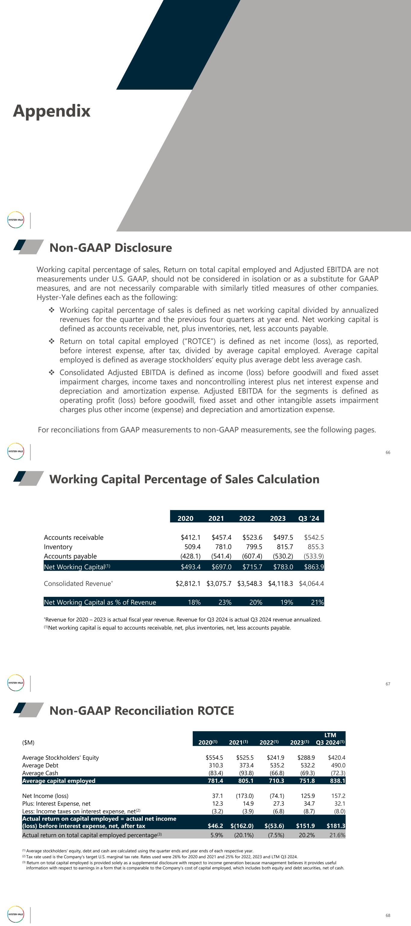Appendix Non-GAAP Disclosure 66 Working capital percentage of sales, Return on total capital employed and Adjusted EBITDA are not measurements under U.S. GAAP, should not be considered in isolation or as a substitute for GAAP measures, and are not necessarily comparable with similarly titled measures of other companies. Hyster-Yale defines each as the following: ❖ Working capital percentage of sales is defined as net working capital divided by annualized revenues for the quarter and the previous four quarters at year end. Net working capital is defined as accounts receivable, net, plus inventories, net, less accounts payable. ❖ Return on total capital employed (“ROTCE”) is defined as net income (loss), as reported, before interest expense, after tax, divided by average capital employed. Average capital employed is defined as average stockholders’ equity plus average debt less average cash. ❖ Consolidated Adjusted EBITDA is defined as income (loss) before goodwill and fixed asset impairment charges, income taxes and noncontrolling interest plus net interest expense and depreciation and amortization expense. Adjusted EBITDA for the segments is defined as operating profit (loss) before goodwill, fixed asset and other intangible assets impairment charges plus other income (expense) and depreciation and amortization expense. For reconciliations from GAAP measurements to non-GAAP measurements, see the following pages. Working Capital Percentage of Sales Calculation 67 2020 2021 2022 2023 Q3 ’24 Accounts receivable $412.1 $457.4 $523.6 $497.5 $542.5 Inventory 509.4 781.0 799.5 815.7 855.3 Accounts payable (428.1) (541.4) (607.4) (530.2) (533.9) Net Working Capital(1) $493.4 $697.0 $715.7 $783.0 $863.9 Consolidated Revenue* $2,812.1 $3,075.7 $3,548.3 $4,118.3 $4,064.4 Net Working Capital as % of Revenue 18% 23% 20% 19% 21% *Revenue for 2020 – 2023 is actual fiscal year revenue. Revenue for Q3 2024 is actual Q3 2024 revenue annualized. (1)Net working capital is equal to accounts receivable, net, plus inventories, net, less accounts payable. Non-GAAP Reconciliation ROTCE 68 LTM ($M) 2020(1) 2021(1) 2022(1) 2023(1) Q3 2024(1) Average Stockholders' Equity $554.5 $525.5 $241.9 $288.9 $420.4 Average Debt 310.3 373.4 535.2 532.2 490.0 Average Cash (83.4) (93.8) (66.8) (69.3) (72.3) Average capital employed 781.4 805.1 710.3 751.8 838.1 Net Income (loss) 37.1 (173.0) (74.1) 125.9 157.2 Plus: Interest Expense, net 12.3 14.9 27.3 34.7 32.1 Less: Income taxes on interest expense, net(2) (3.2) (3.9) (6.8) (8.7) (8.0) Actual return on capital employed = actual net income (loss) before interest expense, net, after tax $46.2 $(162.0) $(53.6) $151.9 $181.3 Actual return on total capital employed percentage(3) 5.9% (20.1%) (7.5%) 20.2% 21.6% (1) Average stockholders' equity, debt and cash are calculated using the quarter ends and year ends of each respective year. (2) Tax rate used is the Company's target U.S. marginal tax rate. Rates used were 26% for 2020 and 2021 and 25% for 2022, 2023 and LTM Q3 2024. (3) Return on total capital employed is provided solely as a supplemental disclosure with respect to income generation because management believes it provides useful information with respect to earnings in a form that is comparable to the Company's cost of capital employed, which includes both equity and debt securities, net of cash.