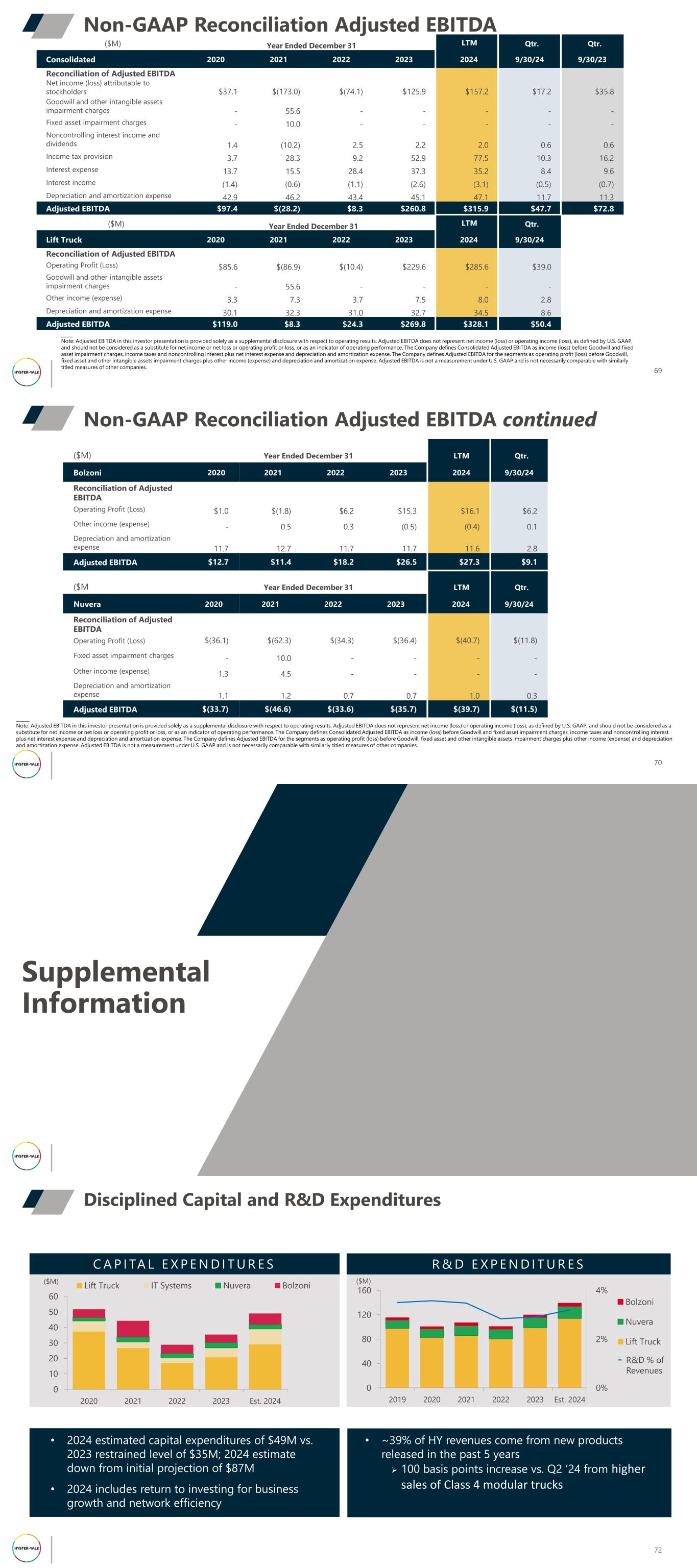 _____ Note: Adjusted EBITDA in this investor presentation is provided solely as a supplemental disclosure with respect to operating results. Adjusted EBITDA does not represent net income (loss) or operating income (loss), as defined by U.S. GAAP, and should not be considered as a substitute for net income or net loss or operating profit or loss, or as an indicator of operating performance. The Company defines Consolidated Adjusted EBITDA as income (loss) before Goodwill and fixed asset impairment charges, income taxes and noncontrolling interest plus net interest expense and depreciation and amortization expense. The Company defines Adjusted EBITDA for the segments as operating profit (loss) before Goodwill, fixed asset and other intangible assets impairment charges plus other income (expense) and depreciation and amortization expense. Adjusted EBITDA is not a measurement under U.S. GAAP and is not necessarily comparable with similarly titled measures of other companies. ($M) Year Ended December 31 LTM Qtr. Qtr. Consolidated 2020 2021 2022 2023 2024 9/30/24 9/30/23 Reconciliation of Adjusted EBITDA Net income (loss) attributable to stockholders $37.1 $(173.0) $(74.1) $125.9 $157.2 $17.2 $35.8 Goodwill and other intangible assets impairment charges - 55.6 - - - - - Fixed asset impairment charges - 10.0 - - - - - Noncontrolling interest income and dividends 1.4 (10.2) 2.5 2.2 2.0 0.6 0.6 Income tax provision 3.7 28.3 9.2 52.9 77.5 10.3 16.2 Interest expense 13.7 15.5 28.4 37.3 35.2 8.4 9.6 Interest income (1.4) (0.6) (1.1) (2.6) (3.1) (0.5) (0.7) Depreciation and amortization expense 42.9 46.2 43.4 45.1 47.1 11.7 11.3 Adjusted EBITDA $97.4 $(28.2) $8.3 $260.8 $315.9 $47.7 $72.8 ($M) Year Ended December 31 LTM Qtr. Lift Truck 2020 2021 2022 2023 2024 9/30/24 Reconciliation of Adjusted EBITDA Operating Profit (Loss) $85.6 $(86.9) $(10.4) $229.6 $285.6 $39.0 Goodwill and other intangible assets impairment charges - 55.6 - - - - Other income (expense) 3.3 7.3 3.7 7.5 8.0 2.8 Depreciation and amortization expense 30.1 32.3 31.0 32.7 34.5 8.6 Adjusted EBITDA $119.0 $8.3 $24.3 $269.8 $328.1 $50.4 Non-GAAP Reconciliation Adjusted EBITDA 69 Non-GAAP Reconciliation Adjusted EBITDA continued ($M) Year Ended December 31 LTM Qtr. Bolzoni 2020 2021 2022 2023 2024 9/30/24 Reconciliation of Adjusted EBITDA Operating Profit (Loss) $1.0 $(1.8) $6.2 $15.3 $16.1 $6.2 Other income (expense) - 0.5 0.3 (0.5) (0.4) 0.1 Depreciation and amortization expense 11.7 12.7 11.7 11.7 11.6 2.8 Adjusted EBITDA $12.7 $11.4 $18.2 $26.5 $27.3 $9.1 ($M Year Ended December 31 LTM Qtr. Nuvera 2020 2021 2022 2023 2024 9/30/24 Reconciliation of Adjusted EBITDA Operating Profit (Loss) $(36.1) $(62.3) $(34.3) $(36.4) $(40.7) $(11.8) Fixed asset impairment charges - 10.0 - - - - Other income (expense) 1.3 4.5 - - - - Depreciation and amortization expense 1.1 1.2 0.7 0.7 1.0 0.3 Adjusted EBITDA $(33.7) $(46.6) $(33.6) $(35.7) $(39.7) $(11.5) ______ Note: Adjusted EBITDA in this investor presentation is provided solely as a supplemental disclosure with respect to operating results. Adjusted EBITDA does not represent net income (loss) or operating income (loss), as defined by U.S. GAAP, and should not be considered as a substitute for net income or net loss or operating profit or loss, or as an indicator of operating performance. The Company defines Consolidated Adjusted EBITDA as income (loss) before Goodwill and fixed asset impairment charges, income taxes and noncontrolling interest plus net interest expense and depreciation and amortization expense. The Company defines Adjusted EBITDA for the segments as operating profit (loss) before Goodwill, fixed asset and other intangible assets impairment charges plus other income (expense) and depreciation and amortization expense. Adjusted EBITDA is not a measurement under U.S. GAAP and is not necessarily comparable with similarly titled measures of other companies. 70 Supplemental Information Disciplined Capital and R&D Expenditures 72 0 10 20 30 40 50 60 2020 2021 2022 2023 Est. 2024 Lift Truck IT Systems Nuvera Bolzoni C A P I TA L E X P E N D I T U R E S R & D E X P E N D I T U R E S 0% 2% 4% 0 40 80 120 160 2019 2020 2021 2022 2023 Est. 2024 Bolzoni Nuvera Lift Truck ($M) ($M) • 2024 estimated capital expenditures of $49M vs. 2023 restrained level of $35M; 2024 estimate down from initial projection of $87M • 2024 includes return to investing for business growth and network efficiency • ~39% of HY revenues come from new products released in the past 5 years ➢ 100 basis points increase vs. Q2 ’24 from higher sales of Class 4 modular trucks R&D % of Revenues