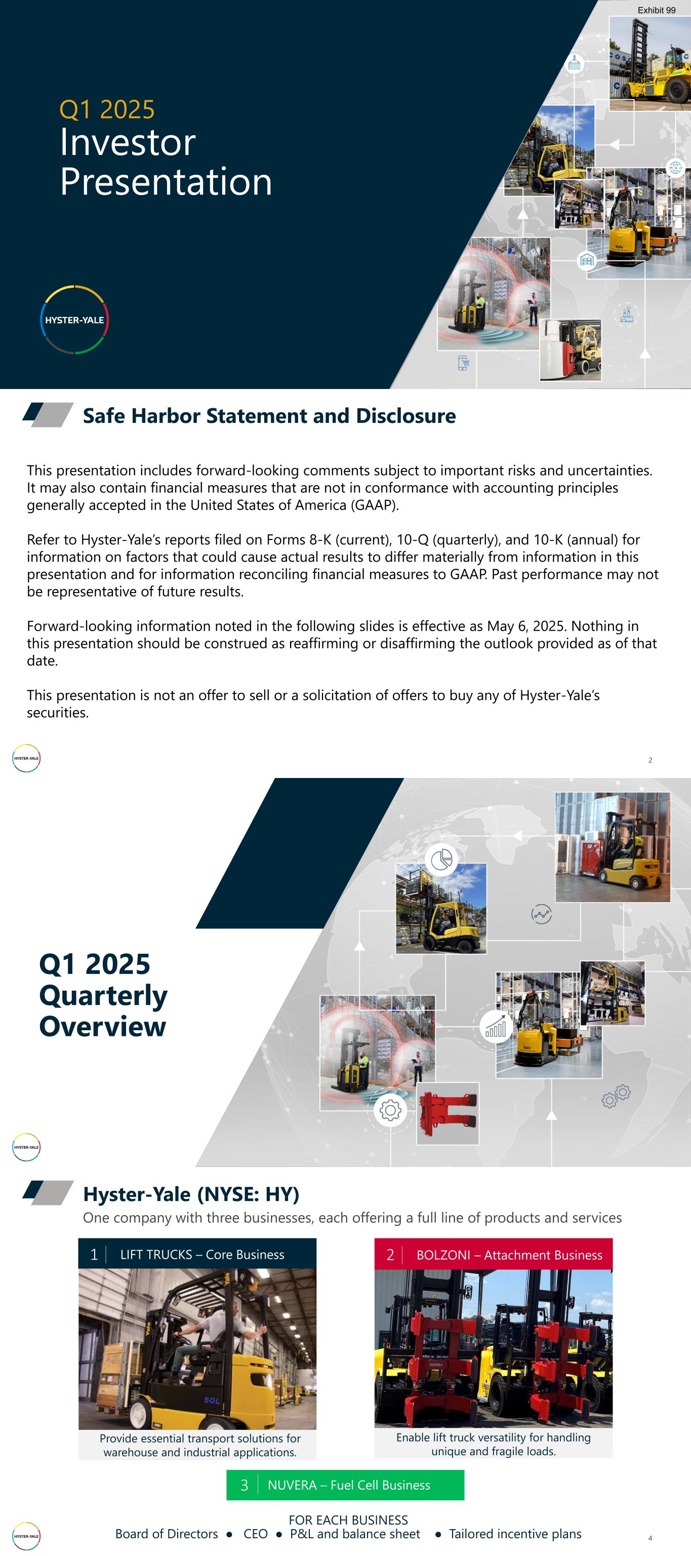 Q1 2025 Investor Presentation Exhibit 99 This presentation includes forward-looking comments subject to important risks and uncertainties. It may also contain financial measures that are not in conformance with accounting principles generally accepted in the United States of America (GAAP). Refer to Hyster-Yale’s reports filed on Forms 8-K (current), 10-Q (quarterly), and 10-K (annual) for information on factors that could cause actual results to differ materially from information in this presentation and for information reconciling financial measures to GAAP. Past performance may not be representative of future results. Forward-looking information noted in the following slides is effective as May 6, 2025. Nothing in this presentation should be construed as reaffirming or disaffirming the outlook provided as of that date. This presentation is not an offer to sell or a solicitation of offers to buy any of Hyster-Yale’s securities. Safe Harbor Statement and Disclosure 2 Q1 2025 Quarterly Overview 4 One company with three businesses, each offering a full line of products and services Hyster-Yale (NYSE: HY) Enable lift truck versatility for handling unique and fragile loads. Provide essential transport solutions for warehouse and industrial applications. LIFT TRUCKS – Core Business1 BOLZONI – Attachment Business2 FOR EACH BUSINESS Board of Directors ● CEO ● P&L and balance sheet ● Tailored incentive plans 3 NUVERA – Fuel Cell Business
