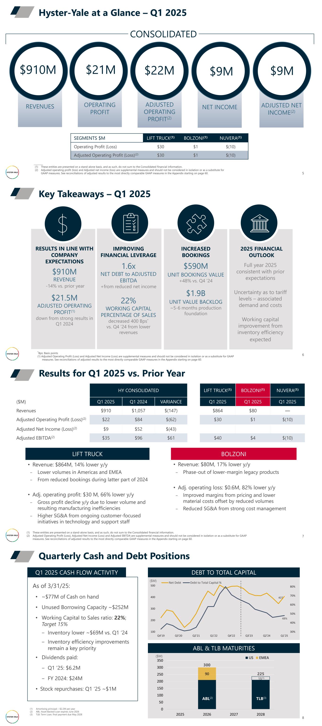 REVENUES OPERATING PROFIT ADJUSTED OPERATING PROFIT(2) NET INCOME ADJUSTED NET INCOME(2) 5 Hyster-Yale at a Glance – Q1 2025 $910M $21M $22M $9M $9M CONSOLIDATED SEGMENTS $M LIFT TRUCK(1) BOLZONI(1) NUVERA(1) Operating Profit (Loss) $30 $1 $(10) Adjusted Operating Profit (Loss)(2) $30 $1 $(10) ________ (1) These entities are presented on a stand-alone basis, and as such, do not sum to the Consolidated financial information. (2) Adjusted operating profit (loss) and Adjusted net income (loss) are supplemental measures and should not be considered in isolation or as a substitute for GAAP measures. See reconciliations of adjusted results to the most directly comparable GAAP measures in the Appendix starting on page 60. Key Takeaways – Q1 2025 6 2025 FINANCIAL OUTLOOK IMPROVING FINANCIAL LEVERAGE 1.6x NET DEBT to ADJUSTED EBITDA +from reduced net income 22% WORKING CAPITAL PERCENTAGE OF SALES decreased 400 Bps* vs. Q4 ’24 from lower revenues INCREASED BOOKINGS $590M UNIT BOOKINGS VALUE +48% vs. Q4 ‘24 $1.9B UNIT VALUE BACKLOG ~5-6 months production foundation RESULTS IN LINE WITH COMPANY EXPECTATIONS $910M REVENUE -14% vs. prior year $21.5M ADJUSTED OPERATING PROFIT(1) down from strong results in Q1 2024 *Bps: Basis points (1) Adjusted Operating Profit (Loss) and Adjusted Net Income (Loss) are supplemental measures and should not be considered in isolation or as a substitute for GAAP measures. See reconciliations of adjusted results to the most directly comparable GAAP measures in the Appendix starting on page 60. Full year 2025 consistent with prior expectations Uncertainty as to tariff levels – associated demand and costs Working capital improvement from inventory efficiency expected HY CONSOLIDATED LIFT TRUCK(1) BOLZONI(1) NUVERA(1) ($M) Q1 2025 Q1 2024 VARIANCE Q1 2025 Q1 2025 Q1 2025 Revenues $910 $1,057 $(147) $864 $80 — Adjusted Operating Profit (Loss)(2) $22 $84 $(62) $30 $1 $(10) Adjusted Net Income (Loss)(2) $9 $52 $(43) Adjusted EBITDA(2) $35 $96 $61 $40 $4 $(10) Results for Q1 2025 vs. Prior Year 7 (1) These entities are presented on a stand-alone basis, and as such, do not sum to the Consolidated financial information. (2) Adjusted Operating Profit (Loss), Adjusted Net Income (Loss) and Adjusted EBITDA are supplemental measures and should not be considered in isolation or as a substitute for GAAP measures. See reconciliations of adjusted results to the most directly comparable GAAP measures in the Appendix starting on page 60. LIFT TRUCK • Revenue: $864M, 14% lower y/y ‒ Lower volumes in Americas and EMEA ‒ From reduced bookings during latter part of 2024 • Adj. operating profit: $30 M, 66% lower y/y ‒ Gross profit decline y/y due to lower volume and resulting manufacturing inefficiencies ‒ Higher SG&A from ongoing customer-focused initiatives in technology and support staff BOLZONI • Revenue: $80M, 17% lower y/y ‒ Phase-out of lower-margin legacy products • Adj. operating loss: $0.6M, 82% lower y/y ‒ Improved margins from pricing and lower material costs offset by reduced volumes ‒ Reduced SG&A from strong cost management Quarterly Cash and Debt Positions 8 As of 3/31/25: • ~$77M of Cash on hand • Unused Borrowing Capacity ~$252M • Working Capital to Sales ratio: 22%; Target 15% ‒ Inventory lower ~$69M vs. Q1 ‘24 ‒ Inventory efficiency improvements remain a key priority • Dividends paid: ‒ Q1 ’25: $6.2M ‒ FY 2024: $24M • Stock repurchases: Q1 ‘25 ~$1M Q1 2025 CASH FLOW ACTIVITY 407 48% 30% 40% 50% 60% 70% 80% 100 200 300 400 500 Q4'19 Q3'20 Q2'21 Q1'22 Q4'22 Q3'23 Q2'24 Q1'25 Net Debt Debt to Total Capital % DEBT TO TOTAL CAPITAL ($M) 90 0 50 100 150 200 250 300 350 2025 2026 2027 2028 US EMEA ABL & TLB MATURITIES 300 225 15(1) ABL(2) TLB(3) ($M) (1) Amortizing principal: ~$2.2M per year (2) ABL: Asset Backed Loan expires June 2026 (3) TLB: Term Loan, final payment due May 2028