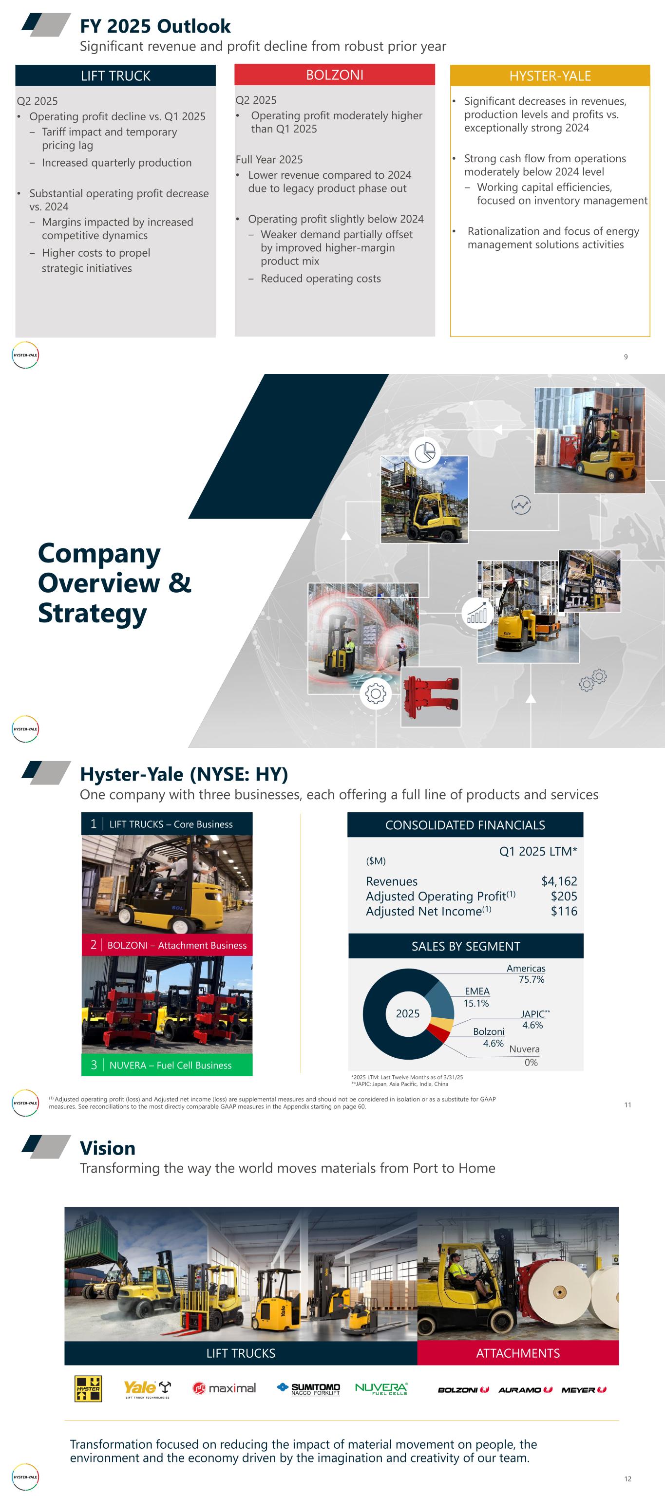 9 Significant revenue and profit decline from robust prior year FY 2025 Outlook Q2 2025 • Operating profit moderately higher than Q1 2025 Full Year 2025 • Lower revenue compared to 2024 due to legacy product phase out • Operating profit slightly below 2024 ‒ Weaker demand partially offset by improved higher-margin product mix ‒ Reduced operating costs BOLZONI Q2 2025 • Operating profit decline vs. Q1 2025 ‒ Tariff impact and temporary pricing lag ‒ Increased quarterly production • Substantial operating profit decrease vs. 2024 ‒ Margins impacted by increased competitive dynamics ‒ Higher costs to propel strategic initiatives LIFT TRUCK HYSTER-YALE • Significant decreases in revenues, production levels and profits vs. exceptionally strong 2024 • Strong cash flow from operations moderately below 2024 level ‒ Working capital efficiencies, focused on inventory management • Rationalization and focus of energy management solutions activities Company Overview & Strategy Hyster-Yale (NYSE: HY) One company with three businesses, each offering a full line of products and services 11 *2025 LTM: Last Twelve Months as of 3/31/25 **JAPIC: Japan, Asia Pacific, India, China ($M) CONSOLIDATED FINANCIALS Revenues Adjusted Operating Profit(1) Adjusted Net Income(1) SALES BY SEGMENT EMEA 15.1% Americas 75.7% Bolzoni 4.6% JAPIC** 4.6% (1) Adjusted operating profit (loss) and Adjusted net income (loss) are supplemental measures and should not be considered in isolation or as a substitute for GAAP measures. See reconciliations to the most directly comparable GAAP measures in the Appendix starting on page 60. Q1 2025 LTM* $4,162 $205 $116 BOLZONI – Attachment Business2 LIFT TRUCKS – Core Business1 NUVERA – Fuel Cell Business3 2025 0% Nuvera 12 Transforming the way the world moves materials from Port to Home Vision LIFT TRUCKS ATTACHMENTS Transformation focused on reducing the impact of material movement on people, the environment and the economy driven by the imagination and creativity of our team.