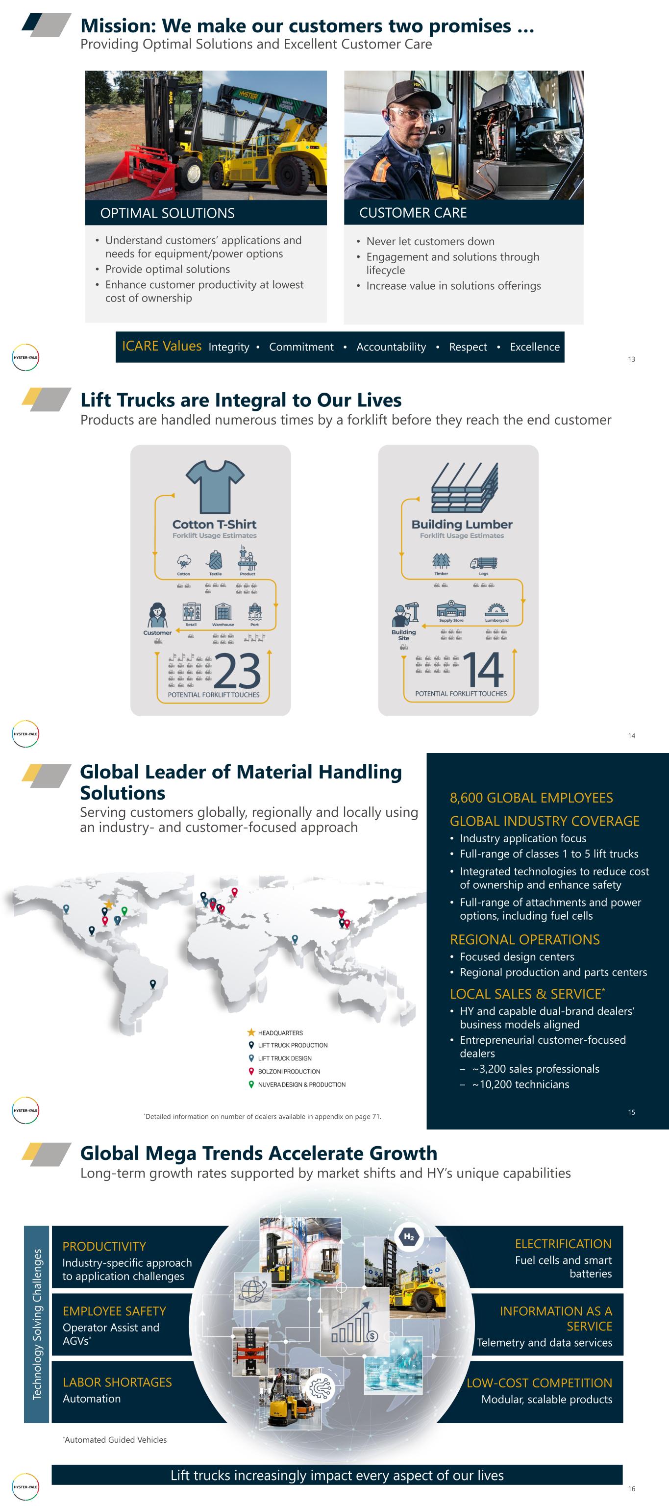 13 Mission: We make our customers two promises … Providing Optimal Solutions and Excellent Customer Care • Understand customers’ applications and needs for equipment/power options • Provide optimal solutions • Enhance customer productivity at lowest cost of ownership OPTIMAL SOLUTIONS • Never let customers down • Engagement and solutions through lifecycle • Increase value in solutions offerings CUSTOMER CARE Integrity • Commitment • Accountability • Respect • ExcellenceICARE Values 14 Products are handled numerous times by a forklift before they reach the end customer Lift Trucks are Integral to Our Lives 8,600 GLOBAL EMPLOYEES GLOBAL INDUSTRY COVERAGE • Industry application focus • Full-range of classes 1 to 5 lift trucks • Integrated technologies to reduce cost of ownership and enhance safety • Full-range of attachments and power options, including fuel cells REGIONAL OPERATIONS • Focused design centers • Regional production and parts centers LOCAL SALES & SERVICE* • HY and capable dual-brand dealers’ business models aligned • Entrepreneurial customer-focused dealers ‒ ~3,200 sales professionals ‒ ~10,200 technicians 15 Serving customers globally, regionally and locally using an industry- and customer-focused approach Global Leader of Material Handling Solutions *Detailed information on number of dealers available in appendix on page 71. Global Mega Trends Accelerate Growth Long-term growth rates supported by market shifts and HY’s unique capabilities ELECTRIFICATION Fuel cells and smart batteries INFORMATION AS A SERVICE Telemetry and data services LOW-COST COMPETITION Modular, scalable products 16 PRODUCTIVITY Industry-specific approach to application challenges EMPLOYEE SAFETY Operator Assist and AGVs* LABOR SHORTAGES AutomationTe ch n o lo g y S o lv in g C h a ll e n g e s *Automated Guided Vehicles Lift trucks increasingly impact every aspect of our lives