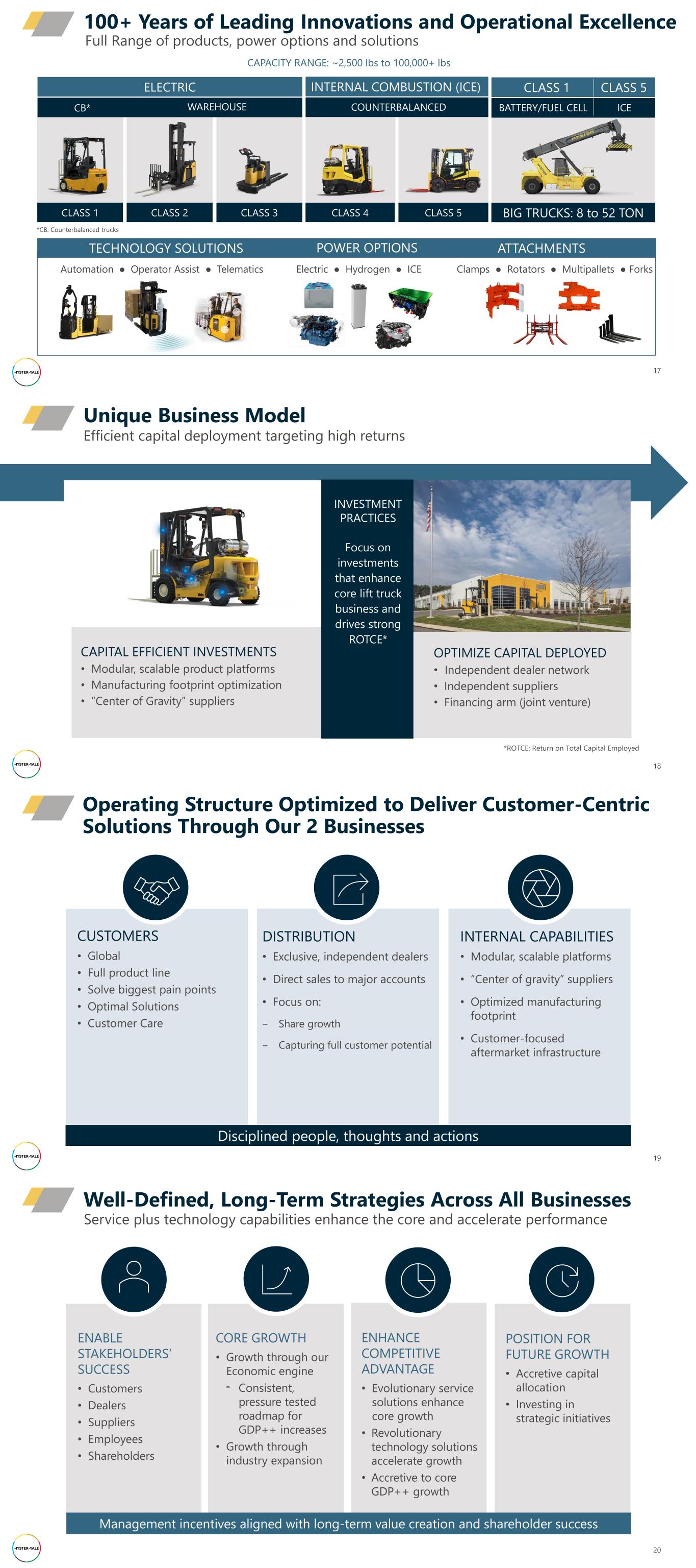 Electric ● Hydrogen ● ICE 17 100+ Years of Leading Innovations and Operational Excellence 17 *CB: Counterbalanced trucks CLASS 1 CLASS 2 CLASS 3 CB* WAREHOUSE ELECTRIC CLASS 4 CLASS 5 COUNTERBALANCED INTERNAL COMBUSTION (ICE) BIG TRUCKS: 8 to 52 TON BATTERY/FUEL CELL ICE CLASS 1 CLASS 5 Clamps ● Rotators ● Multipallets ● ForksAutomation ● Operator Assist ● Telematics TECHNOLOGY SOLUTIONS POWER OPTIONS ATTACHMENTS Full Range of products, power options and solutions CAPACITY RANGE: ~2,500 lbs to 100,000+ lbs Efficient capital deployment targeting high returns Unique Business Model 18 OPTIMIZE CAPITAL DEPLOYED • Independent dealer network • Independent suppliers • Financing arm (joint venture) CAPITAL EFFICIENT INVESTMENTS • Modular, scalable product platforms • Manufacturing footprint optimization • “Center of Gravity” suppliers INVESTMENT PRACTICES Focus on investments that enhance core lift truck business and drives strong ROTCE* *ROTCE: Return on Total Capital Employed 19 Operating Structure Optimized to Deliver Customer-Centric Solutions Through Our 2 Businesses CUSTOMERS • Global • Full product line • Solve biggest pain points • Optimal Solutions • Customer Care Disciplined people, thoughts and actions DISTRIBUTION • Exclusive, independent dealers • Direct sales to major accounts • Focus on: ‒ Share growth ‒ Capturing full customer potential INTERNAL CAPABILITIES • Modular, scalable platforms • “Center of gravity” suppliers • Optimized manufacturing footprint • Customer-focused aftermarket infrastructure 20 Service plus technology capabilities enhance the core and accelerate performance Well-Defined, Long-Term Strategies Across All Businesses ENABLE STAKEHOLDERS’ SUCCESS • Customers • Dealers • Suppliers • Employees • Shareholders Management incentives aligned with long-term value creation and shareholder success CORE GROWTH • Growth through our Economic engine - Consistent, pressure tested roadmap for GDP++ increases • Growth through industry expansion ENHANCE COMPETITIVE ADVANTAGE • Evolutionary service solutions enhance core growth • Revolutionary technology solutions accelerate growth • Accretive to core GDP++ growth POSITION FOR FUTURE GROWTH • Accretive capital allocation • Investing in strategic initiatives