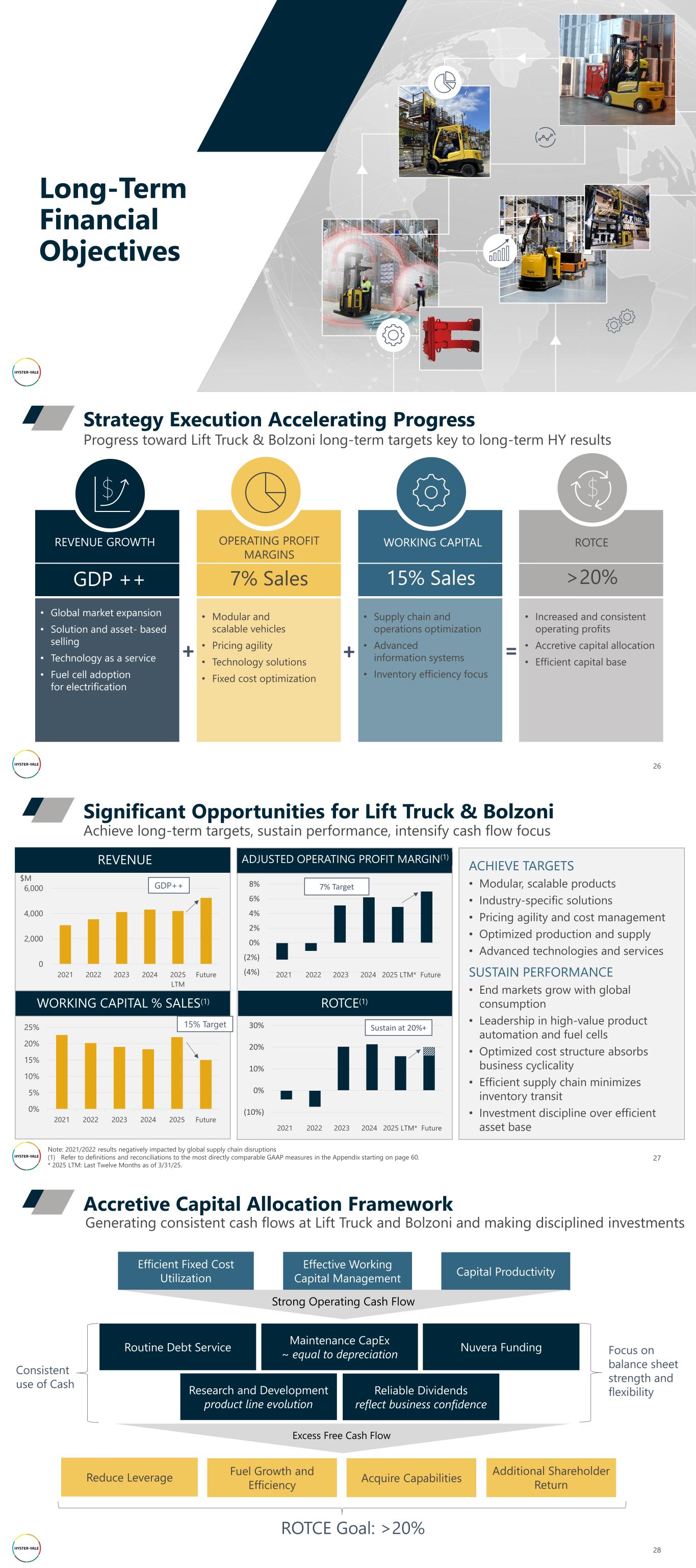 Long-Term Financial Objectives REVENUE GROWTH GDP ++ • Global market expansion • Solution and asset- based selling • Technology as a service • Fuel cell adoption for electrification OPERATING PROFIT MARGINS 7% Sales • Modular and scalable vehicles • Pricing agility • Technology solutions • Fixed cost optimization WORKING CAPITAL 15% Sales • Supply chain and operations optimization • Advanced information systems • Inventory efficiency focus ROTCE >20% • Increased and consistent operating profits • Accretive capital allocation • Efficient capital base 26 Progress toward Lift Truck & Bolzoni long-term targets key to long-term HY results Strategy Execution Accelerating Progress + + = 27 Achieve long-term targets, sustain performance, intensify cash flow focus Significant Opportunities for Lift Truck & Bolzoni REVENUE WORKING CAPITAL % SALES(1) ADJUSTED OPERATING PROFIT MARGIN(1) ROTCE(1) ACHIEVE TARGETS • Modular, scalable products • Industry-specific solutions • Pricing agility and cost management • Optimized production and supply • Advanced technologies and services SUSTAIN PERFORMANCE • End markets grow with global consumption • Leadership in high-value product automation and fuel cells • Optimized cost structure absorbs business cyclicality • Efficient supply chain minimizes inventory transit • Investment discipline over efficient asset base 0 2,000 4,000 6,000 2021 2022 2023 2024 2025 LTM Future GDP++ $M (4%) (2%) 0% 2% 4% 6% 8% 2021 2022 2023 2024 2025 LTM* Future 7% Target (10%) 0% 10% 20% 30% Sustain at 20%+ Note: 2021/2022 results negatively impacted by global supply chain disruptions (1) Refer to definitions and reconciliations to the most directly comparable GAAP measures in the Appendix starting on page 60. * 2025 LTM: Last Twelve Months as of 3/31/25. 0% 5% 10% 15% 20% 25% 2021 2022 2023 2024 2025 Future 15% Target 2021 2022 2023 2024 2025 LTM* Future 28 Generating consistent cash flows at Lift Truck and Bolzoni and making disciplined investments Accretive Capital Allocation Framework Efficient Fixed Cost Utilization Effective Working Capital Management Capital Productivity Reduce Leverage Fuel Growth and Efficiency Acquire Capabilities Routine Debt Service Maintenance CapEx ~ equal to depreciation Research and Development product line evolution Reliable Dividends reflect business confidence Strong Operating Cash Flow Excess Free Cash Flow Consistent use of Cash Focus on balance sheet strength and flexibility ROTCE Goal: >20% Additional Shareholder Return Nuvera Funding