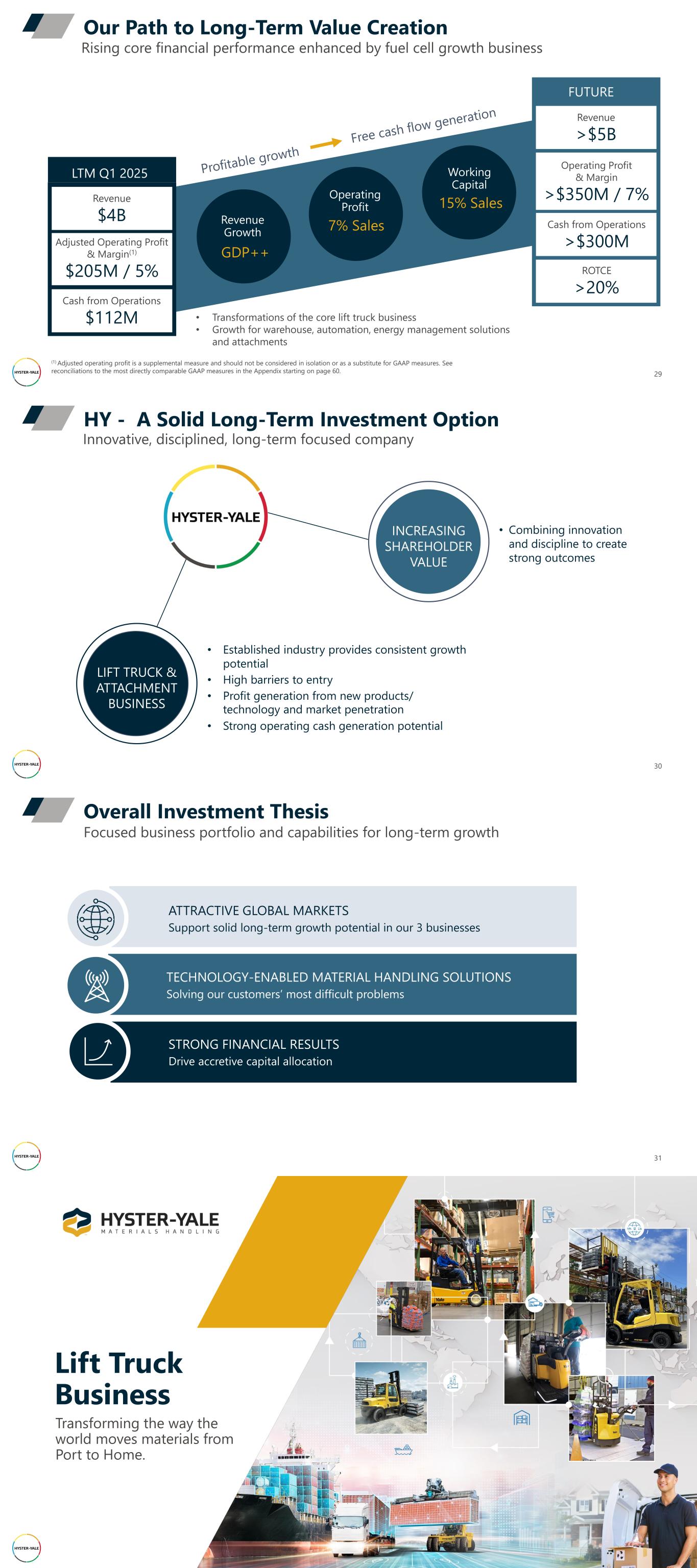 Rising core financial performance enhanced by fuel cell growth business Our Path to Long-Term Value Creation Adjusted Operating Profit & Margin(1) $205M / 5% Revenue $4B Cash from Operations $112M LTM Q1 2025 Operating Profit & Margin >$350M / 7% Revenue >$5B Cash from Operations >$300M FUTURE ROTCE >20% Revenue Growth GDP++ Operating Profit 7% Sales Working Capital 15% Sales 29 (1) Adjusted operating profit is a supplemental measure and should not be considered in isolation or as a substitute for GAAP measures. See reconciliations to the most directly comparable GAAP measures in the Appendix starting on page 60. • Transformations of the core lift truck business • Growth for warehouse, automation, energy management solutions and attachments 30 Innovative, disciplined, long-term focused company HY - A Solid Long-Term Investment Option • Established industry provides consistent growth potential • High barriers to entry • Profit generation from new products/ technology and market penetration • Strong operating cash generation potential • Combining innovation and discipline to create strong outcomes INCREASING SHAREHOLDER VALUE LIFT TRUCK & ATTACHMENT BUSINESS TECHNOLOGY-ENABLED MATERIAL HANDLING SOLUTIONS Solving our customers’ most difficult problems 31 Focused business portfolio and capabilities for long-term growth Overall Investment Thesis ATTRACTIVE GLOBAL MARKETS Support solid long-term growth potential in our 3 businesses STRONG FINANCIAL RESULTS Drive accretive capital allocation Lift Truck Business Transforming the way the world moves materials from Port to Home.