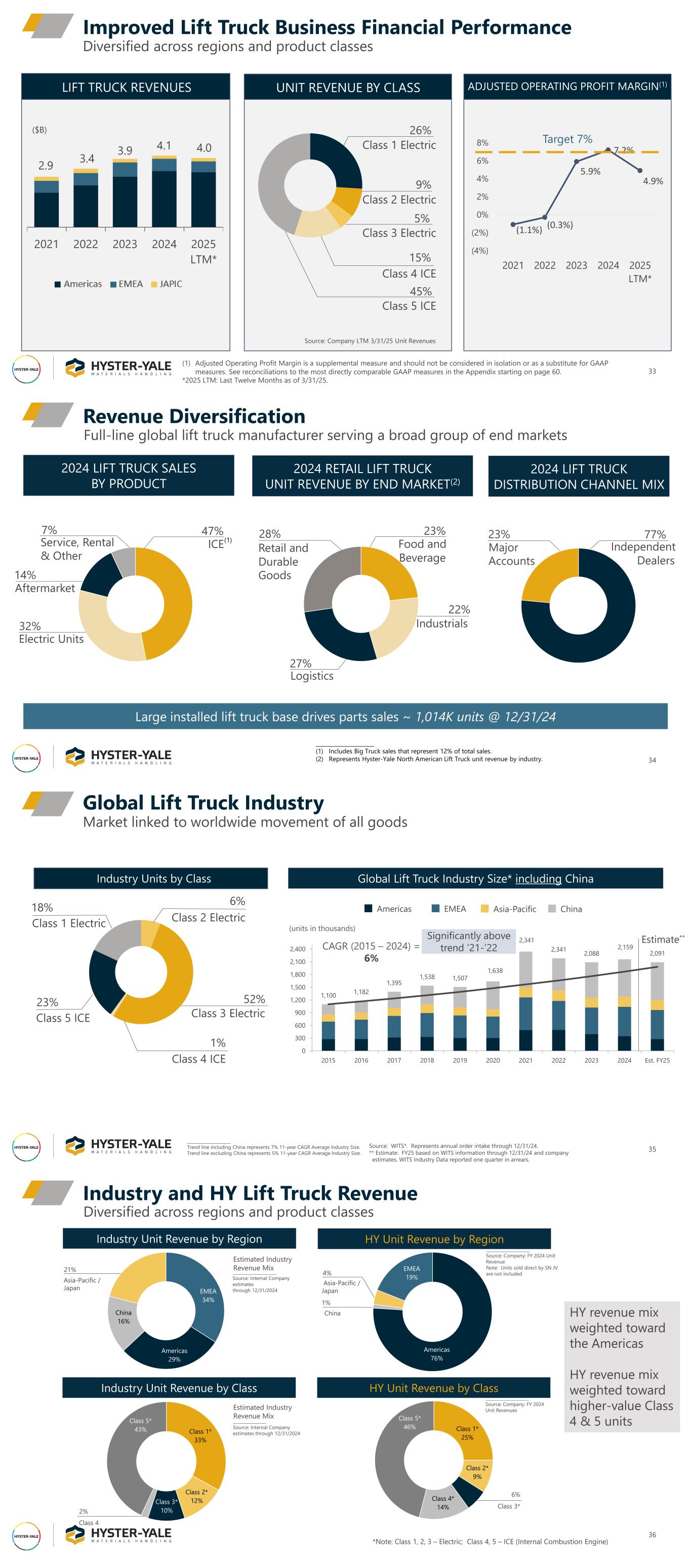 33 Diversified across regions and product classes Improved Lift Truck Business Financial Performance 2.9 3.4 3.9 4.1 4.0 2021 2022 2023 2024 2025 LTM* LIFT TRUCK REVENUES UNIT REVENUE BY CLASS 26% Class 1 Electric 9% Class 2 Electric 5% Class 3 Electric 15% Class 4 ICE Class 5 ICE 45% ADJUSTED OPERATING PROFIT MARGIN(1) (1.1%) (0.3%) 5.9% 7.2% 4.9% (4%) (2%) 0% 2% 4% 6% 8% 2021 2022 2023 2024 2025 LTM* Target 7% Source: Company LTM 3/31/25 Unit Revenues ($B) (1) Adjusted Operating Profit Margin is a supplemental measure and should not be considered in isolation or as a substitute for GAAP measures. See reconciliations to the most directly comparable GAAP measures in the Appendix starting on page 60. *2025 LTM: Last Twelve Months as of 3/31/25. 22% Industrials Full-line global lift truck manufacturer serving a broad group of end markets 14% Service, Rental & Other Electric Units Aftermarket 7% Independent Dealers 34 Revenue Diversification 2024 LIFT TRUCK SALES BY PRODUCT _____________________ (1) Includes Big Truck sales that represent 12% of total sales. (2) Represents Hyster-Yale North American Lift Truck unit revenue by industry. 2024 RETAIL LIFT TRUCK UNIT REVENUE BY END MARKET(2) (1) 2024 LIFT TRUCK DISTRIBUTION CHANNEL MIX 77%23% Major Accounts Food and Beverage 23%28% Retail and Durable Goods Logistics 27% ICE 47% 32% Large installed lift truck base drives parts sales ~ 1,014K units @ 12/31/24 _____________________ Trend line including China represents 7% 11-year CAGR Average Industry Size. Trend line excluding China represents 5% 11-year CAGR Average Industry Size. Market linked to worldwide movement of all goods Global Lift Truck Industry 35 Source: WITS*. Represents annual order intake through 12/31/24. ** Estimate: FY25 based on WITS information through 12/31/24 and company estimates. WITS Industry Data reported one quarter in arrears. Industry Units by Class 18% Class 1 Electric 6% Class 2 Electric 52% Class 3 Electric 1% Class 4 ICE Class 5 ICE 23% 1,100 1,182 1,395 1,538 1,507 1,638 2,341 2,341 2,088 2,159 2,091 0 300 600 900 1,200 1,500 1,800 2,100 2,400 2015 2016 2017 2018 2019 2020 2021 2022 2023 2024 Est. FY25 CAGR (2015 – 2024) = 6% Global Lift Truck Industry Size* including China Significantly above trend ’21-’22 (units in thousands) Americas EMEA Asia-Pacific China Estimate** Diversified across regions and product classes Industry and HY Lift Truck Revenue 36 *Note: Class 1, 2, 3 – Electric; Class 4, 5 – ICE (Internal Combustion Engine) Class 1* 33% Class 2* 12%Class 3* 10% Class 5* 43% ________________ Source: Internal Company estimates through 12/31/2024 Estimated Industry Revenue Mix Industry Unit Revenue by Class Class 4 2% Class 1* 25% Class 2* 9% Class 4* 14% Class 5* 46% HY Unit Revenue by Class _____________________ Source: Company: FY 2024 Unit Revenues 6% Class 3* HY Unit Revenue by Region Americas 76% EMEA 19% _____________________ Source: Company: FY 2024 Unit Revenue Note: Units sold direct by SN JV are not included China 1% 4% Asia-Pacific / JapanEMEA 34% Americas 29% China 16% _____________________ Source: Internal Company estimates through 12/31/2024 Estimated Industry Revenue Mix Industry Unit Revenue by Region 21% Asia-Pacific / Japan HY revenue mix weighted toward the Americas HY revenue mix weighted toward higher-value Class 4 & 5 units