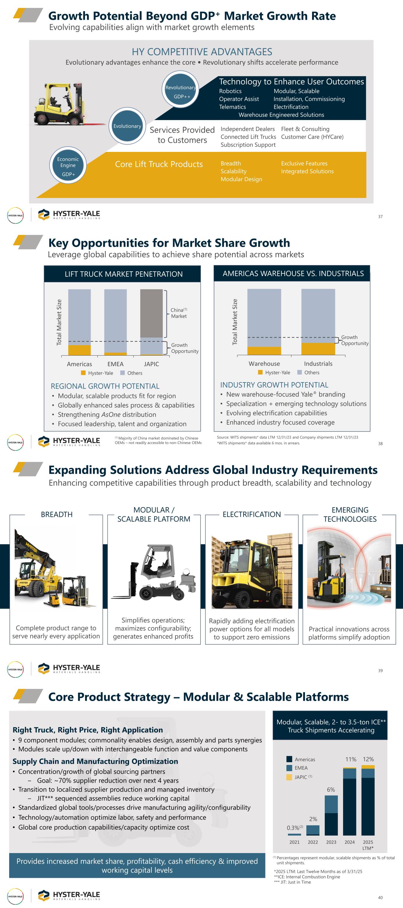 37 Growth Potential Beyond GDP+ Market Growth Rate Robotics Modular, Scalable Operator Assist Installation, Commissioning Telematics Electrification Warehouse Engineered Solutions Independent Dealers Fleet & Consulting Connected Lift Trucks Customer Care (HYCare) Subscription Support Breadth Exclusive Features Scalability Integrated Solutions Modular Design HY COMPETITIVE ADVANTAGES Evolutionary advantages enhance the core • Revolutionary shifts accelerate performance Evolving capabilities align with market growth elements Lift Trucks (Core Products) Economic Engine GDP+ Revolutionary GDP++ Core Lift Truck Products Technology to Enhance User Outcomes Services Provided to Customers Evolutionary LIFT TRUCK MARKET PENETRATION Americas EMEA JAPIC To ta l M ar ke t Si ze AMERICAS WAREHOUSE VS. INDUSTRIALS Key Opportunities for Market Share Growth 38 Growth Opportunity • Modular, scalable products fit for region • Globally enhanced sales process & capabilities • Strengthening AsOne distribution • Focused leadership, talent and organization REGIONAL GROWTH POTENTIAL • New warehouse-focused Yale® branding • Specialization + emerging technology solutions • Evolving electrification capabilities • Enhanced industry focused coverage INDUSTRY GROWTH POTENTIAL Warehouse Industrials To ta l M ar ke t Si ze Hyster-Yale Others Hyster-Yale Others Leverage global capabilities to achieve share potential across markets (1) Majority of China market dominated by Chinese OEMs – not readily accessible to non-Chinese OEMs China(1) Market Growth Opportunity Source: WITS shipments* data LTM 12/31/23 and Company shipments LTM 12/31/23 *WITS shipments* data available 6 mos. in arrears. 39 Expanding Solutions Address Global Industry Requirements Enhancing competitive capabilities through product breadth, scalability and technology MODULAR / SCALABLE PLATFORM BREADTH Simplifies operations; maximizes configurability; generates enhanced profits Complete product range to serve nearly every application EMERGING TECHNOLOGIES Practical innovations across platforms simplify adoption Image ELECTRIFICATION Rapidly adding electrification power options for all models to support zero emissions 2021 2022 2023 2024 2025 LTM* Americas EMEA JAPIC (1) 12% 0.3%(2) 2% 6% 11% Right Truck, Right Price, Right Application • 9 component modules; commonality enables design, assembly and parts synergies • Modules scale up/down with interchangeable function and value components Supply Chain and Manufacturing Optimization • Concentration/growth of global sourcing partners ‒ Goal: ~70% supplier reduction over next 4 years • Transition to localized supplier production and managed inventory ‒ JIT*** sequenced assemblies reduce working capital • Standardized global tools/processes drive manufacturing agility/configurability • Technology/automation optimize labor, safety and performance • Global core production capabilities/capacity optimize cost Core Product Strategy – Modular & Scalable Platforms 40 (1) Percentages represent modular, scalable shipments as % of total unit shipments. *2025 LTM: Last Twelve Months as of 3/31/25 **ICE: Internal Combustion Engine *** JIT: Just in Time Modular, Scalable, 2- to 3.5-ton ICE** Truck Shipments Accelerating Provides increased market share, profitability, cash efficiency & improved working capital levels