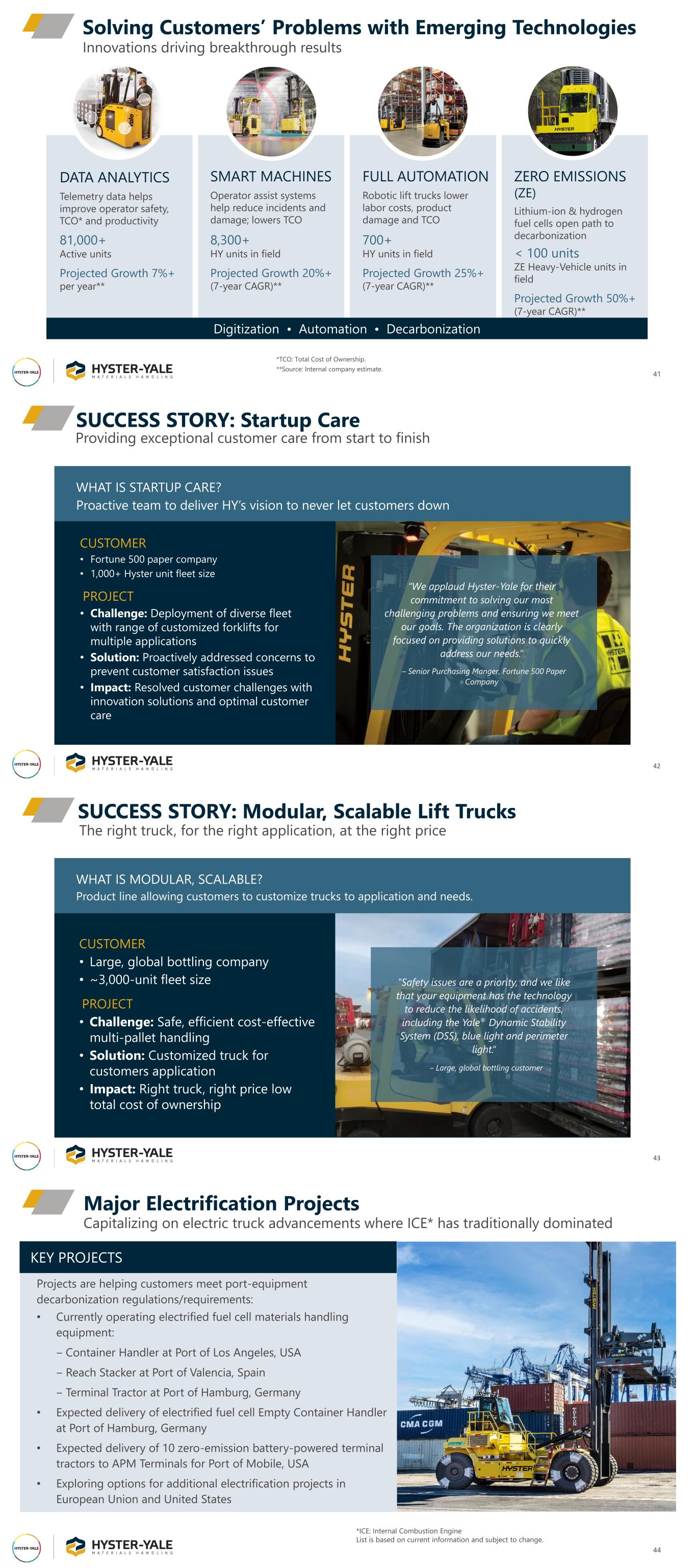 Solving Customers’ Problems with Emerging Technologies 41 Innovations driving breakthrough results DATA ANALYTICS Telemetry data helps improve operator safety, TCO* and productivity 81,000+ Active units Projected Growth 7%+ per year** SMART MACHINES Operator assist systems help reduce incidents and damage; lowers TCO 8,300+ HY units in field Projected Growth 20%+ (7-year CAGR)** FULL AUTOMATION Robotic lift trucks lower labor costs, product damage and TCO 700+ HY units in field Projected Growth 25%+ (7-year CAGR)** ZERO EMISSIONS (ZE) Lithium-ion & hydrogen fuel cells open path to decarbonization < 100 units ZE Heavy-Vehicle units in field Projected Growth 50%+ (7-year CAGR)** Digitization • Automation • Decarbonization *TCO: Total Cost of Ownership. **Source: Internal company estimate. SUCCESS STORY: Startup Care 42 Providing exceptional customer care from start to finish WHAT IS STARTUP CARE? Proactive team to deliver HY’s vision to never let customers down CUSTOMER • Fortune 500 paper company • 1,000+ Hyster unit fleet size PROJECT • Challenge: Deployment of diverse fleet with range of customized forklifts for multiple applications • Solution: Proactively addressed concerns to prevent customer satisfaction issues • Impact: Resolved customer challenges with innovation solutions and optimal customer care “We applaud Hyster-Yale for their commitment to solving our most challenging problems and ensuring we meet our goals. The organization is clearly focused on providing solutions to quickly address our needs.” – Senior Purchasing Manger, Fortune 500 Paper Company SUCCESS STORY: Modular, Scalable Lift Trucks 43 WHAT IS MODULAR, SCALABLE? Product line allowing customers to customize trucks to application and needs. CUSTOMER • Large, global bottling company • ~3,000-unit fleet size PROJECT • Challenge: Safe, efficient cost-effective multi-pallet handling • Solution: Customized truck for customers application • Impact: Right truck, right price low total cost of ownership "Safety issues are a priority, and we like that your equipment has the technology to reduce the likelihood of accidents, including the Yale® Dynamic Stability System (DSS), blue light and perimeter light.“ – Large, global bottling customer The right truck, for the right application, at the right price Capitalizing on electric truck advancements where ICE* has traditionally dominated Major Electrification Projects 44 *ICE: Internal Combustion Engine List is based on current information and subject to change. KEY PROJECTS Projects are helping customers meet port-equipment decarbonization regulations/requirements: • Currently operating electrified fuel cell materials handling equipment: ‒ Container Handler at Port of Los Angeles, USA ‒ Reach Stacker at Port of Valencia, Spain ‒ Terminal Tractor at Port of Hamburg, Germany • Expected delivery of electrified fuel cell Empty Container Handler at Port of Hamburg, Germany • Expected delivery of 10 zero-emission battery-powered terminal tractors to APM Terminals for Port of Mobile, USA • Exploring options for additional electrification projects in European Union and United States