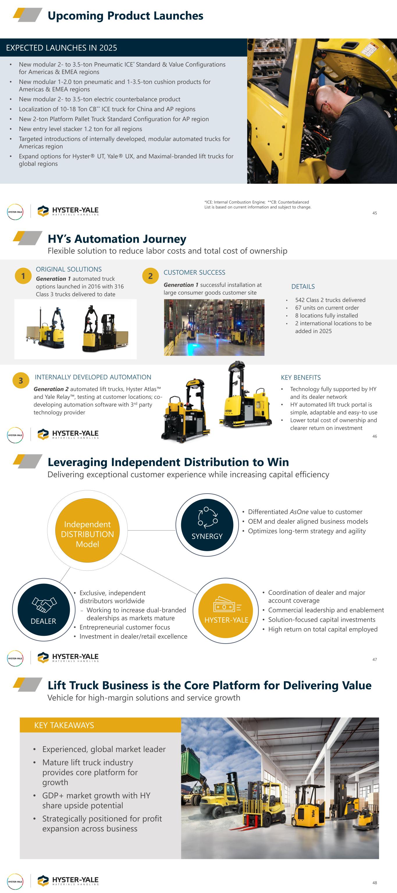 EXPECTED LAUNCHES IN 2025 • New modular 2- to 3.5-ton Pneumatic ICE* Standard & Value Configurations for Americas & EMEA regions • New modular 1-2.0 ton pneumatic and 1-3.5-ton cushion products for Americas & EMEA regions • New modular 2- to 3.5-ton electric counterbalance product • Localization of 10-18 Ton CB** ICE truck for China and AP regions • New 2-ton Platform Pallet Truck Standard Configuration for AP region • New entry level stacker 1.2 ton for all regions • Targeted introductions of internally developed, modular automated trucks for Americas region • Expand options for Hyster® UT, Yale® UX, and Maximal-branded lift trucks for global regions 45 Upcoming Product Launches *ICE: Internal Combustion Engine; **CB: Counterbalanced List is based on current information and subject to change. HY’s Automation Journey 46 Flexible solution to reduce labor costs and total cost of ownership CUSTOMER SUCCESS ORIGINAL SOLUTIONS INTERNALLY DEVELOPED AUTOMATION Generation 2 automated lift trucks, Hyster Atlas and Yale Relay , testing at customer locations; co- developing automation software with 3rd party technology provider Generation 1 automated truck options launched in 2016 with 316 Class 3 trucks delivered to date 2 3 1 Generation 1 successful installation at large consumer goods customer site • 542 Class 2 trucks delivered • 67 units on current order • 8 locations fully installed • 2 international locations to be added in 2025 KEY BENEFITS • Technology fully supported by HY and its dealer network • HY automated lift truck portal is simple, adaptable and easy-to use • Lower total cost of ownership and clearer return on investment DETAILS Leveraging Independent Distribution to Win 47 Delivering exceptional customer experience while increasing capital efficiency Independent DISTRIBUTION Model • Exclusive, independent distributors worldwide ‒ Working to increase dual-branded dealerships as markets mature • Entrepreneurial customer focus • Investment in dealer/retail excellence • Coordination of dealer and major account coverage • Commercial leadership and enablement • Solution-focused capital investments • High return on total capital employed • Differentiated AsOne value to customer • OEM and dealer aligned business models • Optimizes long-term strategy and agility SYNERGY DEALER HYSTER-YALE Lift Truck Business is the Core Platform for Delivering Value 48 Vehicle for high-margin solutions and service growth KEY TAKEAWAYS • Experienced, global market leader • Mature lift truck industry provides core platform for growth • GDP+ market growth with HY share upside potential • Strategically positioned for profit expansion across business