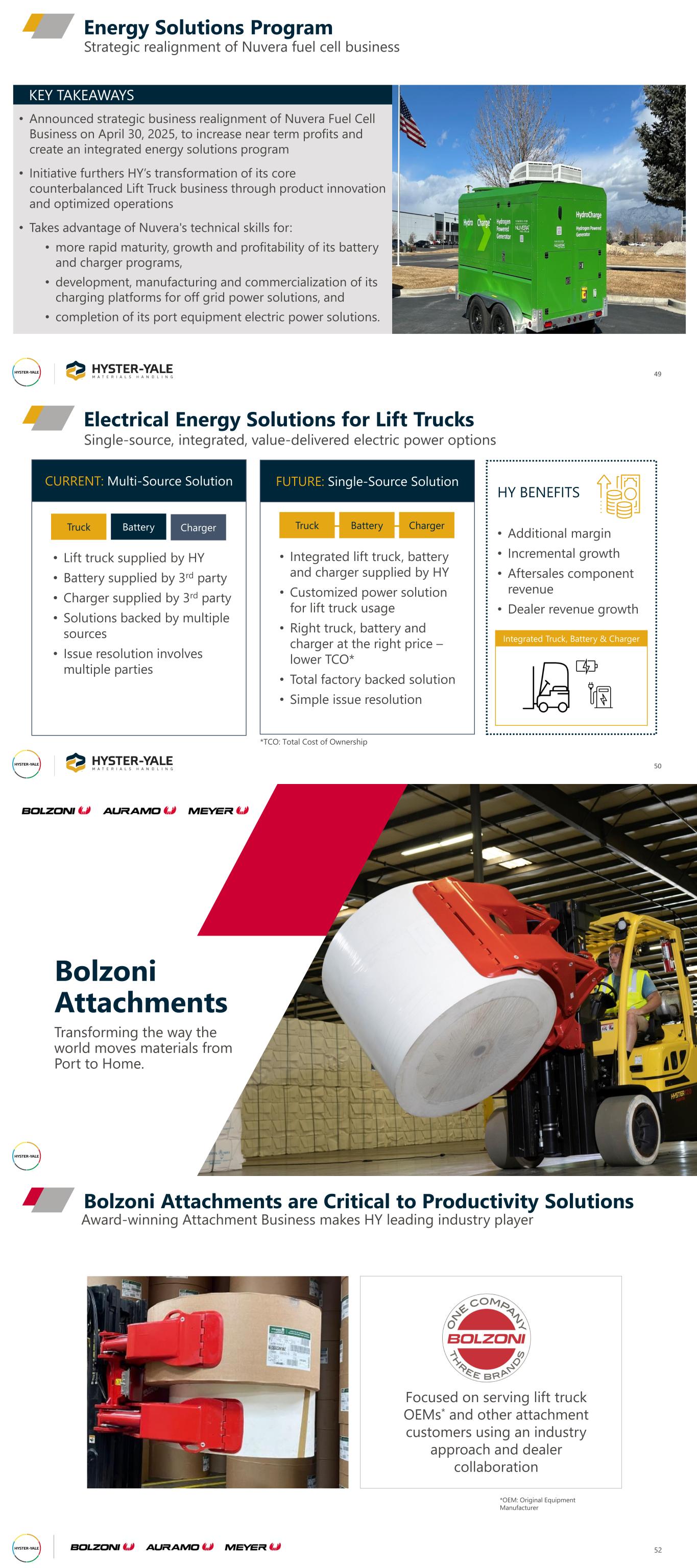 Energy Solutions Program 49 • Announced strategic business realignment of Nuvera Fuel Cell Business on April 30, 2025, to increase near term profits and create an integrated energy solutions program • Initiative furthers HY’s transformation of its core counterbalanced Lift Truck business through product innovation and optimized operations • Takes advantage of Nuvera's technical skills for: • more rapid maturity, growth and profitability of its battery and charger programs, • development, manufacturing and commercialization of its charging platforms for off grid power solutions, and • completion of its port equipment electric power solutions. KEY TAKEAWAYS Strategic realignment of Nuvera fuel cell business Electrical Energy Solutions for Lift Trucks 50 Single-source, integrated, value-delivered electric power options CURRENT: Multi-Source Solution • Lift truck supplied by HY • Battery supplied by 3rd party • Charger supplied by 3rd party • Solutions backed by multiple sources • Issue resolution involves multiple parties FUTURE: Single-Source Solution Truck Battery Charger Truck Battery Charger HY BENEFITS • Additional margin • Incremental growth • Aftersales component revenue • Dealer revenue growth *TCO: Total Cost of Ownership • Integrated lift truck, battery and charger supplied by HY • Customized power solution for lift truck usage • Right truck, battery and charger at the right price – lower TCO* • Total factory backed solution • Simple issue resolution Integrated Truck, Battery & Charger Bolzoni Attachments Need a good Bolzoni photo on a Hyster truck Transforming the way the world moves materials from Port to Home. Award-winning Attachment Business makes HY leading industry player Bolzoni Attachments are Critical to Productivity Solutions 52 Focused on serving lift truck OEMs* and other attachment customers using an industry approach and dealer collaboration *OEM: Original Equipment Manufacturer