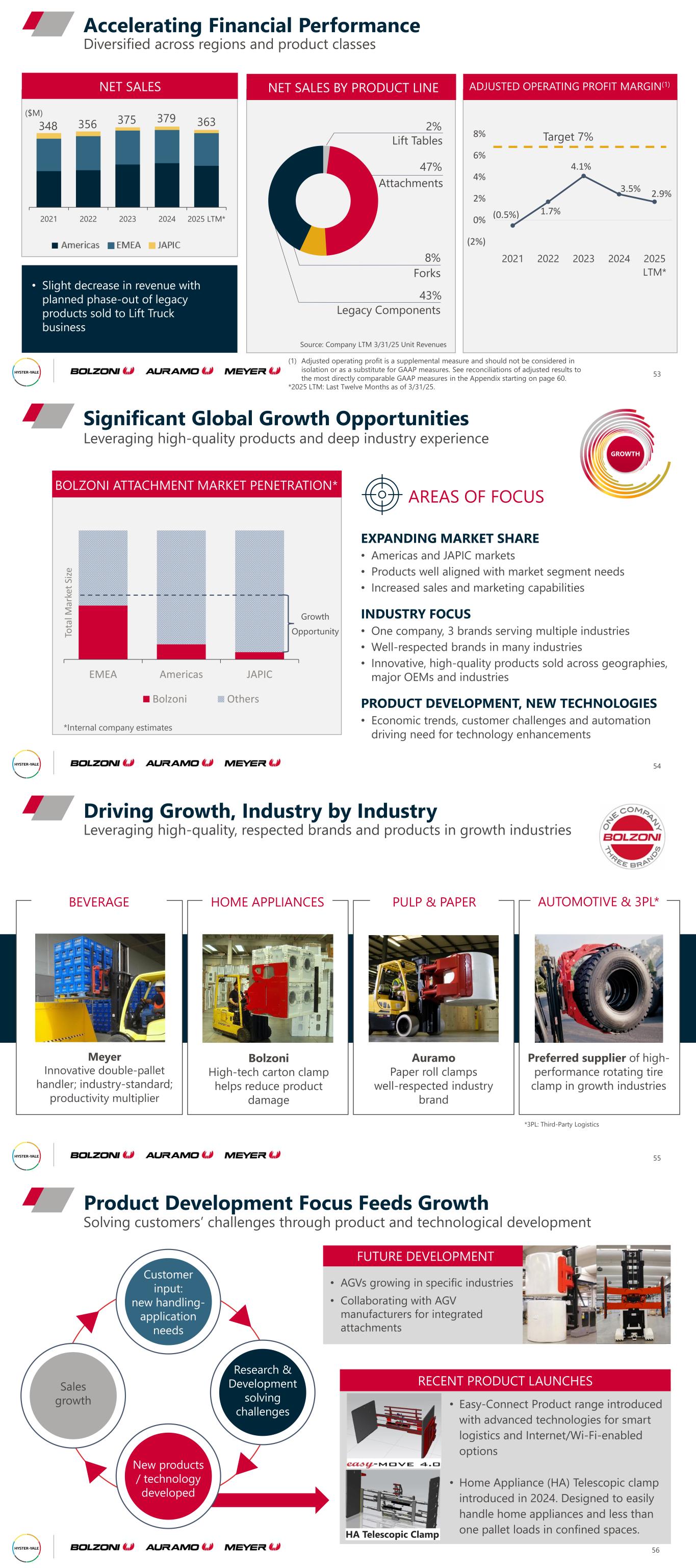 ADJUSTED OPERATING PROFIT MARGIN(1) (0.5%) 1.7% 4.1% 3.5% 2.9% (2%) 0% 2% 4% 6% 8% 2021 2022 2023 2024 2025 LTM* NET SALES BY PRODUCT LINE Diversified across regions and product classes Accelerating Financial Performance 53 NET SALES • Slight decrease in revenue with planned phase-out of legacy products sold to Lift Truck business Target 7% 348 356 375 379 363 2021 2022 2023 2024 2025 LTM* 47% Attachments 2% Lift Tables 8% Forks 43% Legacy Components Source: Company LTM 3/31/25 Unit Revenues ($M) (1) Adjusted operating profit is a supplemental measure and should not be considered in isolation or as a substitute for GAAP measures. See reconciliations of adjusted results to the most directly comparable GAAP measures in the Appendix starting on page 60. *2025 LTM: Last Twelve Months as of 3/31/25. BOLZONI ATTACHMENT MARKET PENETRATION* Leveraging high-quality products and deep industry experience Significant Global Growth Opportunities 54 EMEA Americas JAPIC To ta l M ar ke t Si ze Bolzoni Others AREAS OF FOCUS EXPANDING MARKET SHARE • Americas and JAPIC markets • Products well aligned with market segment needs • Increased sales and marketing capabilities INDUSTRY FOCUS • One company, 3 brands serving multiple industries • Well-respected brands in many industries • Innovative, high-quality products sold across geographies, major OEMs and industries PRODUCT DEVELOPMENT, NEW TECHNOLOGIES • Economic trends, customer challenges and automation driving need for technology enhancements Growth Opportunity *Internal company estimates GROWTH AUTOMOTIVE & 3PL* Preferred supplier of high- performance rotating tire clamp in growth industries PULP & PAPER Auramo Paper roll clamps well-respected industry brand HOME APPLIANCES Bolzoni High-tech carton clamp helps reduce product damage BEVERAGE Meyer Innovative double-pallet handler; industry-standard; productivity multiplier Leveraging high-quality, respected brands and products in growth industries 55 Driving Growth, Industry by Industry *3PL: Third-Party Logistics • Easy-Connect Product range introduced with advanced technologies for smart logistics and Internet/Wi-Fi-enabled options • Home Appliance (HA) Telescopic clamp introduced in 2024. Designed to easily handle home appliances and less than one pallet loads in confined spaces. Solving customers’ challenges through product and technological development Product Development Focus Feeds Growth 56 Sales growth Research & Development solving challenges New products / technology developed Customer input: new handling- application needs • AGVs growing in specific industries • Collaborating with AGV manufacturers for integrated attachments FUTURE DEVELOPMENT RECENT PRODUCT LAUNCHES HA Telescopic Clamp