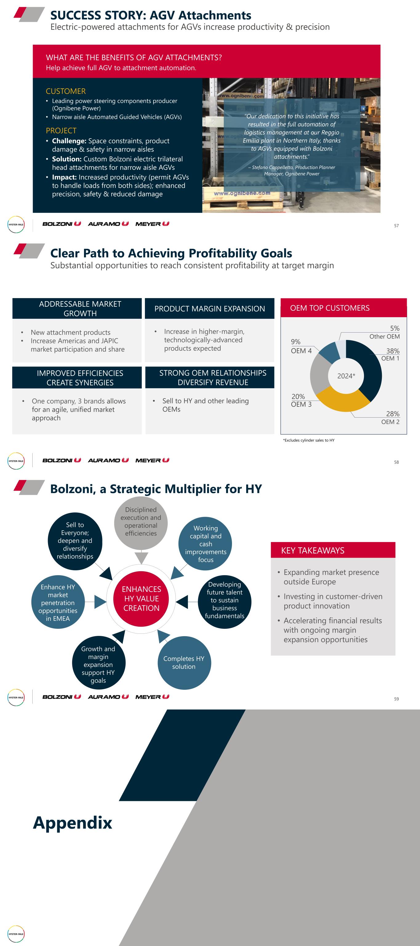 Electric-powered attachments for AGVs increase productivity & precision SUCCESS STORY: AGV Attachments 57 WHAT ARE THE BENEFITS OF AGV ATTACHMENTS? Help achieve full AGV to attachment automation. “Our dedication to this initiative has resulted in the full automation of logistics management at our Reggio Emilia plant in Northern Italy, thanks to AGVs equipped with Bolzoni attachments.” – Stefano Cappelletto, Production Planner Manager, Ognibene Power CUSTOMER • Leading power steering components producer (Ognibene Power) • Narrow aisle Automated Guided Vehicles (AGVs) PROJECT • Challenge: Space constraints, product damage & safety in narrow aisles • Solution: Custom Bolzoni electric trilateral head attachments for narrow aisle AGVs • Impact: Increased productivity (permit AGVs to handle loads from both sides); enhanced precision, safety & reduced damage 28% OEM 2 20% OEM 3 9% OEM 4 Substantial opportunities to reach consistent profitability at target margin Clear Path to Achieving Profitability Goals 58 *Excludes cylinder sales to HY PRODUCT MARGIN EXPANSION IMPROVED EFFICIENCIES CREATE SYNERGIES STRONG OEM RELATIONSHIPS DIVERSIFY REVENUE • New attachment products • Increase Americas and JAPIC market participation and share • One company, 3 brands allows for an agile, unified market approach • Sell to HY and other leading OEMs • Increase in higher-margin, technologically-advanced products expected 2024* 5% Other OEM 38% OEM 1 OEM TOP CUSTOMERS ADDRESSABLE MARKET GROWTH Bolzoni, a Strategic Multiplier for HY 59 KEY TAKEAWAYS • Expanding market presence outside Europe • Investing in customer-driven product innovation • Accelerating financial results with ongoing margin expansion opportunities ENHANCES HY VALUE CREATION Working capital and cash improvements focus Completes HY solution Enhance HY market penetration opportunities in EMEA Developing future talent to sustain business fundamentals Growth and margin expansion support HY goals Sell to Everyone; deepen and diversify relationships Disciplined execution and operational efficiencies Appendix