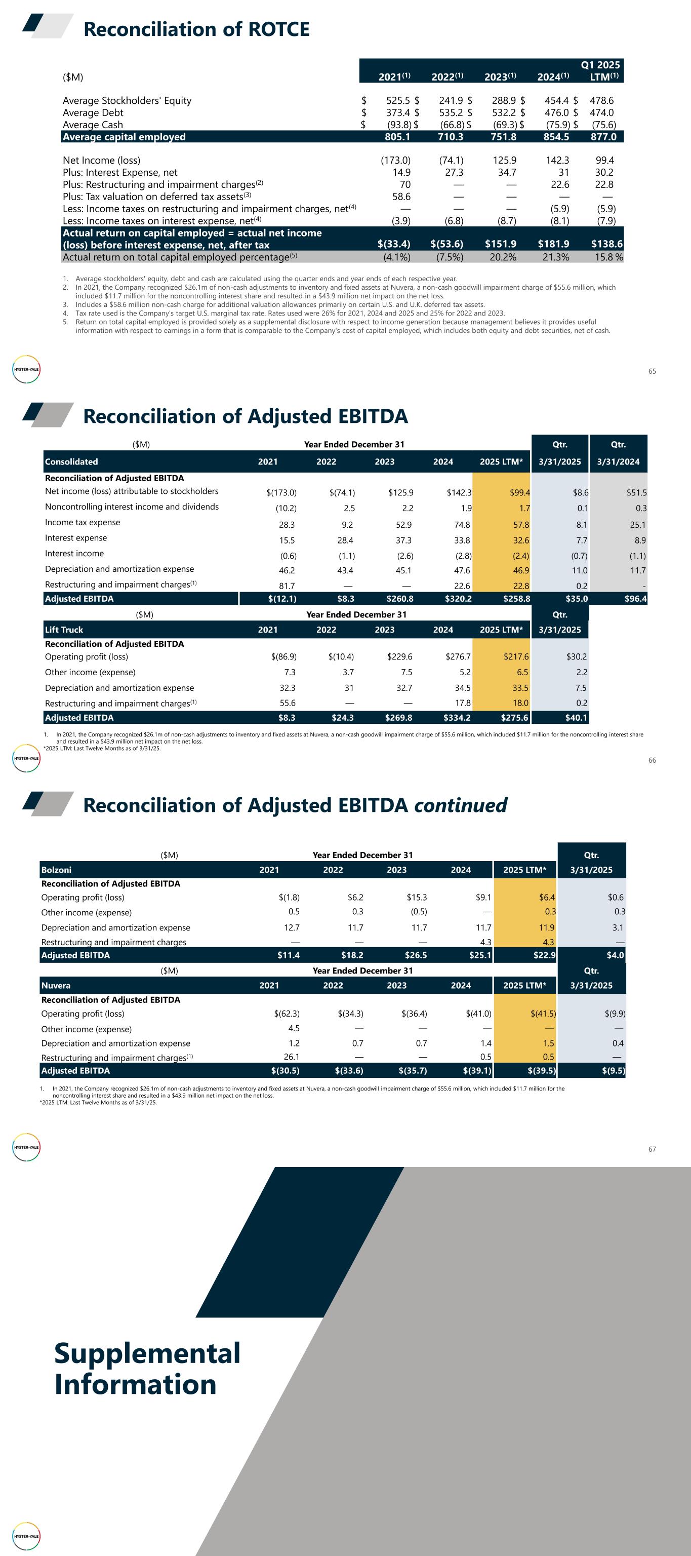 Reconciliation of ROTCE 65 Q1 2025 ($M) 2021(1) 2022(1) 2023(1) 2024(1) LTM(1) Average Stockholders' Equity $ 525.5 $ 241.9 $ 288.9 $ 454.4 $ 478.6 Average Debt $ 373.4 $ 535.2 $ 532.2 $ 476.0 $ 474.0 Average Cash $ (93.8) $ (66.8) $ (69.3) $ (75.9) $ (75.6) Average capital employed 805.1 710.3 751.8 854.5 877.0 Net Income (loss) (173.0) (74.1) 125.9 142.3 99.4 Plus: Interest Expense, net 14.9 27.3 34.7 31 30.2 Plus: Restructuring and impairment charges(2) 70 — — 22.6 22.8 Plus: Tax valuation on deferred tax assets(3) 58.6 — — — — Less: Income taxes on restructuring and impairment charges, net(4) — — — (5.9) (5.9) Less: Income taxes on interest expense, net(4) (3.9) (6.8) (8.7) (8.1) (7.9) Actual return on capital employed = actual net income (loss) before interest expense, net, after tax $(33.4) $(53.6) $151.9 $181.9 $138.6 Actual return on total capital employed percentage(5) (4.1%) (7.5%) 20.2% 21.3% 15.8 % 1. Average stockholders' equity, debt and cash are calculated using the quarter ends and year ends of each respective year. 2. In 2021, the Company recognized $26.1m of non-cash adjustments to inventory and fixed assets at Nuvera, a non-cash goodwill impairment charge of $55.6 million, which included $11.7 million for the noncontrolling interest share and resulted in a $43.9 million net impact on the net loss. 3. Includes a $58.6 million non-cash charge for additional valuation allowances primarily on certain U.S. and U.K. deferred tax assets. 4. Tax rate used is the Company's target U.S. marginal tax rate. Rates used were 26% for 2021, 2024 and 2025 and 25% for 2022 and 2023. 5. Return on total capital employed is provided solely as a supplemental disclosure with respect to income generation because management believes it provides useful information with respect to earnings in a form that is comparable to the Company's cost of capital employed, which includes both equity and debt securities, net of cash. Reconciliation of Adjusted EBITDA 66 ($M) Year Ended December 31 Qtr. Qtr. Consolidated 2021 2022 2023 2024 2025 LTM* 3/31/2025 3/31/2024 Reconciliation of Adjusted EBITDA Net income (loss) attributable to stockholders $(173.0) $(74.1) $125.9 $142.3 $99.4 $8.6 $51.5 Noncontrolling interest income and dividends (10.2) 2.5 2.2 1.9 1.7 0.1 0.3 Income tax expense 28.3 9.2 52.9 74.8 57.8 8.1 25.1 Interest expense 15.5 28.4 37.3 33.8 32.6 7.7 8.9 Interest income (0.6) (1.1) (2.6) (2.8) (2.4) (0.7) (1.1) Depreciation and amortization expense 46.2 43.4 45.1 47.6 46.9 11.0 11.7 Restructuring and impairment charges(1) 81.7 — — 22.6 22.8 0.2 - Adjusted EBITDA $(12.1) $8.3 $260.8 $320.2 $258.8 $35.0 $96.4 ($M) Year Ended December 31 Qtr. Lift Truck 2021 2022 2023 2024 2025 LTM* 3/31/2025 Reconciliation of Adjusted EBITDA Operating profit (loss) $(86.9) $(10.4) $229.6 $276.7 $217.6 $30.2 Other income (expense) 7.3 3.7 7.5 5.2 6.5 2.2 Depreciation and amortization expense 32.3 31 32.7 34.5 33.5 7.5 Restructuring and impairment charges(1) 55.6 — — 17.8 18.0 0.2 Adjusted EBITDA $8.3 $24.3 $269.8 $334.2 $275.6 $40.1 1. In 2021, the Company recognized $26.1m of non-cash adjustments to inventory and fixed assets at Nuvera, a non-cash goodwill impairment charge of $55.6 million, which included $11.7 million for the noncontrolling interest share and resulted in a $43.9 million net impact on the net loss. *2025 LTM: Last Twelve Months as of 3/31/25. Reconciliation of Adjusted EBITDA continued 67 ($M) Year Ended December 31 Qtr. Bolzoni 2021 2022 2023 2024 2025 LTM* 3/31/2025 Reconciliation of Adjusted EBITDA Operating profit (loss) $(1.8) $6.2 $15.3 $9.1 $6.4 $0.6 Other income (expense) 0.5 0.3 (0.5) — 0.3 0.3 Depreciation and amortization expense 12.7 11.7 11.7 11.7 11.9 3.1 Restructuring and impairment charges — — — 4.3 4.3 — Adjusted EBITDA $11.4 $18.2 $26.5 $25.1 $22.9 $4.0 ($M) Year Ended December 31 Qtr. Nuvera 2021 2022 2023 2024 2025 LTM* 3/31/2025 Reconciliation of Adjusted EBITDA Operating profit (loss) $(62.3) $(34.3) $(36.4) $(41.0) $(41.5) $(9.9) Other income (expense) 4.5 — — — — — Depreciation and amortization expense 1.2 0.7 0.7 1.4 1.5 0.4 Restructuring and impairment charges(1) 26.1 — — 0.5 0.5 — Adjusted EBITDA $(30.5) $(33.6) $(35.7) $(39.1) $(39.5) $(9.5) 1. In 2021, the Company recognized $26.1m of non-cash adjustments to inventory and fixed assets at Nuvera, a non-cash goodwill impairment charge of $55.6 million, which included $11.7 million for the noncontrolling interest share and resulted in a $43.9 million net impact on the net loss. *2025 LTM: Last Twelve Months as of 3/31/25. Supplemental Information