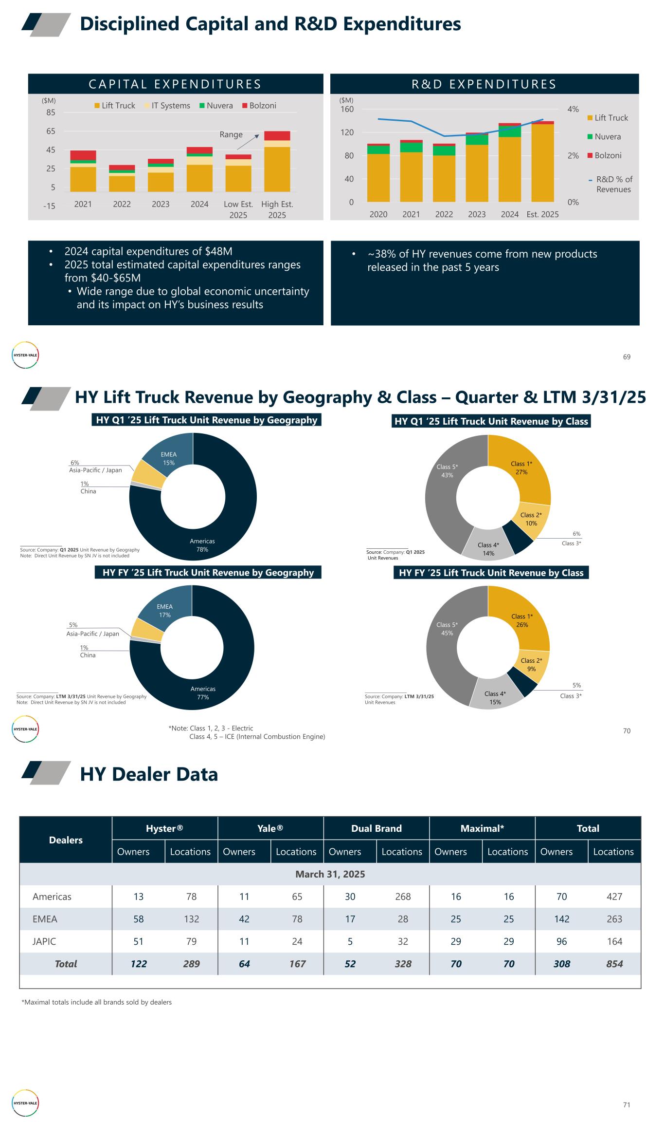 Disciplined Capital and R&D Expenditures 69 -15 5 25 45 65 85 2021 2022 2023 2024 Low Est. 2025 High Est. 2025 Lift Truck IT Systems Nuvera Bolzoni C A P I TA L E X P E N D I T U R E S R & D E X P E N D I T U R E S 0% 2% 4% 0 40 80 120 160 2020 2021 2022 2023 2024 Est. 2025 Lift Truck Nuvera Bolzoni ($M) ($M) • ~38% of HY revenues come from new products released in the past 5 years R&D % of Revenues • 2024 capital expenditures of $48M • 2025 total estimated capital expenditures ranges from $40-$65M • Wide range due to global economic uncertainty and its impact on HY’s business results Range Americas 78% EMEA 15% Class 1* 27% Class 2* 10% Class 4* 14% Class 5* 43% _____________________ Source: Company: Q1 2025 Unit Revenues Americas 77% EMEA 17% HY Lift Truck Revenue by Geography & Class – Quarter & LTM 3/31/25 70 Class 1* 26% Class 2* 9% Class 4* 15% Class 5* 45% 5% Class 3* _____________________ Source: Company: LTM 3/31/25 Unit Revenues _____________________ Source: Company: LTM 3/31/25 Unit Revenue by Geography Note: Direct Unit Revenue by SN JV is not included HY Q1 ‘25 Lift Truck Unit Revenue by ClassHY Q1 ’25 Lift Truck Unit Revenue by Geography HY FY ’25 Lift Truck Unit Revenue by Geography HY FY ’25 Lift Truck Unit Revenue by Class 5% Asia-Pacific / Japan 6% Asia-Pacific / Japan *Note: Class 1, 2, 3 - Electric Class 4, 5 – ICE (Internal Combustion Engine) 6% Class 3* _____________________ Source: Company: Q1 2025 Unit Revenue by Geography Note: Direct Unit Revenue by SN JV is not included China 1% China 1% HY Dealer Data 71 Dealers Hyster® Yale® Dual Brand Maximal* Total Owners Locations Owners Locations Owners Locations Owners Locations Owners Locations March 31, 2025 Americas 13 78 11 65 30 268 16 16 70 427 EMEA 58 132 42 78 17 28 25 25 142 263 JAPIC 51 79 11 24 5 32 29 29 96 164 Total 122 289 64 167 52 328 70 70 308 854 *Maximal totals include all brands sold by dealers