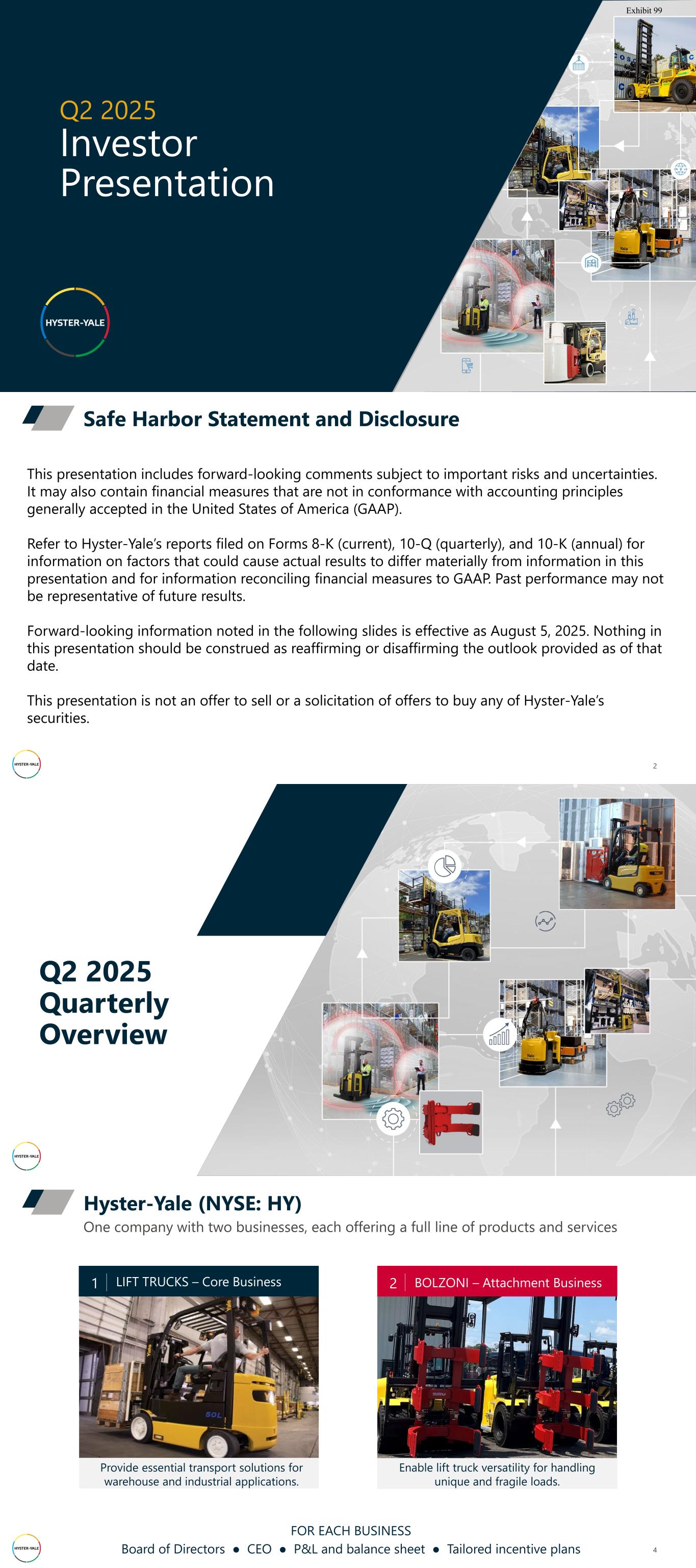 Q2 2025 Investor Presentation Exhibit 99 This presentation includes forward-looking comments subject to important risks and uncertainties. It may also contain financial measures that are not in conformance with accounting principles generally accepted in the United States of America (GAAP). Refer to Hyster-Yale’s reports filed on Forms 8-K (current), 10-Q (quarterly), and 10-K (annual) for information on factors that could cause actual results to differ materially from information in this presentation and for information reconciling financial measures to GAAP. Past performance may not be representative of future results. Forward-looking information noted in the following slides is effective as August 5, 2025. Nothing in this presentation should be construed as reaffirming or disaffirming the outlook provided as of that date. This presentation is not an offer to sell or a solicitation of offers to buy any of Hyster-Yale’s securities. Safe Harbor Statement and Disclosure 2 Q2 2025 Quarterly Overview 4 One company with two businesses, each offering a full line of products and services Hyster-Yale (NYSE: HY) Enable lift truck versatility for handling unique and fragile loads. Provide essential transport solutions for warehouse and industrial applications. LIFT TRUCKS – Core Business1 BOLZONI – Attachment Business2 FOR EACH BUSINESS Board of Directors ● CEO ● P&L and balance sheet ● Tailored incentive plans