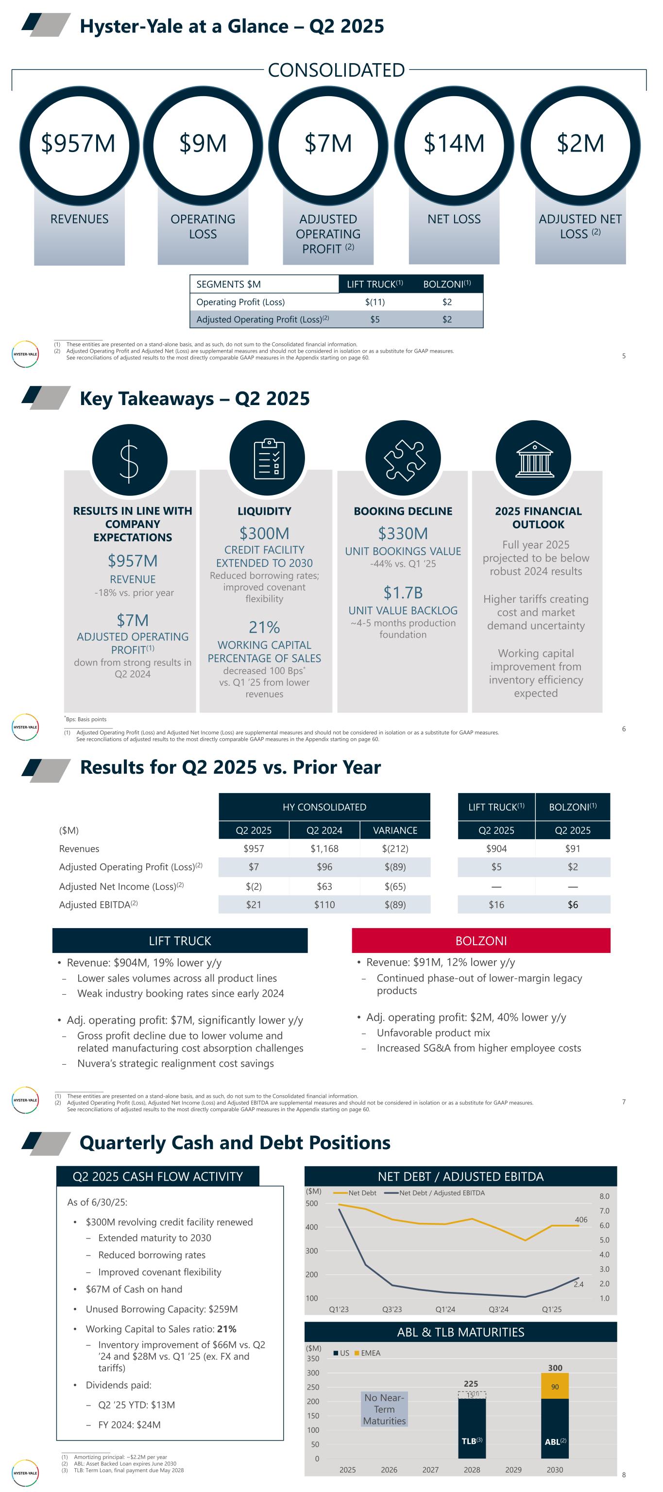 5 Hyster-Yale at a Glance – Q2 2025 $957M CONSOLIDATED SEGMENTS $M LIFT TRUCK(1) BOLZONI(1) Operating Profit (Loss) $(11) $2 Adjusted Operating Profit (Loss)(2) $5 $2 _____________________ (1) These entities are presented on a stand-alone basis, and as such, do not sum to the Consolidated financial information. (2) Adjusted Operating Profit and Adjusted Net (Loss) are supplemental measures and should not be considered in isolation or as a substitute for GAAP measures. See reconciliations of adjusted results to the most directly comparable GAAP measures in the Appendix starting on page 60. $9M $7M $14M $2M REVENUES OPERATING LOSS ADJUSTED OPERATING PROFIT (2) NET LOSS ADJUSTED NET LOSS (2) Key Takeaways – Q2 2025 6 2025 FINANCIAL OUTLOOK LIQUIDITY $300M CREDIT FACILITY EXTENDED TO 2030 Reduced borrowing rates; improved covenant flexibility 21% WORKING CAPITAL PERCENTAGE OF SALES decreased 100 Bps* vs. Q1 ’25 from lower revenues BOOKING DECLINE $330M UNIT BOOKINGS VALUE -44% vs. Q1 ‘25 $1.7B UNIT VALUE BACKLOG ~4-5 months production foundation RESULTS IN LINE WITH COMPANY EXPECTATIONS $957M REVENUE -18% vs. prior year $7M ADJUSTED OPERATING PROFIT(1) down from strong results in Q2 2024 *Bps: Basis points _____________________ (1) Adjusted Operating Profit (Loss) and Adjusted Net Income (Loss) are supplemental measures and should not be considered in isolation or as a substitute for GAAP measures. See reconciliations of adjusted results to the most directly comparable GAAP measures in the Appendix starting on page 60. Full year 2025 projected to be below robust 2024 results Higher tariffs creating cost and market demand uncertainty Working capital improvement from inventory efficiency expected HY CONSOLIDATED LIFT TRUCK(1) BOLZONI(1) ($M) Q2 2025 Q2 2024 VARIANCE Q2 2025 Q2 2025 Revenues $957 $1,168 $(212) $904 $91 Adjusted Operating Profit (Loss)(2) $7 $96 $(89) $5 $2 Adjusted Net Income (Loss)(2) $(2) $63 $(65) — — Adjusted EBITDA(2) $21 $110 $(89) $16 $6 Results for Q2 2025 vs. Prior Year 7 _____________________ (1) These entities are presented on a stand-alone basis, and as such, do not sum to the Consolidated financial information. (2) Adjusted Operating Profit (Loss), Adjusted Net Income (Loss) and Adjusted EBITDA are supplemental measures and should not be considered in isolation or as a substitute for GAAP measures. See reconciliations of adjusted results to the most directly comparable GAAP measures in the Appendix starting on page 60. LIFT TRUCK • Revenue: $904M, 19% lower y/y ‒ Lower sales volumes across all product lines ‒ Weak industry booking rates since early 2024 • Adj. operating profit: $7M, significantly lower y/y ‒ Gross profit decline due to lower volume and related manufacturing cost absorption challenges ‒ Nuvera’s strategic realignment cost savings BOLZONI • Revenue: $91M, 12% lower y/y ‒ Continued phase-out of lower-margin legacy products • Adj. operating profit: $2M, 40% lower y/y ‒ Unfavorable product mix ‒ Increased SG&A from higher employee costs Quarterly Cash and Debt Positions 8 As of 6/30/25: • $300M revolving credit facility renewed ‒ Extended maturity to 2030 ‒ Reduced borrowing rates ‒ Improved covenant flexibility • $67M of Cash on hand • Unused Borrowing Capacity: $259M • Working Capital to Sales ratio: 21% ‒ Inventory improvement of $66M vs. Q2 ’24 and $28M vs. Q1 ’25 (ex. FX and tariffs) • Dividends paid: ‒ Q2 ’25 YTD: $13M ‒ FY 2024: $24M Q2 2025 CASH FLOW ACTIVITY 406 2.4 1.0 2.0 3.0 4.0 5.0 6.0 7.0 8.0 100 200 300 400 500 Q1'23 Q3'23 Q1'24 Q3'24 Q1'25 Net Debt Net Debt / Adjusted EBITDA NET DEBT / ADJUSTED EBITDA ($M) 0 50 100 150 200 250 300 350 2025 2026 2027 2028 2029 2030 US EMEA 15(1) 225 TLB(3) 300 ABL(2) 90 ABL & TLB MATURITIES ($M) _____________________ (1) Amortizing principal: ~$2.2M per year (2) ABL: Asset Backed Loan expires June 2030 (3) TLB: Term Loan, final payment due May 2028 No Near- Term Maturities