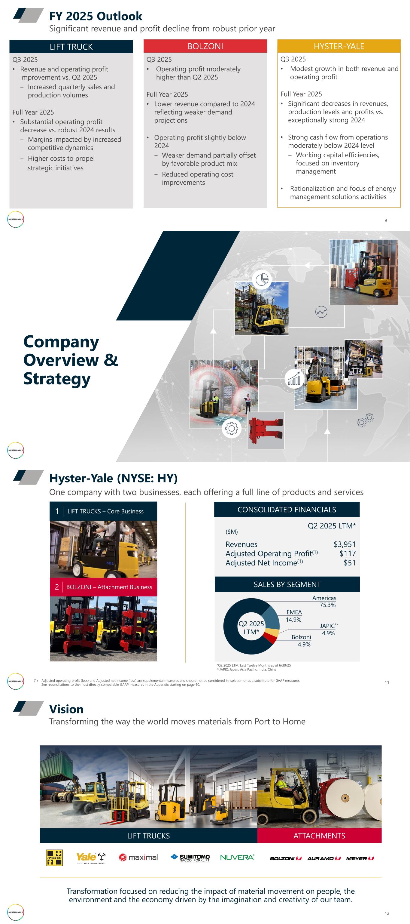 9 Significant revenue and profit decline from robust prior year FY 2025 Outlook Q3 2025 • Operating profit moderately higher than Q2 2025 Full Year 2025 • Lower revenue compared to 2024 reflecting weaker demand projections • Operating profit slightly below 2024 ‒ Weaker demand partially offset by favorable product mix ‒ Reduced operating cost improvements BOLZONI Q3 2025 • Revenue and operating profit improvement vs. Q2 2025 ‒ Increased quarterly sales and production volumes Full Year 2025 • Substantial operating profit decrease vs. robust 2024 results ‒ Margins impacted by increased competitive dynamics ‒ Higher costs to propel strategic initiatives LIFT TRUCK HYSTER-YALE Q3 2025 • Modest growth in both revenue and operating profit Full Year 2025 • Significant decreases in revenues, production levels and profits vs. exceptionally strong 2024 • Strong cash flow from operations moderately below 2024 level ‒ Working capital efficiencies, focused on inventory management • Rationalization and focus of energy management solutions activities Company Overview & Strategy Hyster-Yale (NYSE: HY) One company with two businesses, each offering a full line of products and services 11 *Q2 2025 LTM: Last Twelve Months as of 6/30/25 **JAPIC: Japan, Asia Pacific, India, China ($M) CONSOLIDATED FINANCIALS Revenues Adjusted Operating Profit(1) Adjusted Net Income(1) SALES BY SEGMENT EMEA 14.9% Americas 75.3% Bolzoni 4.9% JAPIC** 4.9% _____________________ (1) Adjusted operating profit (loss) and Adjusted net income (loss) are supplemental measures and should not be considered in isolation or as a substitute for GAAP measures. See reconciliations to the most directly comparable GAAP measures in the Appendix starting on page 60. Q2 2025 LTM* $3,951 $117 $51 BOLZONI – Attachment Business2 LIFT TRUCKS – Core Business1 Q2 2025 LTM* 12 Transforming the way the world moves materials from Port to Home Vision LIFT TRUCKS ATTACHMENTS Transformation focused on reducing the impact of material movement on people, the environment and the economy driven by the imagination and creativity of our team.