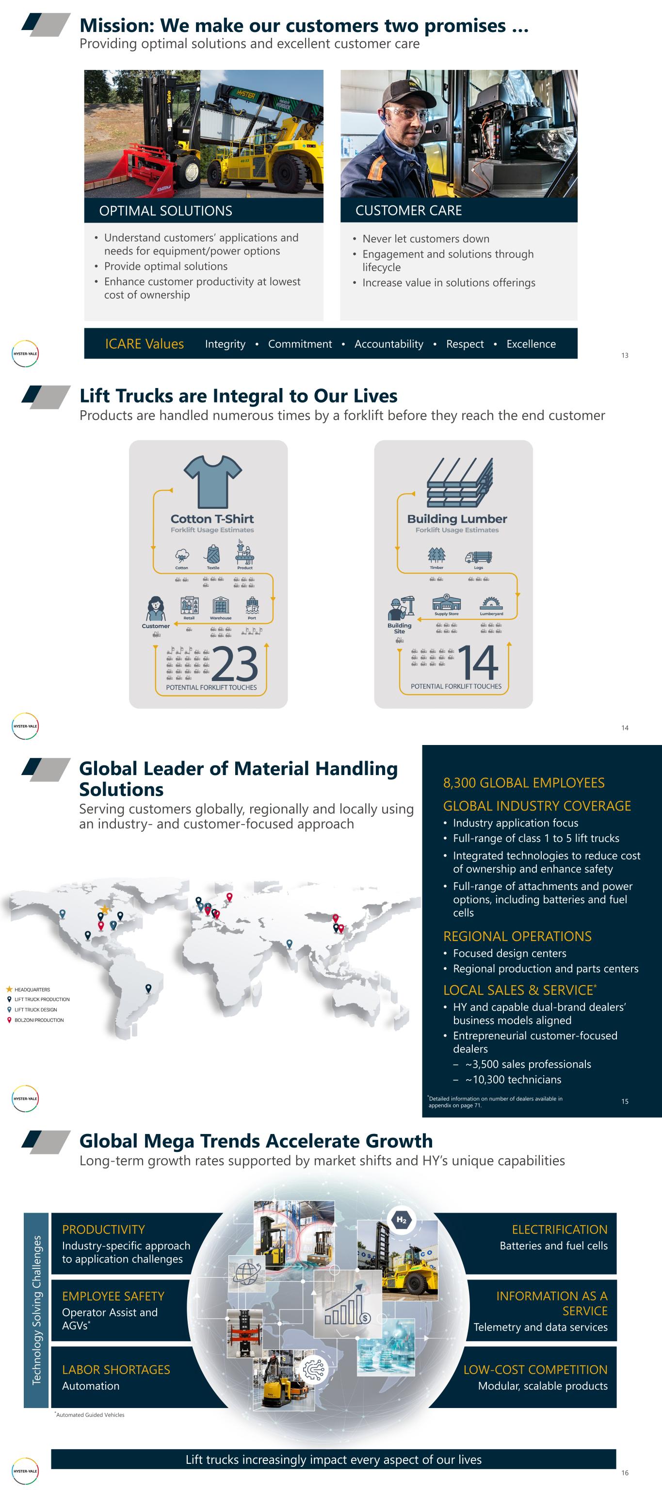 13 Mission: We make our customers two promises … Providing optimal solutions and excellent customer care • Understand customers’ applications and needs for equipment/power options • Provide optimal solutions • Enhance customer productivity at lowest cost of ownership OPTIMAL SOLUTIONS • Never let customers down • Engagement and solutions through lifecycle • Increase value in solutions offerings CUSTOMER CARE Integrity • Commitment • Accountability • Respect • ExcellenceICARE Values 14 Products are handled numerous times by a forklift before they reach the end customer Lift Trucks are Integral to Our Lives 15 8,300 GLOBAL EMPLOYEES GLOBAL INDUSTRY COVERAGE • Industry application focus • Full-range of class 1 to 5 lift trucks • Integrated technologies to reduce cost of ownership and enhance safety • Full-range of attachments and power options, including batteries and fuel cells REGIONAL OPERATIONS • Focused design centers • Regional production and parts centers LOCAL SALES & SERVICE* • HY and capable dual-brand dealers’ business models aligned • Entrepreneurial customer-focused dealers ‒ ~3,500 sales professionals ‒ ~10,300 technicians *Detailed information on number of dealers available in appendix on page 71. Serving customers globally, regionally and locally using an industry- and customer-focused approach Global Leader of Material Handling Solutions 16 Global Mega Trends Accelerate Growth Long-term growth rates supported by market shifts and HY’s unique capabilities ELECTRIFICATION Batteries and fuel cells INFORMATION AS A SERVICE Telemetry and data services LOW-COST COMPETITION Modular, scalable productsTe ch no lo gy S ol vi ng C ha lle ng es *Automated Guided Vehicles Lift trucks increasingly impact every aspect of our lives PRODUCTIVITY Industry-specific approach to application challenges EMPLOYEE SAFETY Operator Assist and AGVs* LABOR SHORTAGES Automation