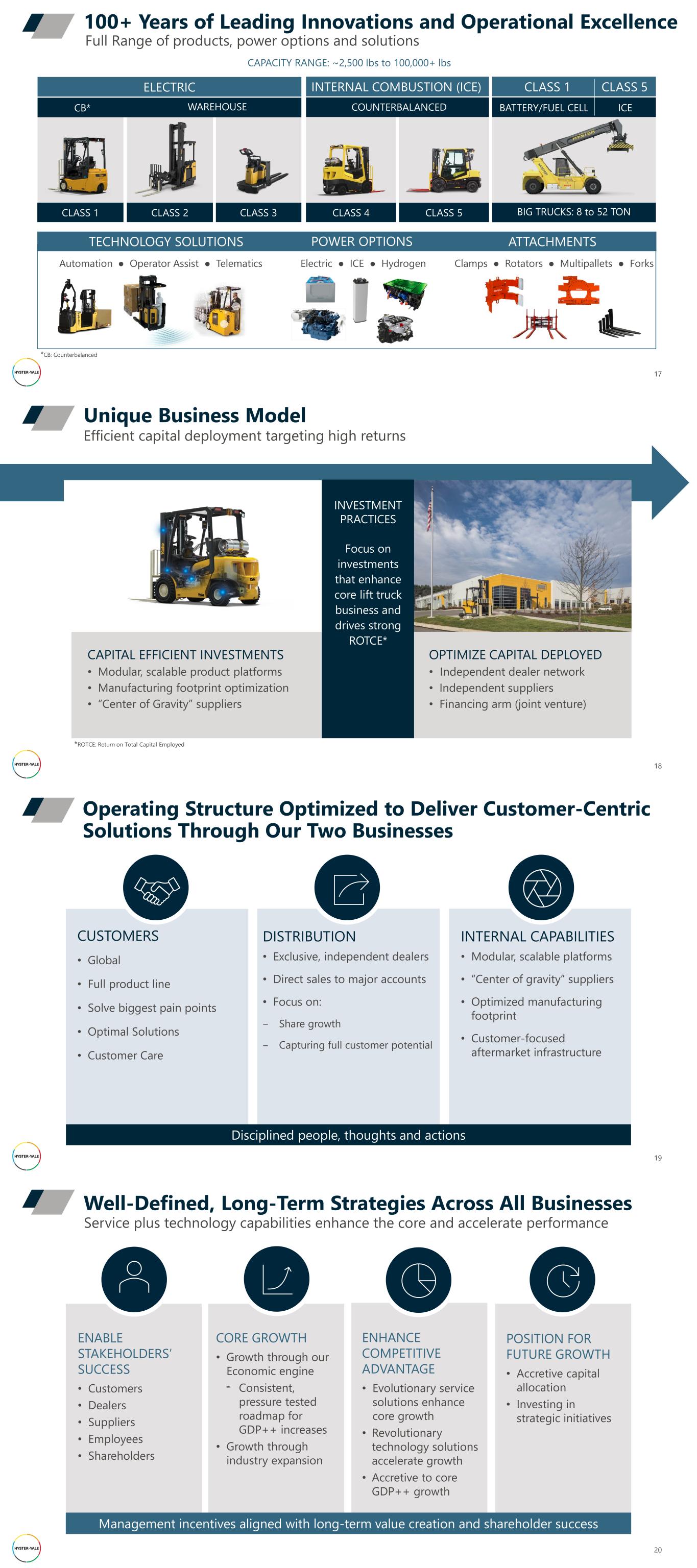 17 Electric ● ICE ● Hydrogen 100+ Years of Leading Innovations and Operational Excellence CLASS 1 CLASS 2 CLASS 3 CB* WAREHOUSE ELECTRIC CLASS 4 CLASS 5 COUNTERBALANCED INTERNAL COMBUSTION (ICE) BIG TRUCKS: 8 to 52 TON BATTERY/FUEL CELL ICE CLASS 1 CLASS 5 Clamps ● Rotators ● Multipallets ● ForksAutomation ● Operator Assist ● Telematics TECHNOLOGY SOLUTIONS POWER OPTIONS ATTACHMENTS Full Range of products, power options and solutions CAPACITY RANGE: ~2,500 lbs to 100,000+ lbs *CB: Counterbalanced 18 Efficient capital deployment targeting high returns Unique Business Model OPTIMIZE CAPITAL DEPLOYED • Independent dealer network • Independent suppliers • Financing arm (joint venture) CAPITAL EFFICIENT INVESTMENTS • Modular, scalable product platforms • Manufacturing footprint optimization • “Center of Gravity” suppliers INVESTMENT PRACTICES Focus on investments that enhance core lift truck business and drives strong ROTCE* *ROTCE: Return on Total Capital Employed 19 Operating Structure Optimized to Deliver Customer-Centric Solutions Through Our Two Businesses CUSTOMERS • Global • Full product line • Solve biggest pain points • Optimal Solutions • Customer Care Disciplined people, thoughts and actions DISTRIBUTION • Exclusive, independent dealers • Direct sales to major accounts • Focus on: ‒ Share growth ‒ Capturing full customer potential INTERNAL CAPABILITIES • Modular, scalable platforms • “Center of gravity” suppliers • Optimized manufacturing footprint • Customer-focused aftermarket infrastructure 20 Service plus technology capabilities enhance the core and accelerate performance Well-Defined, Long-Term Strategies Across All Businesses ENABLE STAKEHOLDERS’ SUCCESS • Customers • Dealers • Suppliers • Employees • Shareholders Management incentives aligned with long-term value creation and shareholder success CORE GROWTH • Growth through our Economic engine - Consistent, pressure tested roadmap for GDP++ increases • Growth through industry expansion ENHANCE COMPETITIVE ADVANTAGE • Evolutionary service solutions enhance core growth • Revolutionary technology solutions accelerate growth • Accretive to core GDP++ growth POSITION FOR FUTURE GROWTH • Accretive capital allocation • Investing in strategic initiatives