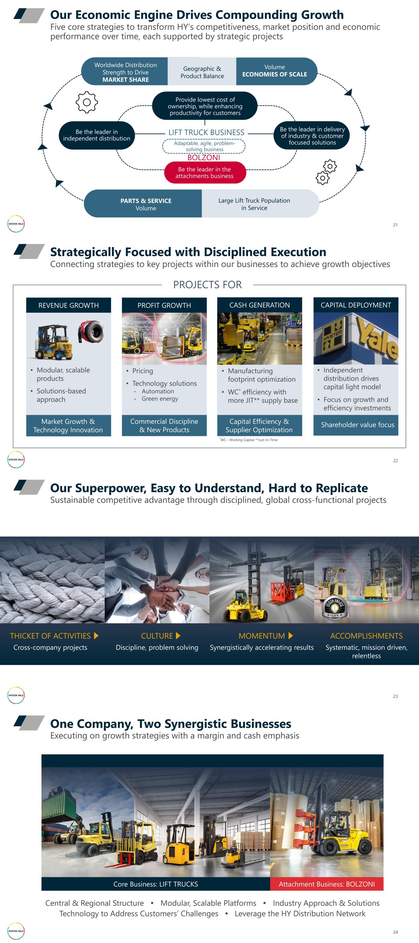 Be the leader in independent distribution LIFT TRUCK BUSINESS Five core strategies to transform HY’s competitiveness, market position and economic performance over time, each supported by strategic projects Our Economic Engine Drives Compounding Growth 21 Provide lowest cost of ownership, while enhancing productivity for customers Be the leader in the attachments business BOLZONI Worldwide Distribution Strength to Drive MARKET SHARE Volume ECONOMIES OF SCALE Geographic & Product Balance PARTS & SERVICE Volume Large Lift Truck Population in Service Be the leader in delivery of industry & customer focused solutionsAdaptable, agile, problem- solving business 22 Commercial Discipline & New Products • Pricing • Technology solutions - Automation - Green energy REVENUE GROWTH Market Growth & Technology Innovation • Modular, scalable products • Solutions-based approach Strategically Focused with Disciplined Execution Capital Efficiency & Supplier Optimization • Manufacturing footprint optimization • WC* efficiency with more JIT** supply base Shareholder value focus • Independent distribution drives capital light model • Focus on growth and efficiency investments PROFIT GROWTH CAPITAL DEPLOYMENTCASH GENERATION Connecting strategies to key projects within our businesses to achieve growth objectives PROJECTS FOR *WC – Working Capital **Just-In-Time 23 Sustainable competitive advantage through disciplined, global cross-functional projects Our Superpower, Easy to Understand, Hard to Replicate THICKET OF ACTIVITIES Cross-company projects CULTURE Discipline, problem solving MOMENTUM Synergistically accelerating results ACCOMPLISHMENTS Systematic, mission driven, relentless One Company, Two Synergistic Businesses 24 Executing on growth strategies with a margin and cash emphasis Core Business: LIFT TRUCKS Central & Regional Structure • Modular, Scalable Platforms • Industry Approach & Solutions Technology to Address Customers’ Challenges • Leverage the HY Distribution Network Attachment Business: BOLZONI