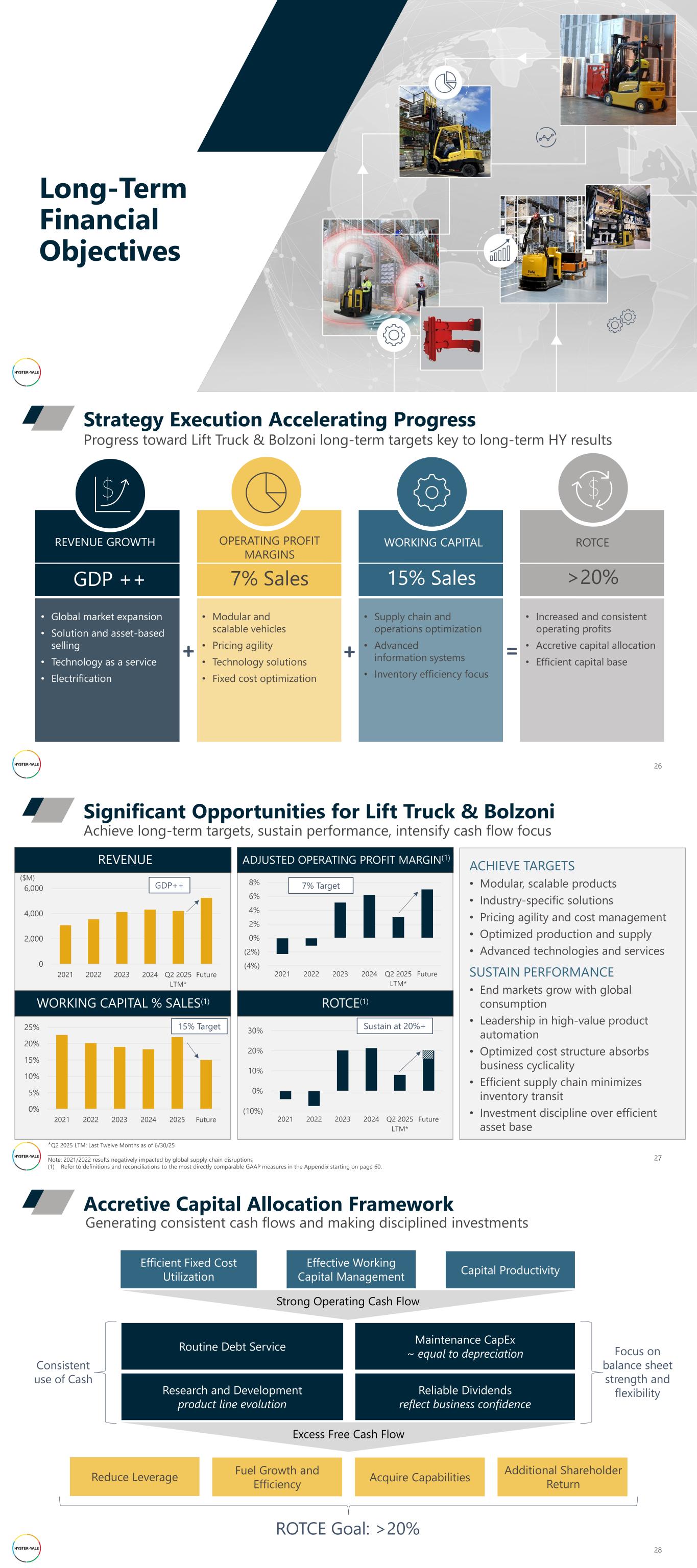 Long-Term Financial Objectives REVENUE GROWTH GDP ++ • Global market expansion • Solution and asset-based selling • Technology as a service • Electrification OPERATING PROFIT MARGINS 7% Sales • Modular and scalable vehicles • Pricing agility • Technology solutions • Fixed cost optimization WORKING CAPITAL 15% Sales • Supply chain and operations optimization • Advanced information systems • Inventory efficiency focus ROTCE >20% • Increased and consistent operating profits • Accretive capital allocation • Efficient capital base 26 Progress toward Lift Truck & Bolzoni long-term targets key to long-term HY results Strategy Execution Accelerating Progress + + = 27 Achieve long-term targets, sustain performance, intensify cash flow focus Significant Opportunities for Lift Truck & Bolzoni REVENUE WORKING CAPITAL % SALES(1) ADJUSTED OPERATING PROFIT MARGIN(1) ROTCE(1) ACHIEVE TARGETS • Modular, scalable products • Industry-specific solutions • Pricing agility and cost management • Optimized production and supply • Advanced technologies and services SUSTAIN PERFORMANCE • End markets grow with global consumption • Leadership in high-value product automation • Optimized cost structure absorbs business cyclicality • Efficient supply chain minimizes inventory transit • Investment discipline over efficient asset base 0 2,000 4,000 6,000 2021 2022 2023 2024 Q2 2025 LTM* Future GDP++ ($M) (4%) (2%) 0% 2% 4% 6% 8% 2021 2022 2023 2024 Q2 2025 LTM* Future 7% Target (10%) 0% 10% 20% 30% 2021 2022 2023 2024 Q2 2025 LTM* Future Sustain at 20%+ *Q2 2025 LTM: Last Twelve Months as of 6/30/25 _____________________ Note: 2021/2022 results negatively impacted by global supply chain disruptions (1) Refer to definitions and reconciliations to the most directly comparable GAAP measures in the Appendix starting on page 60. 0% 5% 10% 15% 20% 25% 2021 2022 2023 2024 2025 Future 15% Target 28 Generating consistent cash flows and making disciplined investments Accretive Capital Allocation Framework Efficient Fixed Cost Utilization Effective Working Capital Management Capital Productivity Reduce Leverage Fuel Growth and Efficiency Acquire Capabilities Routine Debt Service Maintenance CapEx ~ equal to depreciation Research and Development product line evolution Reliable Dividends reflect business confidence Strong Operating Cash Flow Excess Free Cash Flow Consistent use of Cash Focus on balance sheet strength and flexibility ROTCE Goal: >20% Additional Shareholder Return