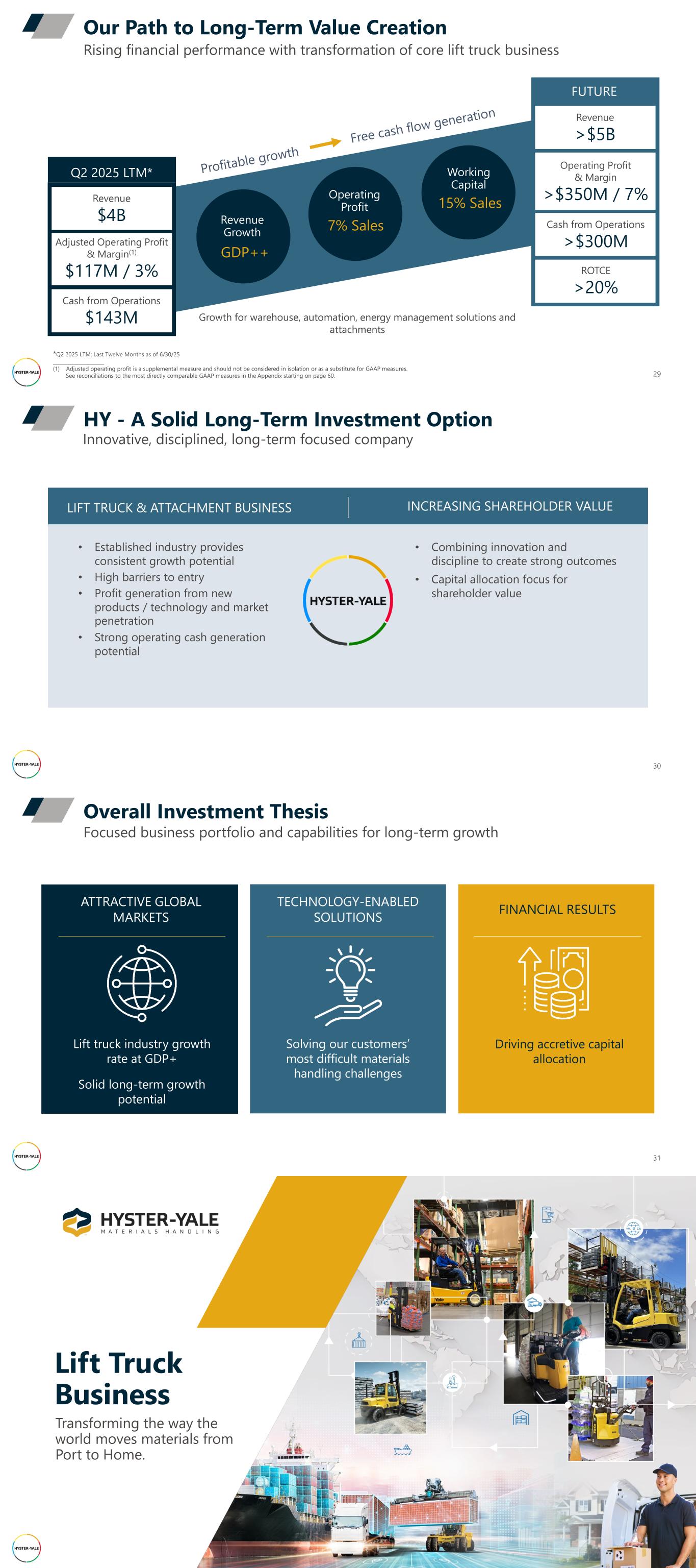 Rising financial performance with transformation of core lift truck business Our Path to Long-Term Value Creation Adjusted Operating Profit & Margin(1) $117M / 3% Revenue $4B Cash from Operations $143M Q2 2025 LTM* Operating Profit & Margin >$350M / 7% Revenue >$5B Cash from Operations >$300M FUTURE ROTCE >20% Revenue Growth GDP++ Operating Profit 7% Sales Working Capital 15% Sales 29 *Q2 2025 LTM: Last Twelve Months as of 6/30/25 _____________________ (1) Adjusted operating profit is a supplemental measure and should not be considered in isolation or as a substitute for GAAP measures. See reconciliations to the most directly comparable GAAP measures in the Appendix starting on page 60. Growth for warehouse, automation, energy management solutions and attachments 30 Innovative, disciplined, long-term focused company HY - A Solid Long-Term Investment Option • Established industry provides consistent growth potential • High barriers to entry • Profit generation from new products / technology and market penetration • Strong operating cash generation potential • Combining innovation and discipline to create strong outcomes • Capital allocation focus for shareholder value LIFT TRUCK & ATTACHMENT BUSINESS INCREASING SHAREHOLDER VALUE 31 Focused business portfolio and capabilities for long-term growth Overall Investment Thesis ATTRACTIVE GLOBAL MARKETS TECHNOLOGY-ENABLED SOLUTIONS FINANCIAL RESULTS Lift truck industry growth rate at GDP+ Solid long-term growth potential Solving our customers’ most difficult materials handling challenges Driving accretive capital allocation Lift Truck Business Transforming the way the world moves materials from Port to Home.
