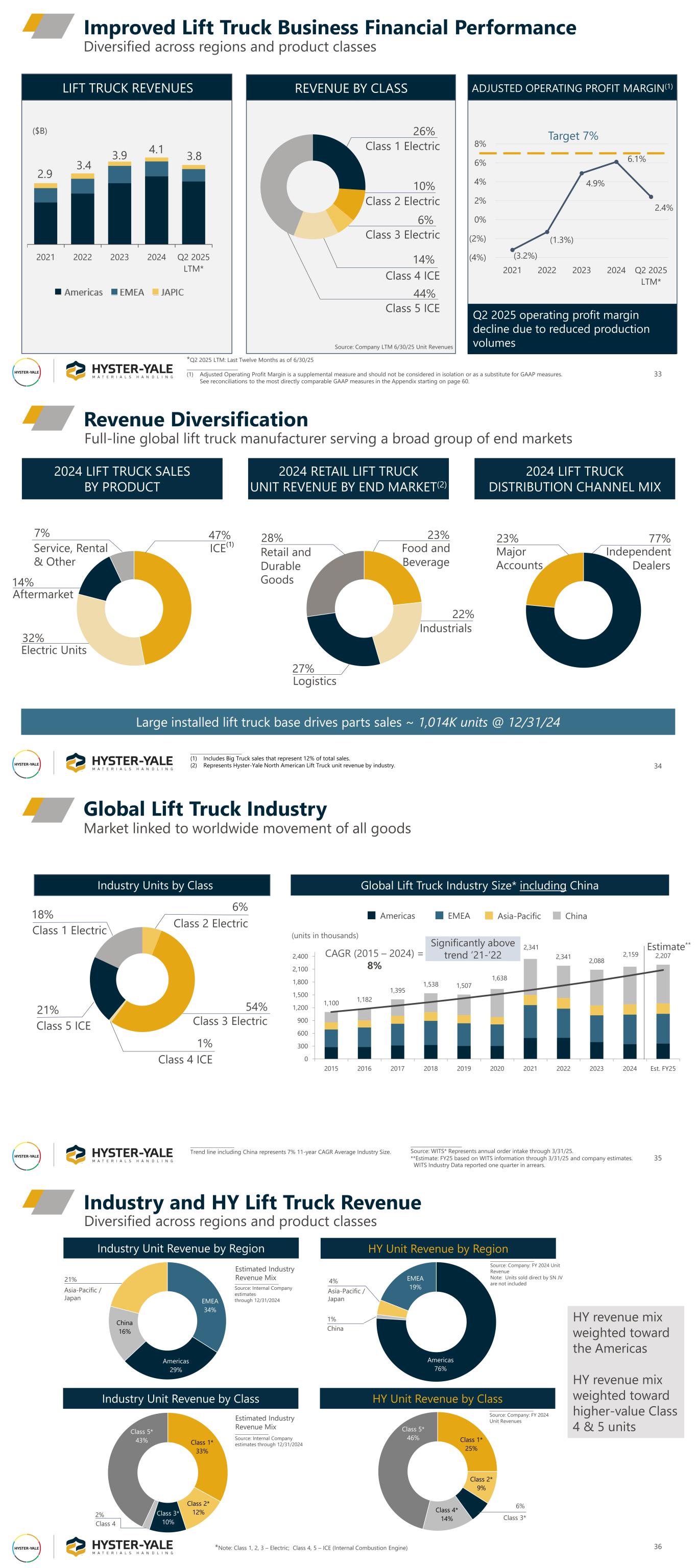 33 Diversified across regions and product classes Improved Lift Truck Business Financial Performance 2.9 3.4 3.9 4.1 3.8 2021 2022 2023 2024 Q2 2025 LTM* LIFT TRUCK REVENUES REVENUE BY CLASS 26% Class 1 Electric 10% Class 2 Electric 6% Class 3 Electric 14% Class 4 ICE Class 5 ICE 44% ADJUSTED OPERATING PROFIT MARGIN(1) (3.2%) (1.3%) 4.9% 6.1% 2.4% (4%) (2%) 0% 2% 4% 6% 8% 2021 2022 2023 2024 Q2 2025 LTM* Target 7% Source: Company LTM 6/30/25 Unit Revenues ($B) *Q2 2025 LTM: Last Twelve Months as of 6/30/25 _____________________ (1) Adjusted Operating Profit Margin is a supplemental measure and should not be considered in isolation or as a substitute for GAAP measures. See reconciliations to the most directly comparable GAAP measures in the Appendix starting on page 60. Q2 2025 operating profit margin decline due to reduced production volumes 22% Industrials Full-line global lift truck manufacturer serving a broad group of end markets 14% Service, Rental & Other Electric Units Aftermarket 7% Independent Dealers 34 Revenue Diversification 2024 LIFT TRUCK SALES BY PRODUCT _____________________ (1) Includes Big Truck sales that represent 12% of total sales. (2) Represents Hyster-Yale North American Lift Truck unit revenue by industry. 2024 RETAIL LIFT TRUCK UNIT REVENUE BY END MARKET(2) (1) 2024 LIFT TRUCK DISTRIBUTION CHANNEL MIX 77%23% Major Accounts Food and Beverage 23%28% Retail and Durable Goods Logistics 27% ICE 47% 32% Large installed lift truck base drives parts sales ~ 1,014K units @ 12/31/24 _____________________ Trend line including China represents 7% 11-year CAGR Average Industry Size. Market linked to worldwide movement of all goods Global Lift Truck Industry 35 _____________________ Source: WITS* Represents annual order intake through 3/31/25. **Estimate: FY25 based on WITS information through 3/31/25 and company estimates. WITS Industry Data reported one quarter in arrears. Industry Units by Class 18% Class 1 Electric 6% Class 2 Electric 54% Class 3 Electric 1% Class 4 ICE Class 5 ICE 21% 1,100 1,182 1,395 1,538 1,507 1,638 2,341 2,341 2,088 2,159 2,207 0 300 600 900 1,200 1,500 1,800 2,100 2,400 2015 2016 2017 2018 2019 2020 2021 2022 2023 2024 Est. FY25 CAGR (2015 – 2024) = 8% Global Lift Truck Industry Size* including China Significantly above trend ’21-’22 (units in thousands) Americas EMEA Asia-Pacific China Estimate** Diversified across regions and product classes Industry and HY Lift Truck Revenue 36*Note: Class 1, 2, 3 – Electric; Class 4, 5 – ICE (Internal Combustion Engine) Class 1* 33% Class 2* 12%Class 3* 10% Class 5* 43% ________________ Source: Internal Company estimates through 12/31/2024 Estimated Industry Revenue Mix Industry Unit Revenue by Class Class 4 2% Class 1* 25% Class 2* 9% Class 4* 14% Class 5* 46% HY Unit Revenue by Class _____________________ Source: Company: FY 2024 Unit Revenues 6% Class 3* HY Unit Revenue by Region Americas 76% EMEA 19% _____________________ Source: Company: FY 2024 Unit Revenue Note: Units sold direct by SN JV are not included China 1% 4% Asia-Pacific / JapanEMEA 34% Americas 29% China 16% _____________________ Source: Internal Company estimates through 12/31/2024 Estimated Industry Revenue Mix Industry Unit Revenue by Region 21% Asia-Pacific / Japan HY revenue mix weighted toward the Americas HY revenue mix weighted toward higher-value Class 4 & 5 units