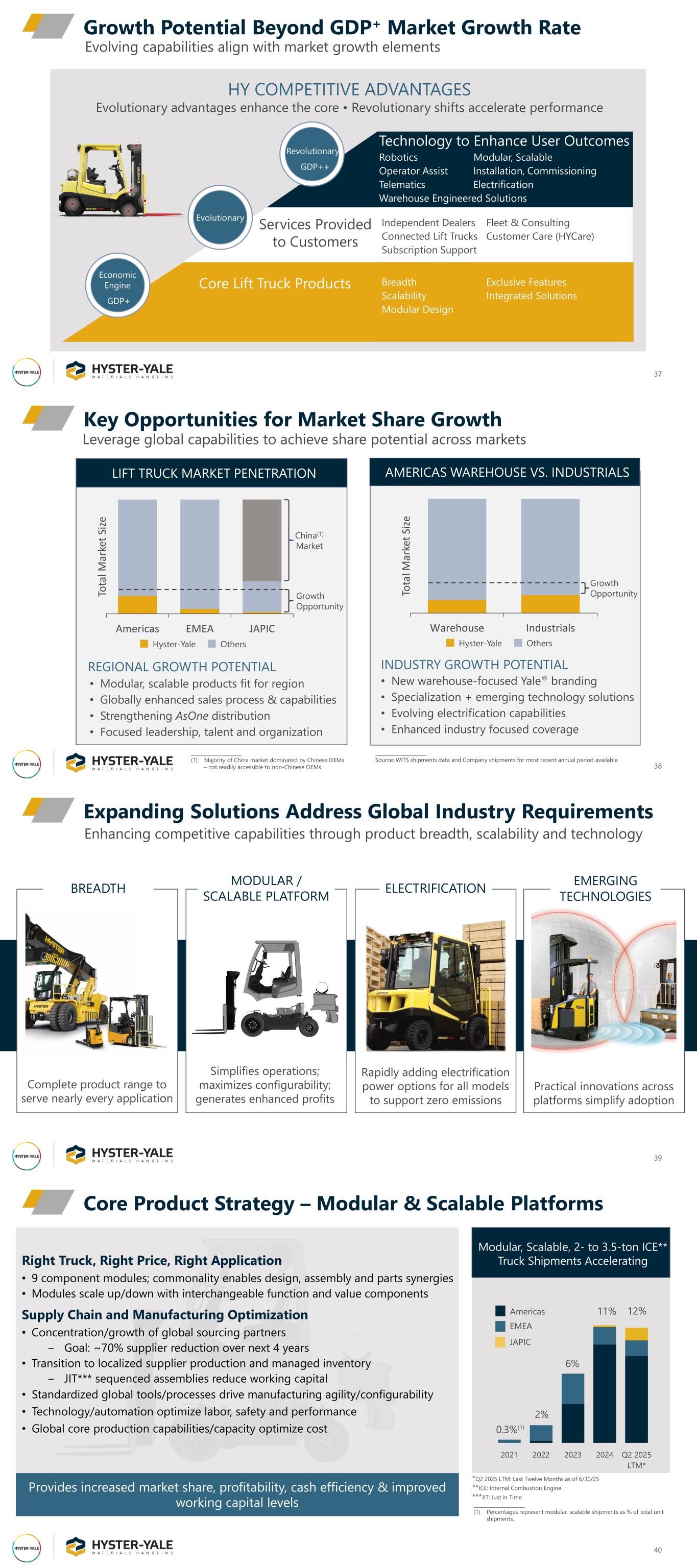 37 Growth Potential Beyond GDP+ Market Growth Rate Robotics Modular, Scalable Operator Assist Installation, Commissioning Telematics Electrification Warehouse Engineered Solutions Independent Dealers Fleet & Consulting Connected Lift Trucks Customer Care (HYCare) Subscription Support Breadth Exclusive Features Scalability Integrated Solutions Modular Design HY COMPETITIVE ADVANTAGES Evolutionary advantages enhance the core • Revolutionary shifts accelerate performance Evolving capabilities align with market growth elements Lift Trucks (Core Products) Economic Engine GDP+ Revolutionary GDP++ Core Lift Truck Products Technology to Enhance User Outcomes Services Provided to Customers Evolutionary LIFT TRUCK MARKET PENETRATION Americas EMEA JAPIC To ta l M ar ke t S ize AMERICAS WAREHOUSE VS. INDUSTRIALS Key Opportunities for Market Share Growth 38 Growth Opportunity • Modular, scalable products fit for region • Globally enhanced sales process & capabilities • Strengthening AsOne distribution • Focused leadership, talent and organization REGIONAL GROWTH POTENTIAL • New warehouse-focused Yale® branding • Specialization + emerging technology solutions • Evolving electrification capabilities • Enhanced industry focused coverage INDUSTRY GROWTH POTENTIAL Warehouse Industrials To ta l M ar ke t S ize Hyster-Yale Others Hyster-Yale Others Leverage global capabilities to achieve share potential across markets _____________________ (1) Majority of China market dominated by Chinese OEMs – not readily accessible to non-Chinese OEMs China(1) Market Growth Opportunity _____________________ Source: WITS shipments data and Company shipments for most recent annual period available 39 Expanding Solutions Address Global Industry Requirements Enhancing competitive capabilities through product breadth, scalability and technology MODULAR / SCALABLE PLATFORMBREADTH Simplifies operations; maximizes configurability; generates enhanced profits Complete product range to serve nearly every application EMERGING TECHNOLOGIES Practical innovations across platforms simplify adoption Image ELECTRIFICATION Rapidly adding electrification power options for all models to support zero emissions 2021 2022 2023 2024 Q2 2025 LTM* Americas EMEA JAPIC 12% 0.3%(1) 2% 6% 11% Right Truck, Right Price, Right Application • 9 component modules; commonality enables design, assembly and parts synergies • Modules scale up/down with interchangeable function and value components Supply Chain and Manufacturing Optimization • Concentration/growth of global sourcing partners ‒ Goal: ~70% supplier reduction over next 4 years • Transition to localized supplier production and managed inventory ‒ JIT*** sequenced assemblies reduce working capital • Standardized global tools/processes drive manufacturing agility/configurability • Technology/automation optimize labor, safety and performance • Global core production capabilities/capacity optimize cost Core Product Strategy – Modular & Scalable Platforms 40 _____________________ (1) Percentages represent modular, scalable shipments as % of total unit shipments. *Q2 2025 LTM: Last Twelve Months as of 6/30/25 **ICE: Internal Combustion Engine ***JIT: Just in Time Modular, Scalable, 2- to 3.5-ton ICE** Truck Shipments Accelerating Provides increased market share, profitability, cash efficiency & improved working capital levels